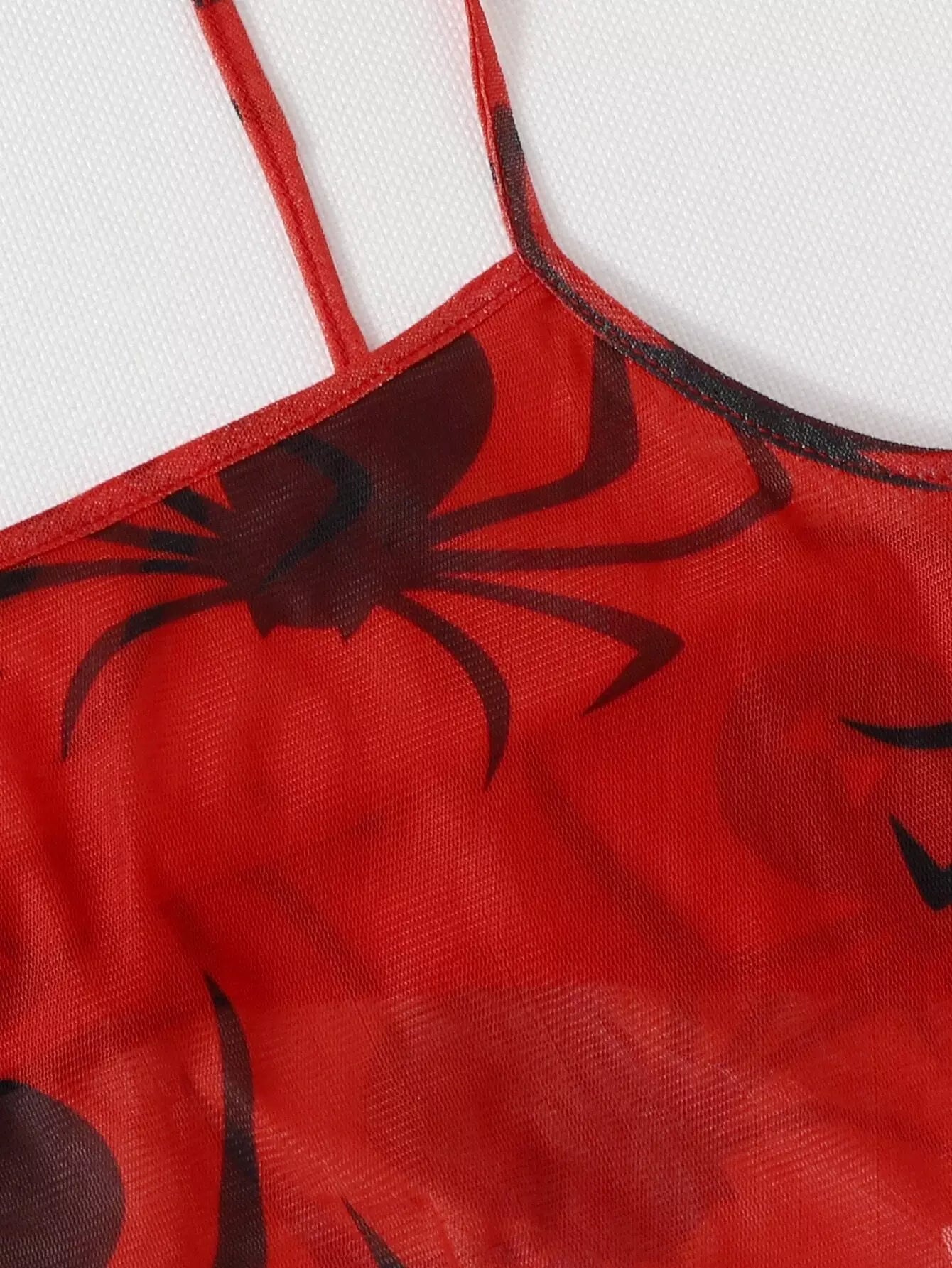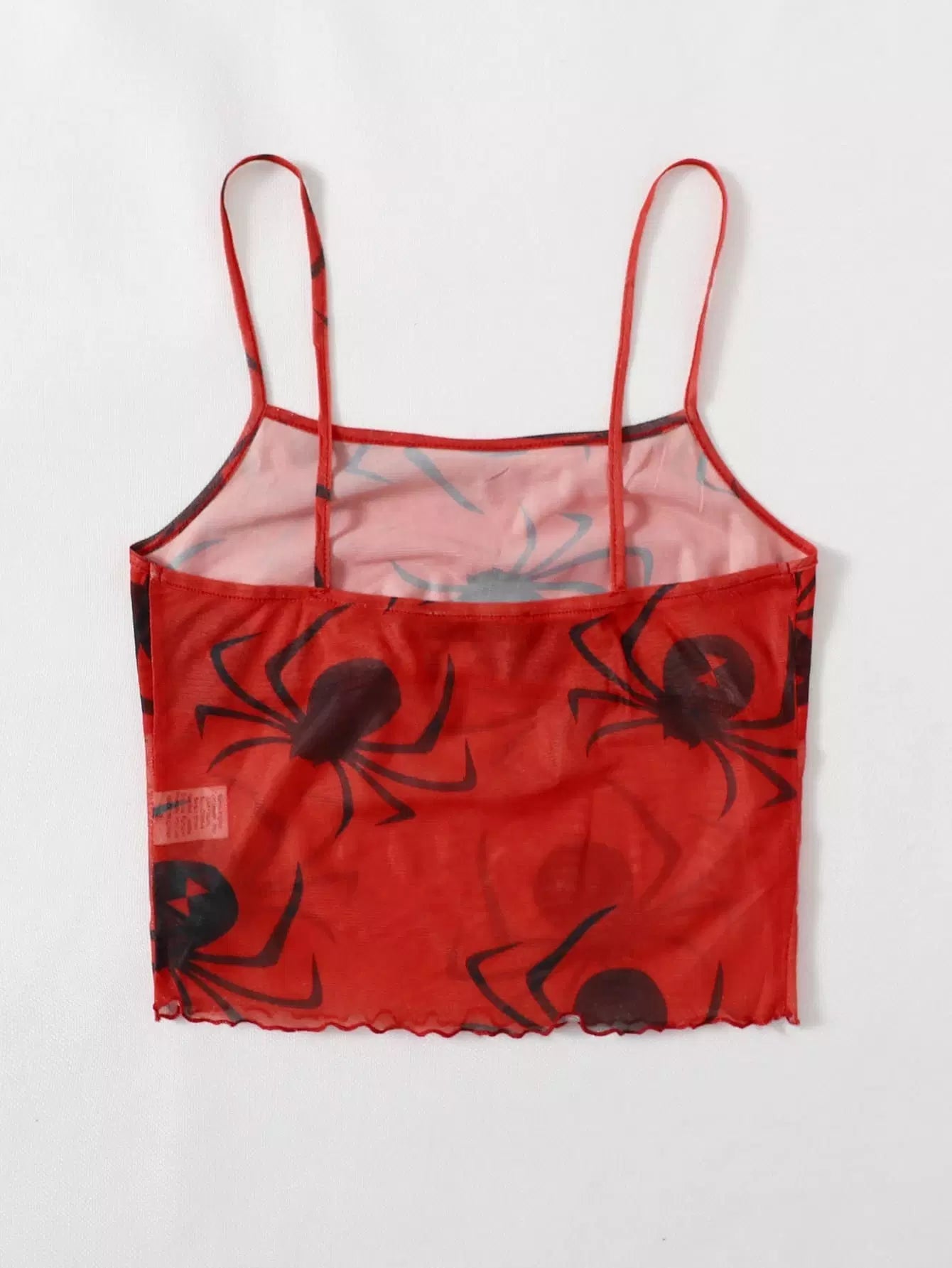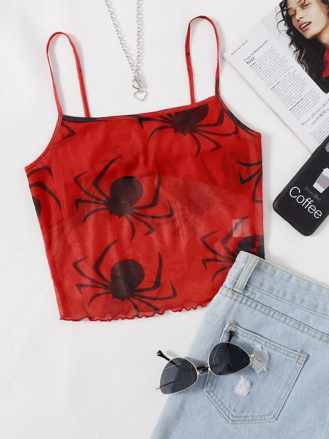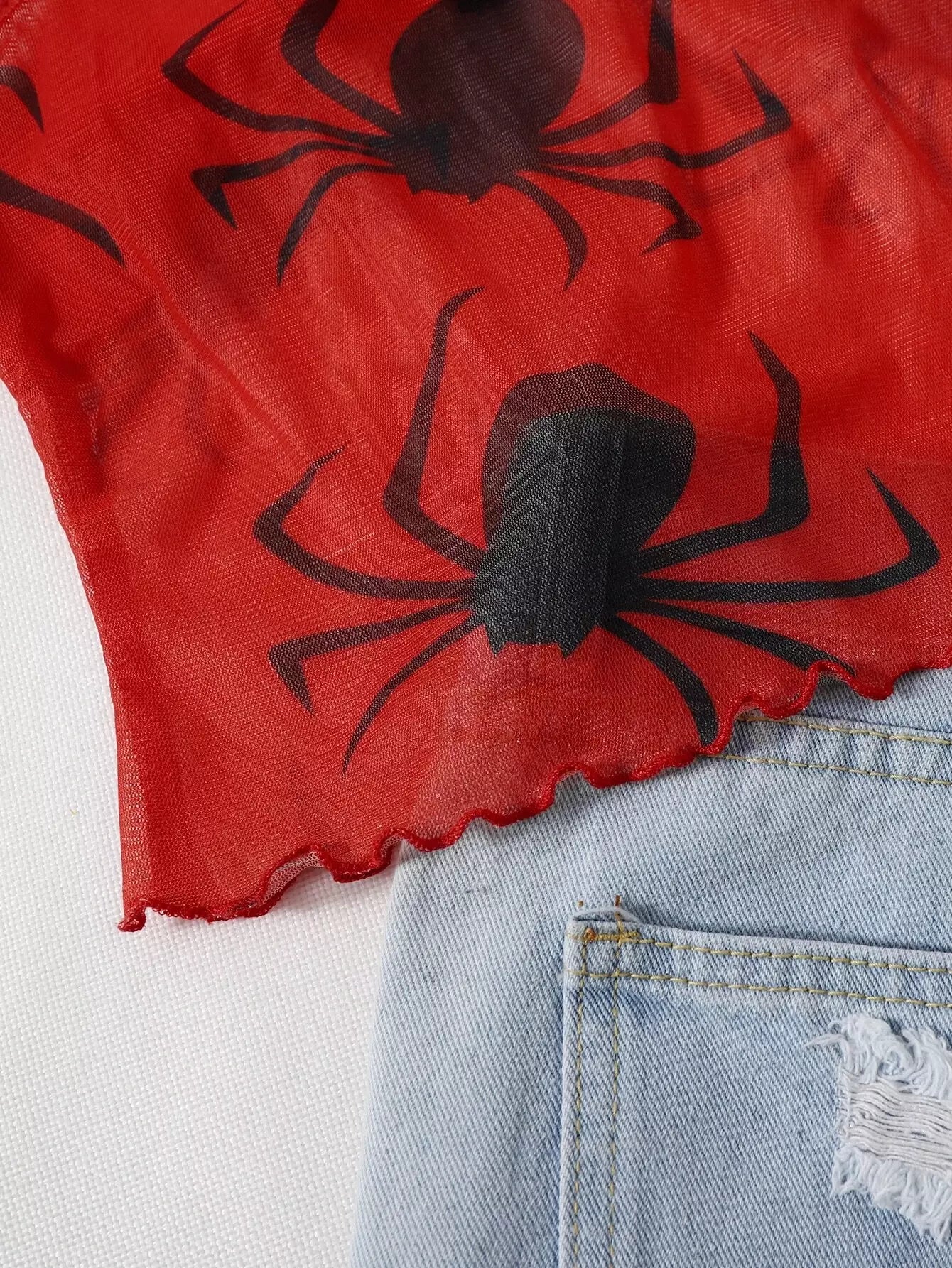 قميص قصير بنقشة عنكبوت بطبعة عنكبوت بحواف شبكية من نسيج شبكي
