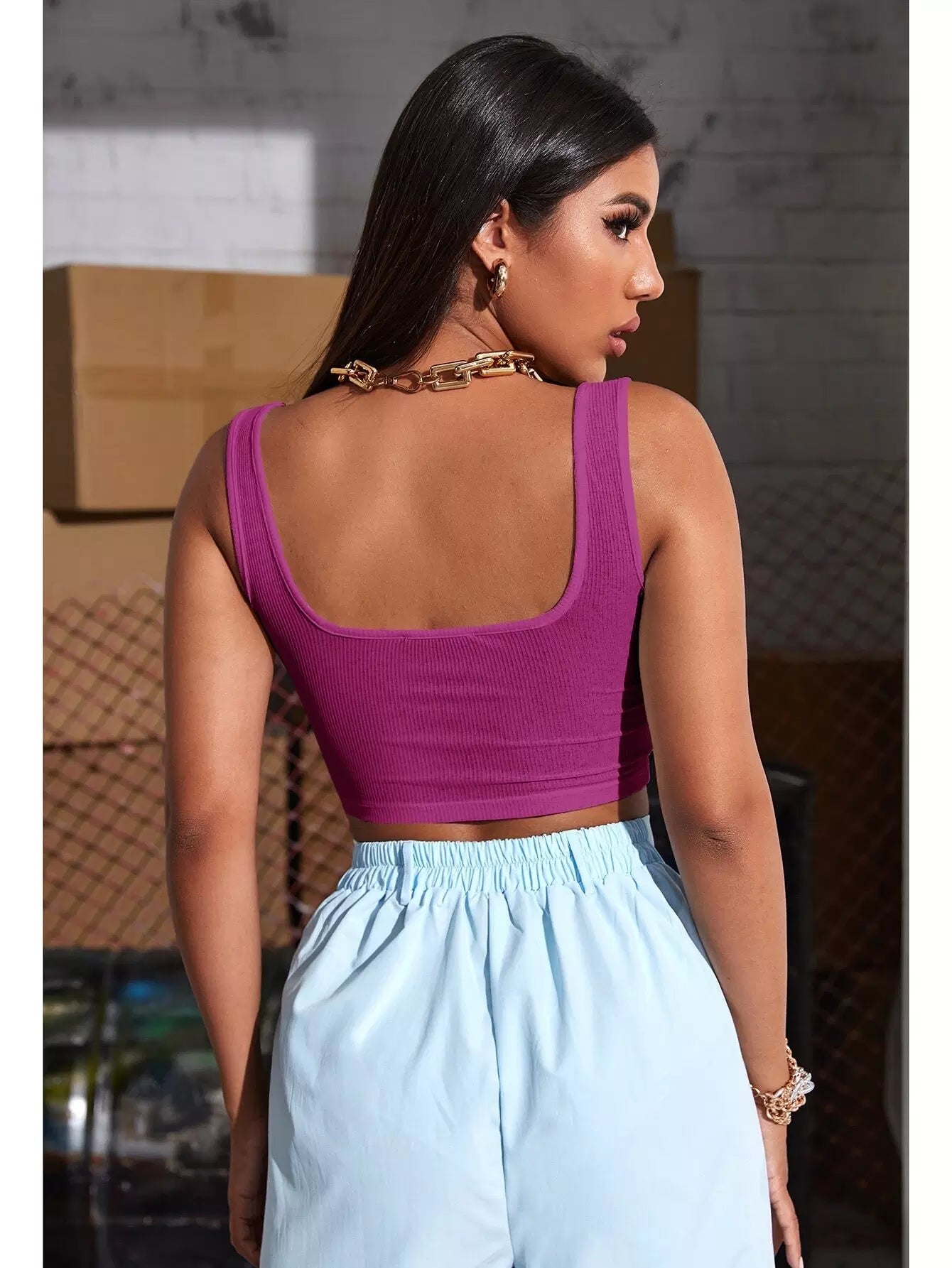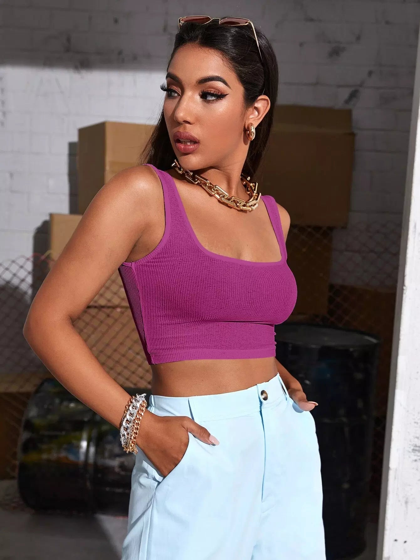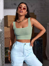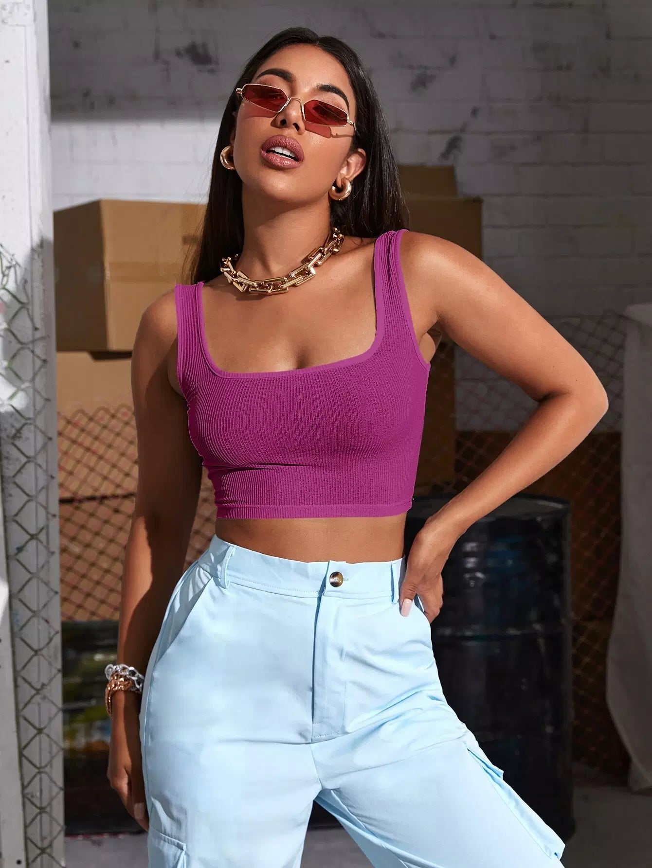 تانك قصير برقبة مربعة ومحبوكة على شكل ضلع مربع