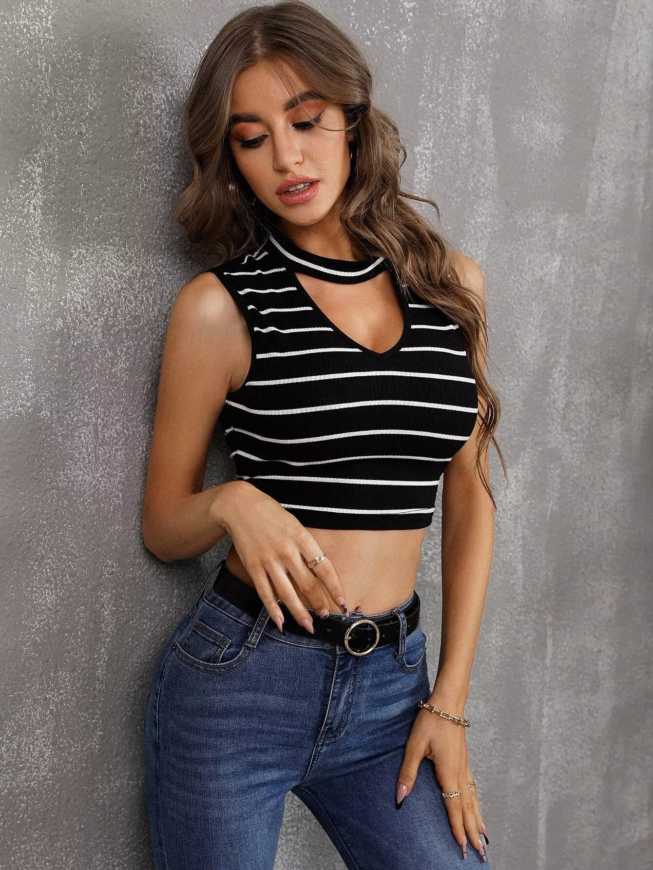 تانك توب مخطط بفتحة رقبة على شكل ثقب