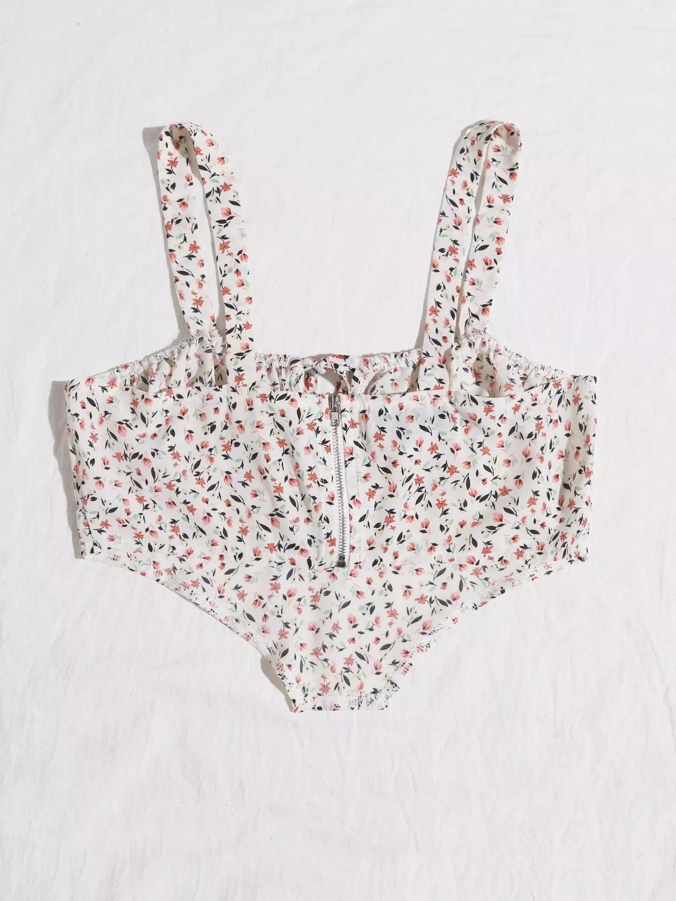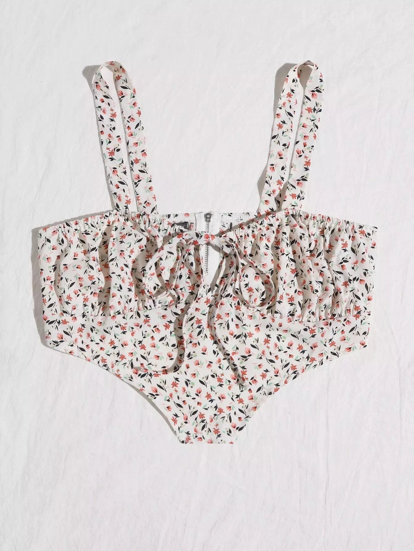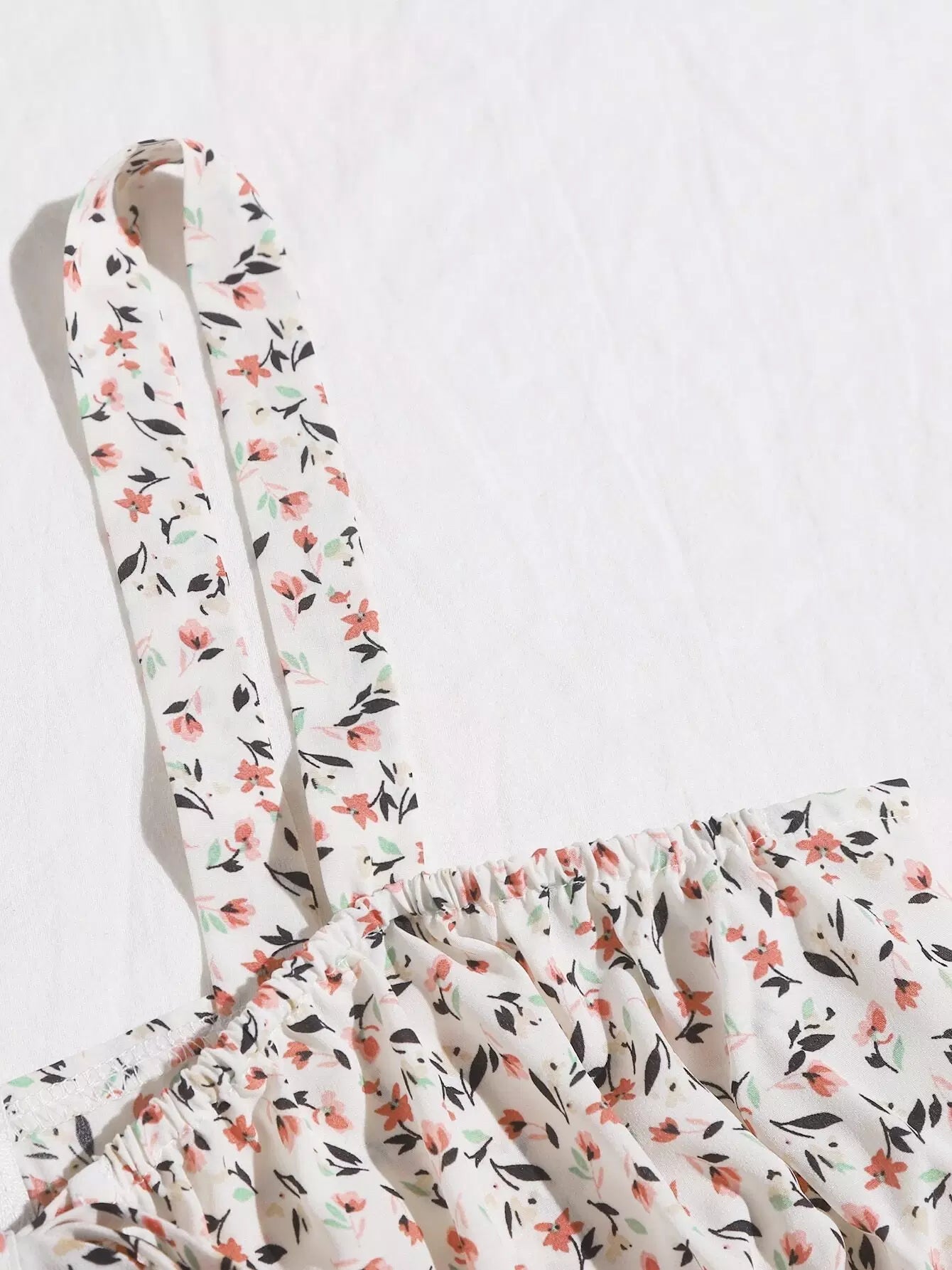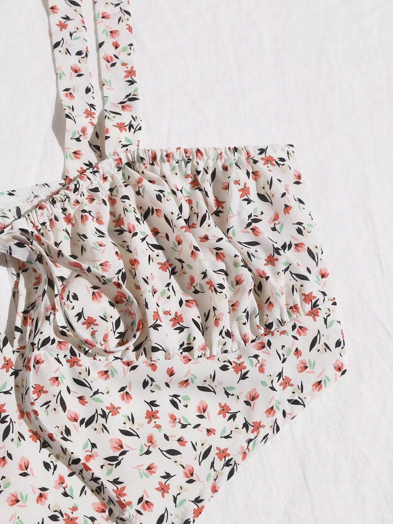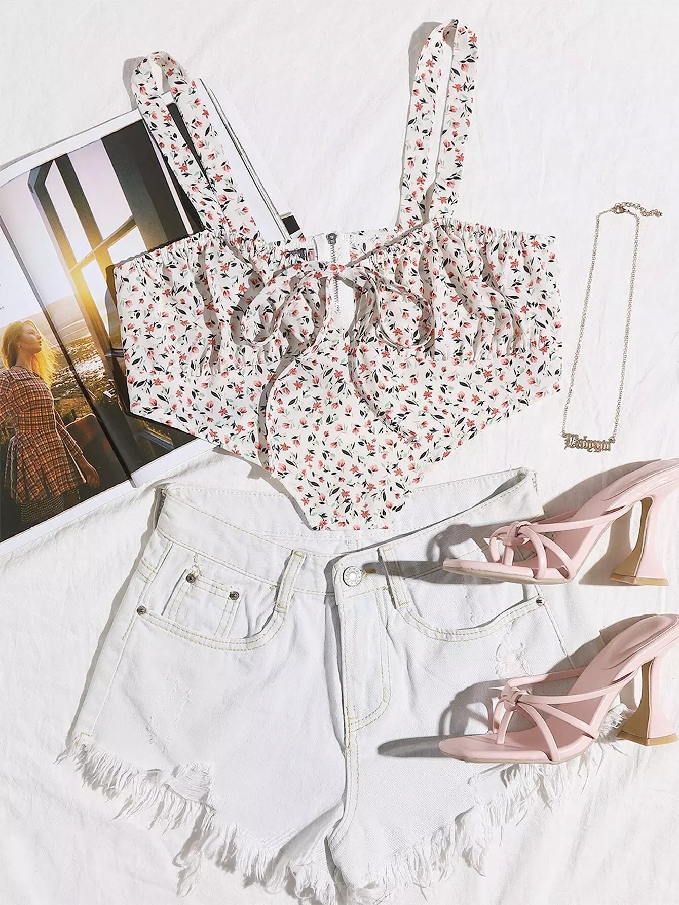 قميص قصير مزين برباط أمامي مكشكش من الأمام بطبعة زهور