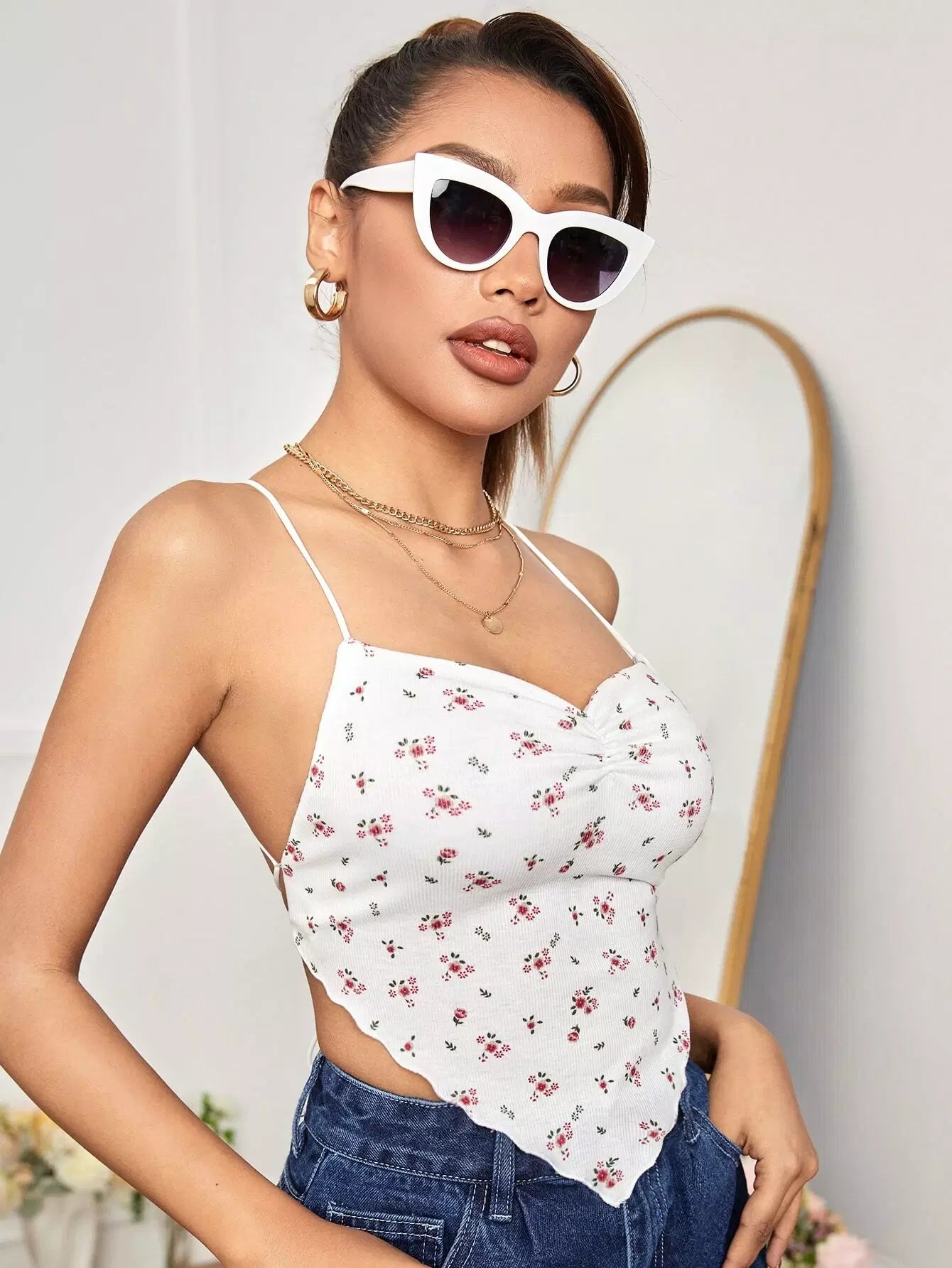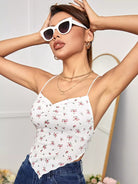 بلوزة كامي مزينة بنقشة الزهور الصغيرة مع رباط خلفي وحاشية منديل أمامية مكشكشة