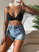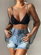 Allurite Sheer Fishnet Metallic Top,Ladies Party Sheer Drop Shoulder Round Neck Regular Fit Black Plain