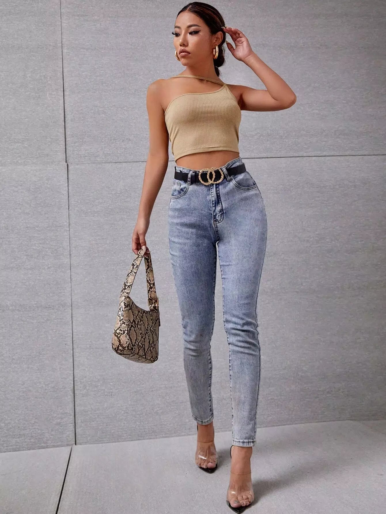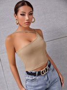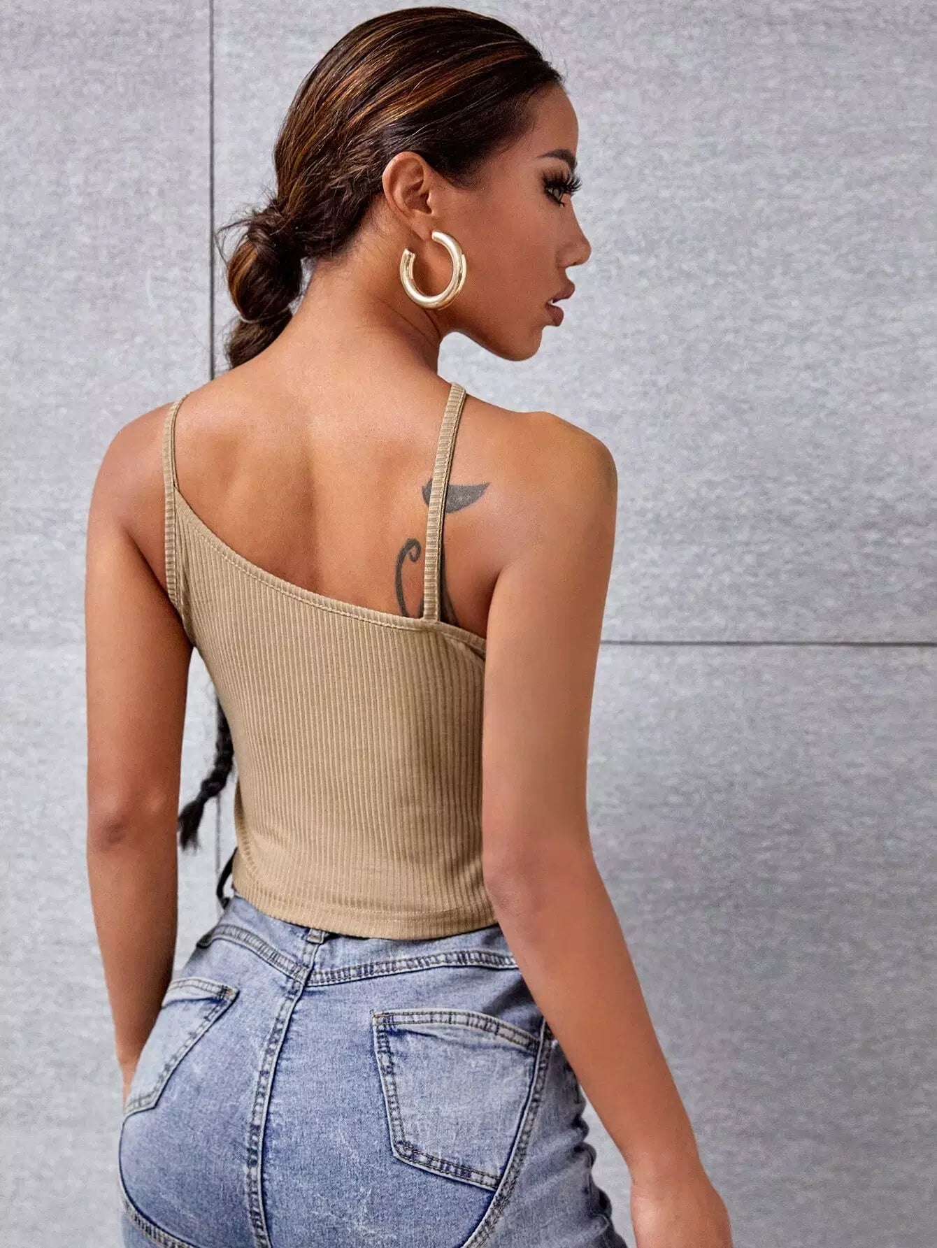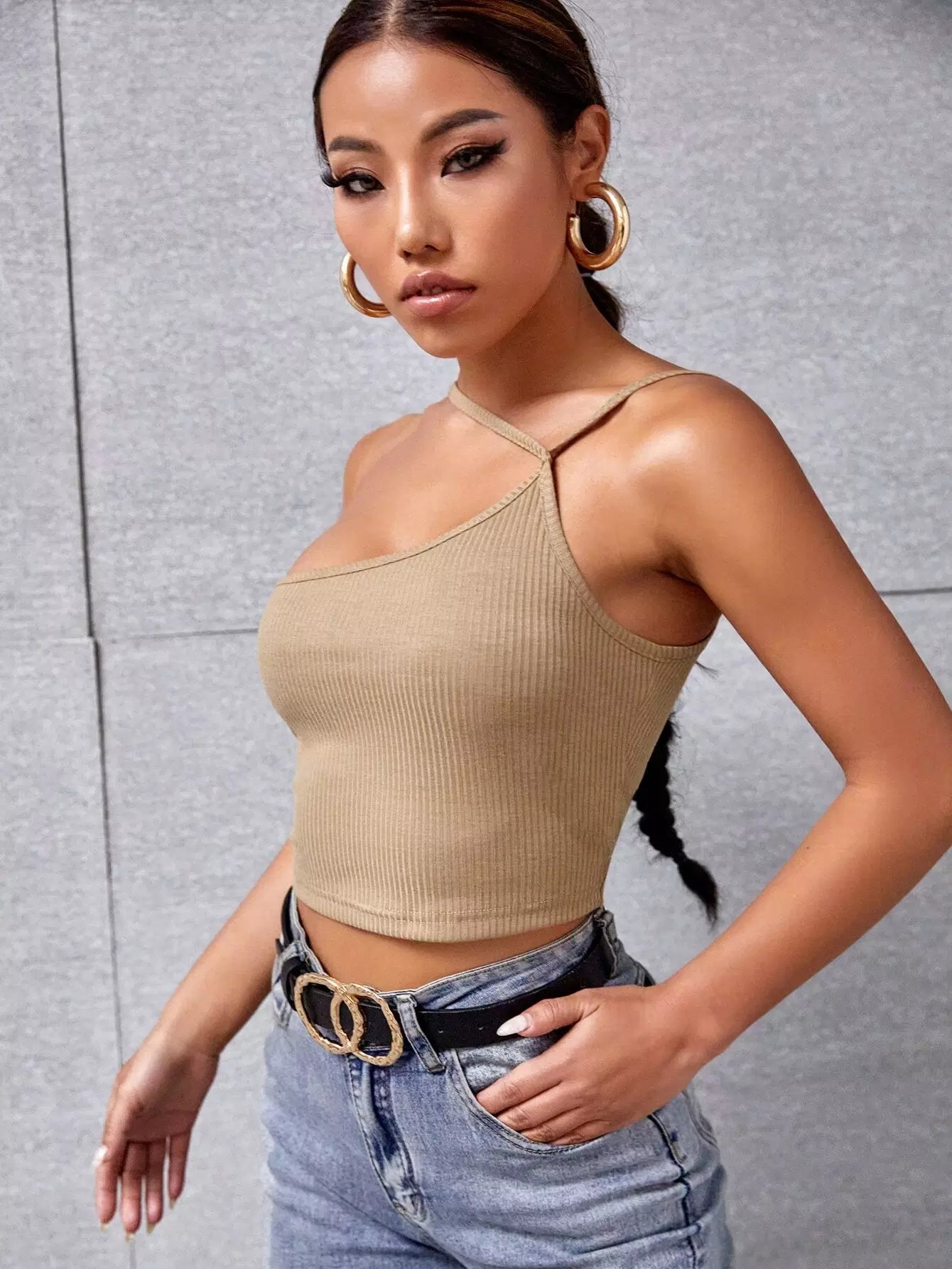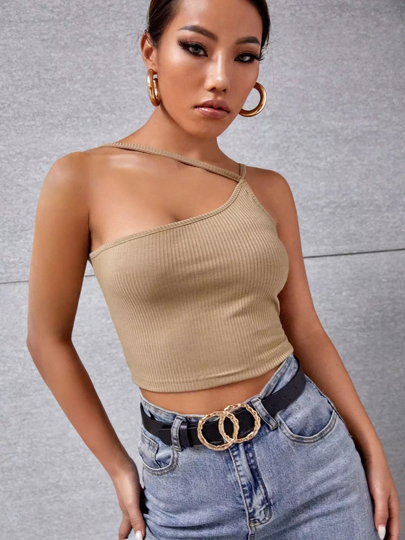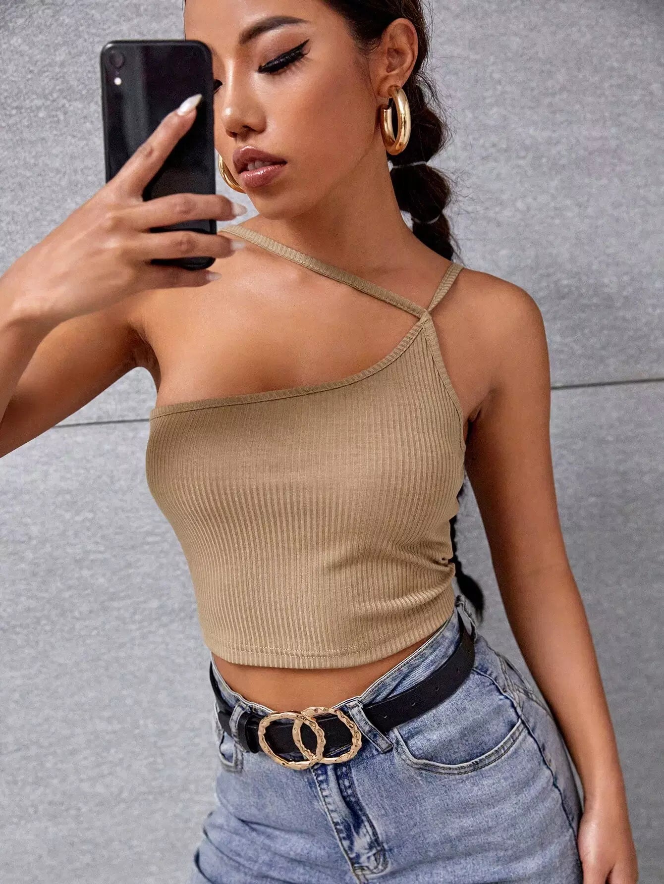 بلوزة قصيرة مضلعة برقبة غير متماثلة مضلعة برقبة غير متماثلة