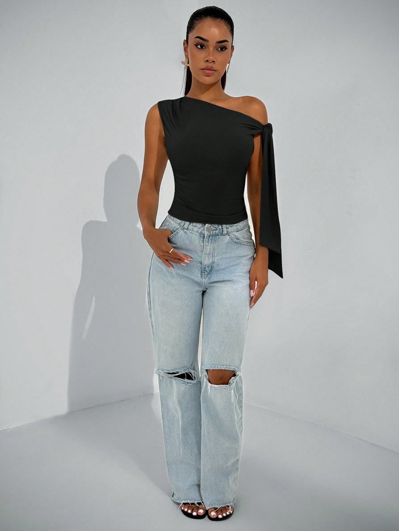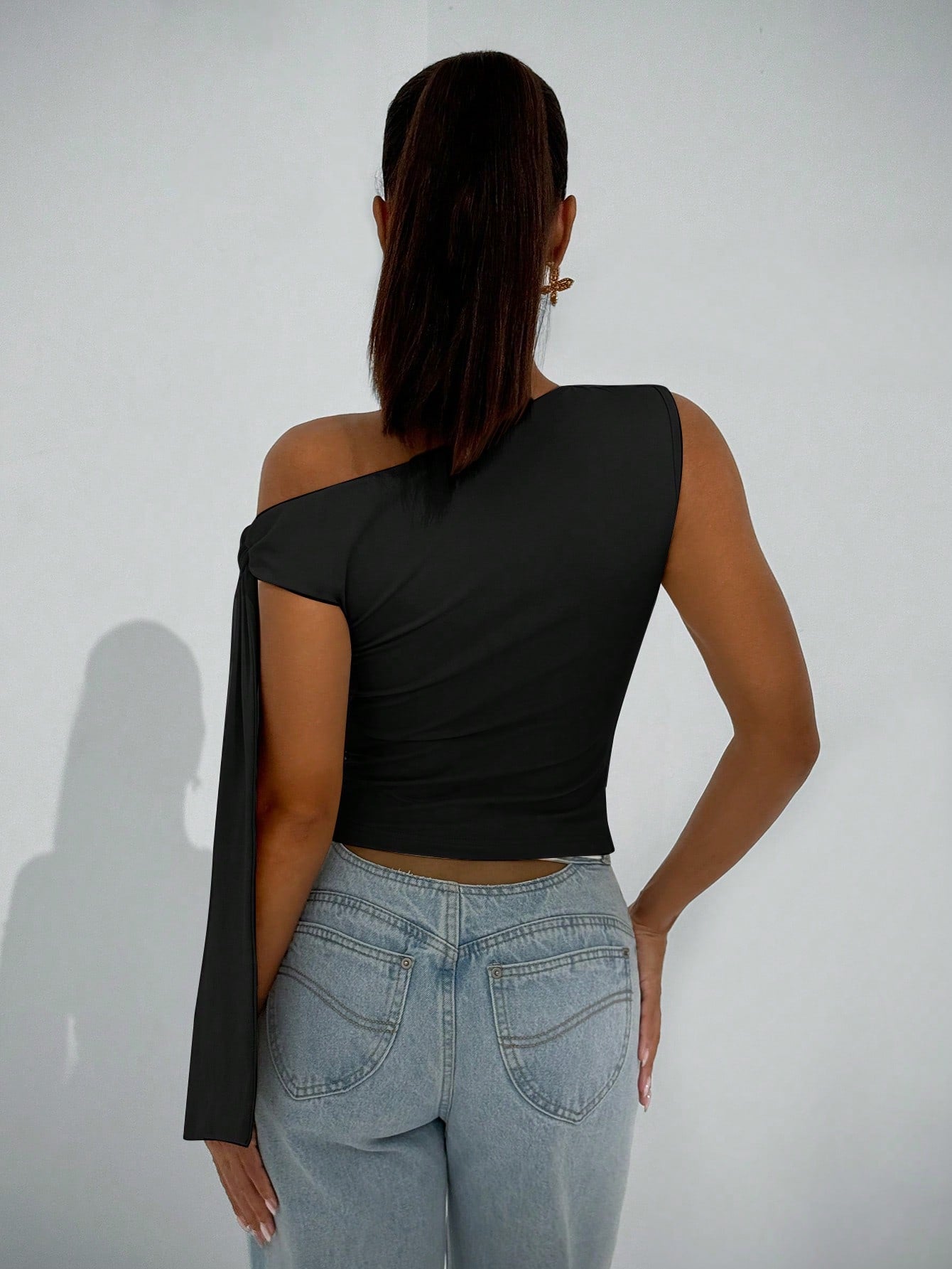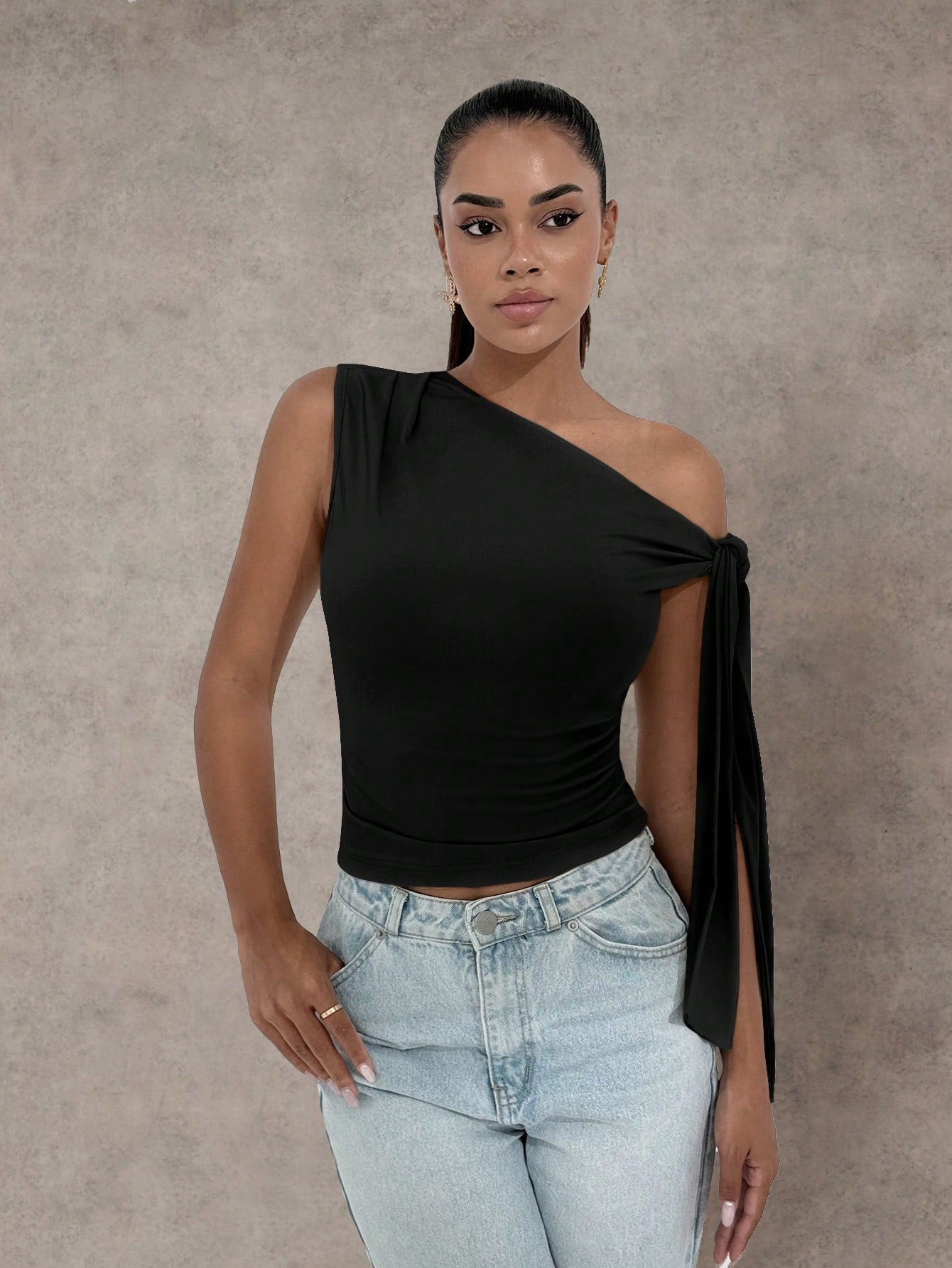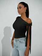بلوزة نسائية أنيقة من BAE Autumn بياقة غير متماثلة وكتف مائل برباط، مناسبة للارتداء اليومي والمواعيد
