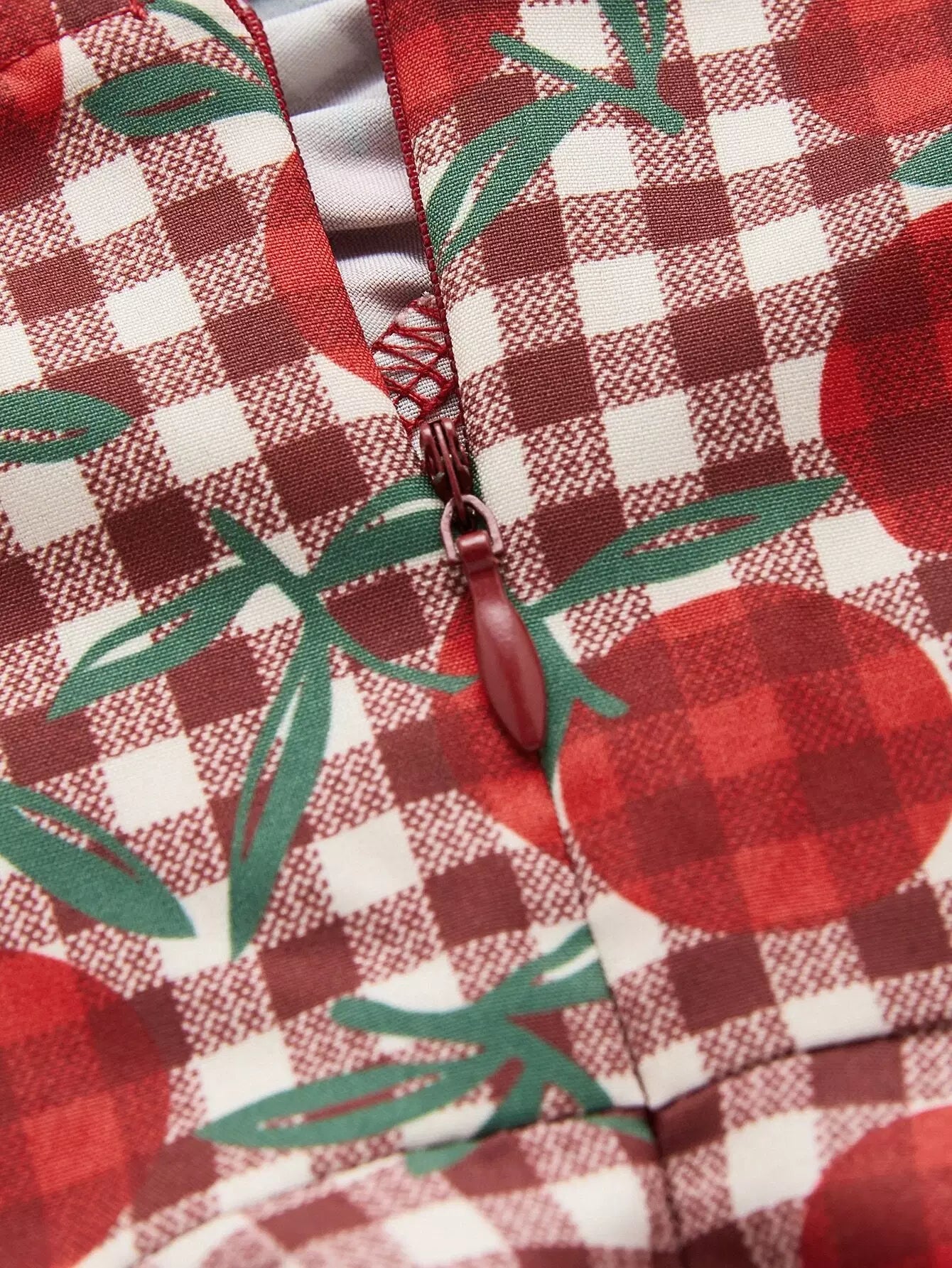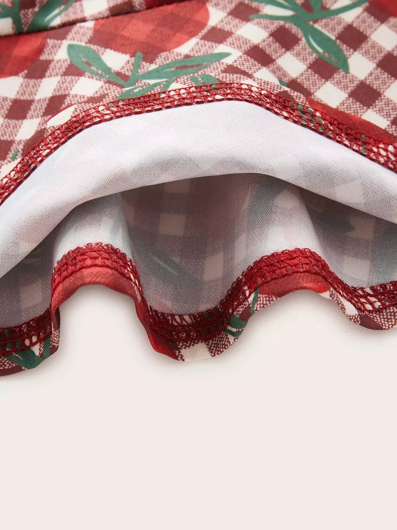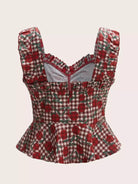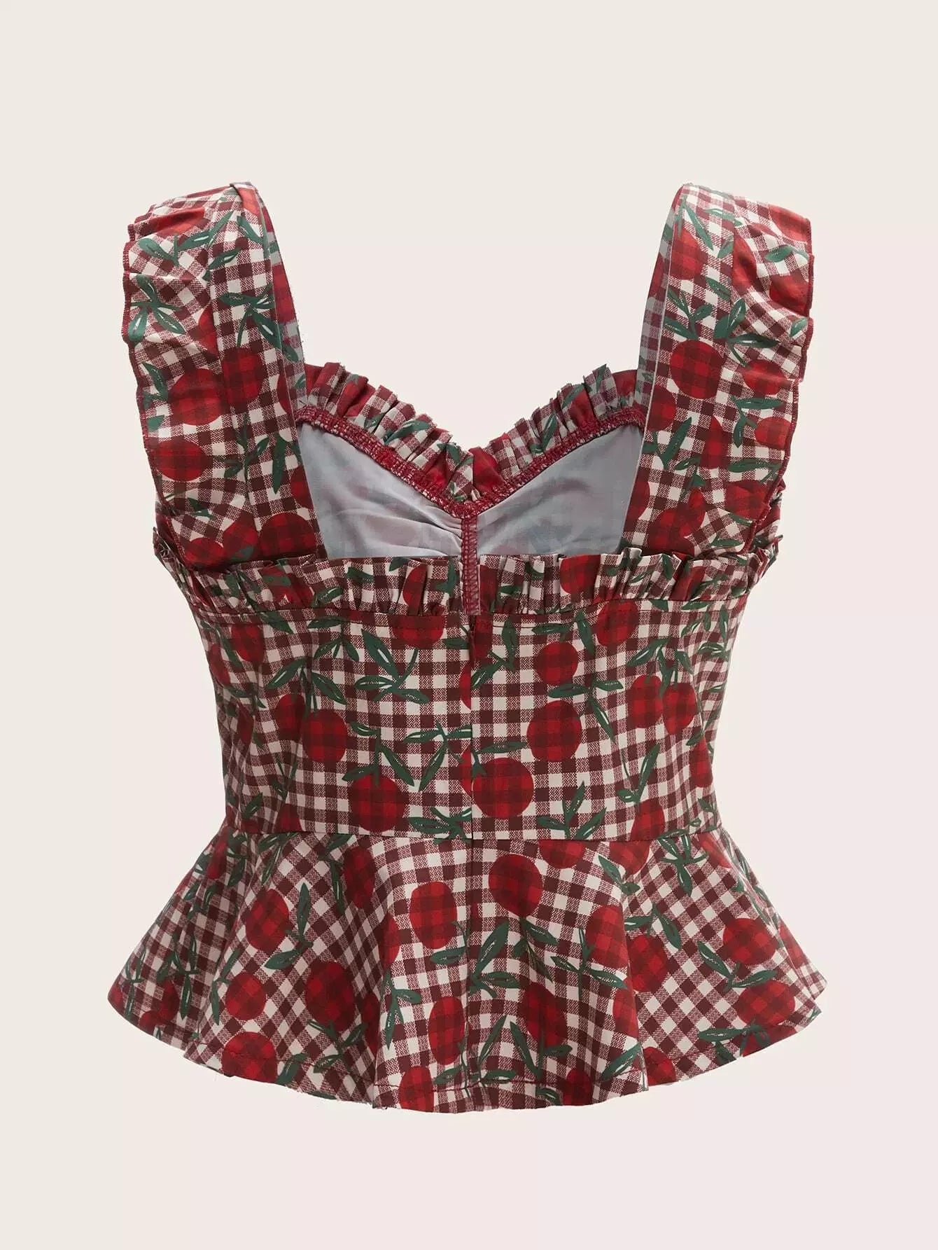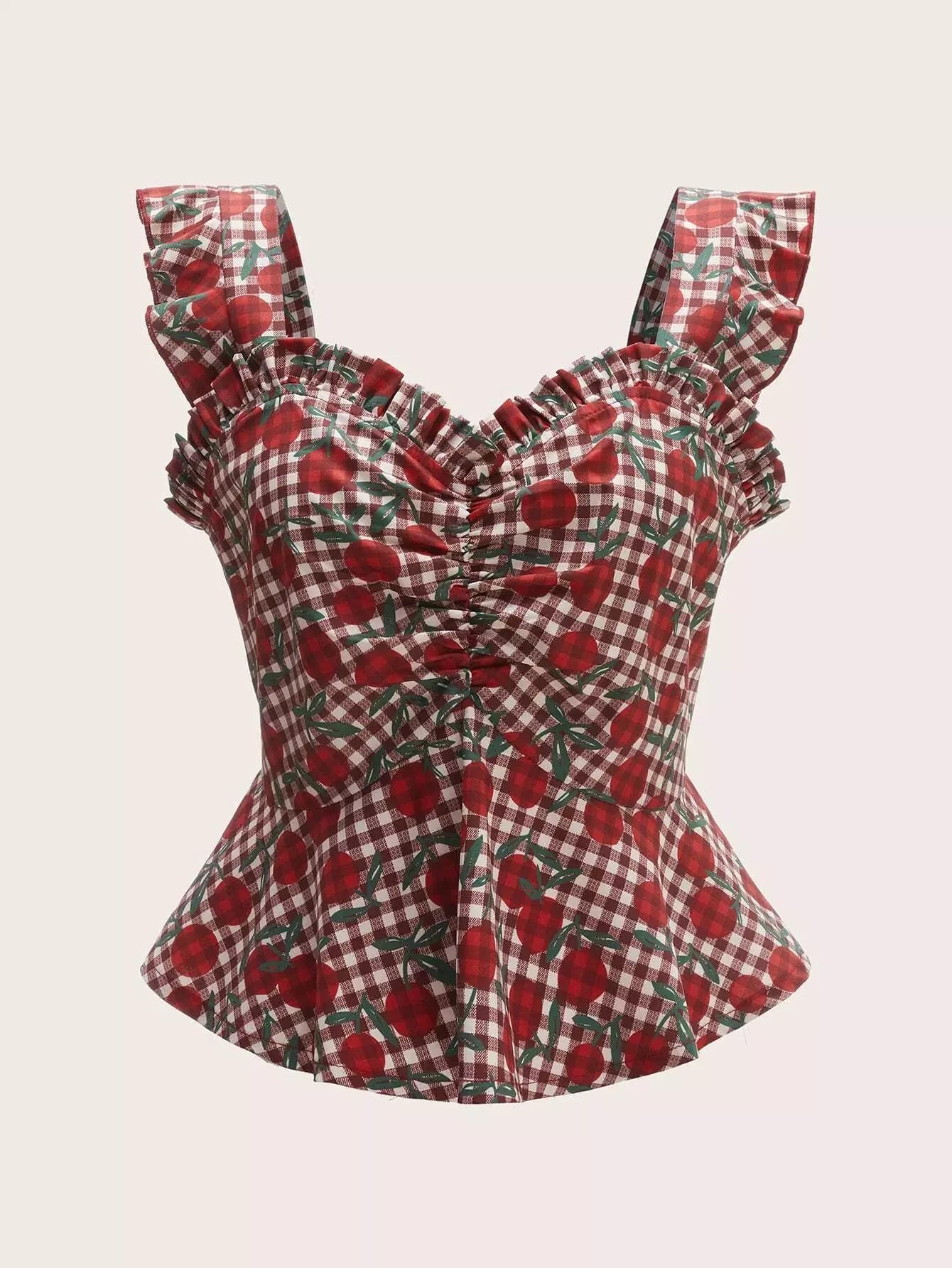 النساء - بلوزة ذات حواف مكشكشة بلون الكرز والجنجهام
