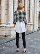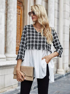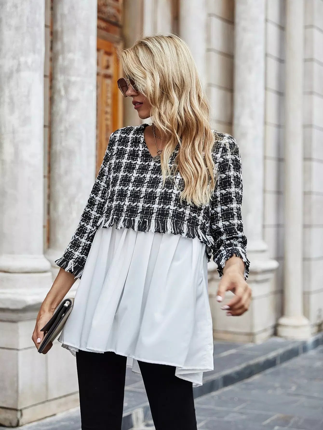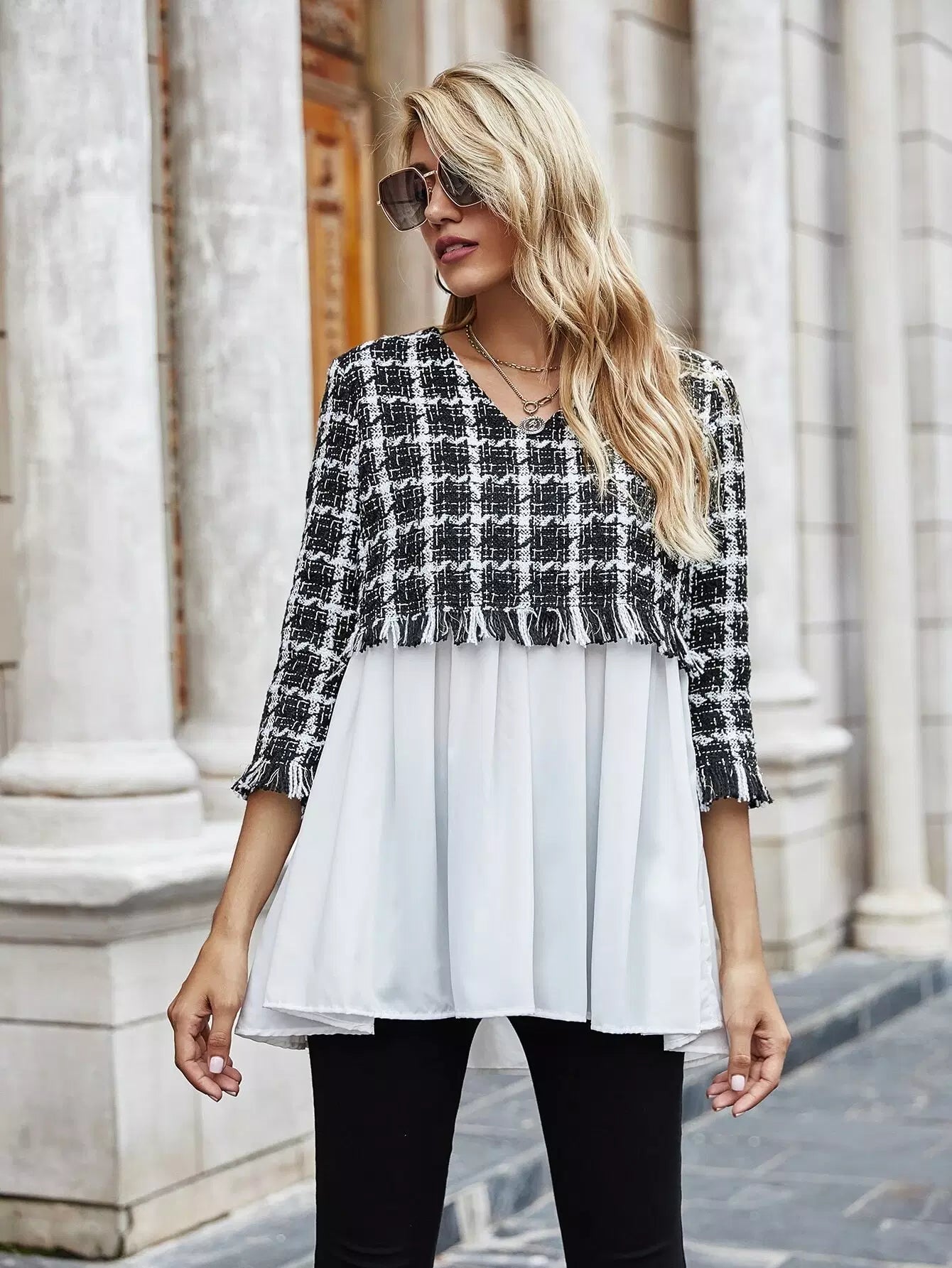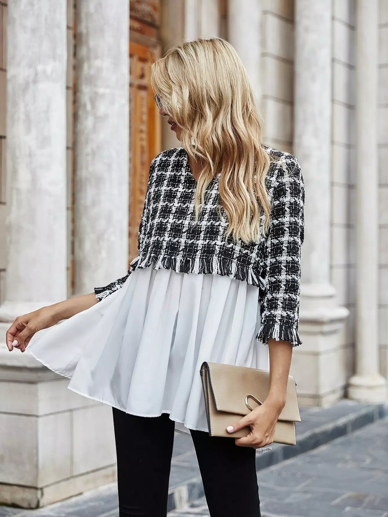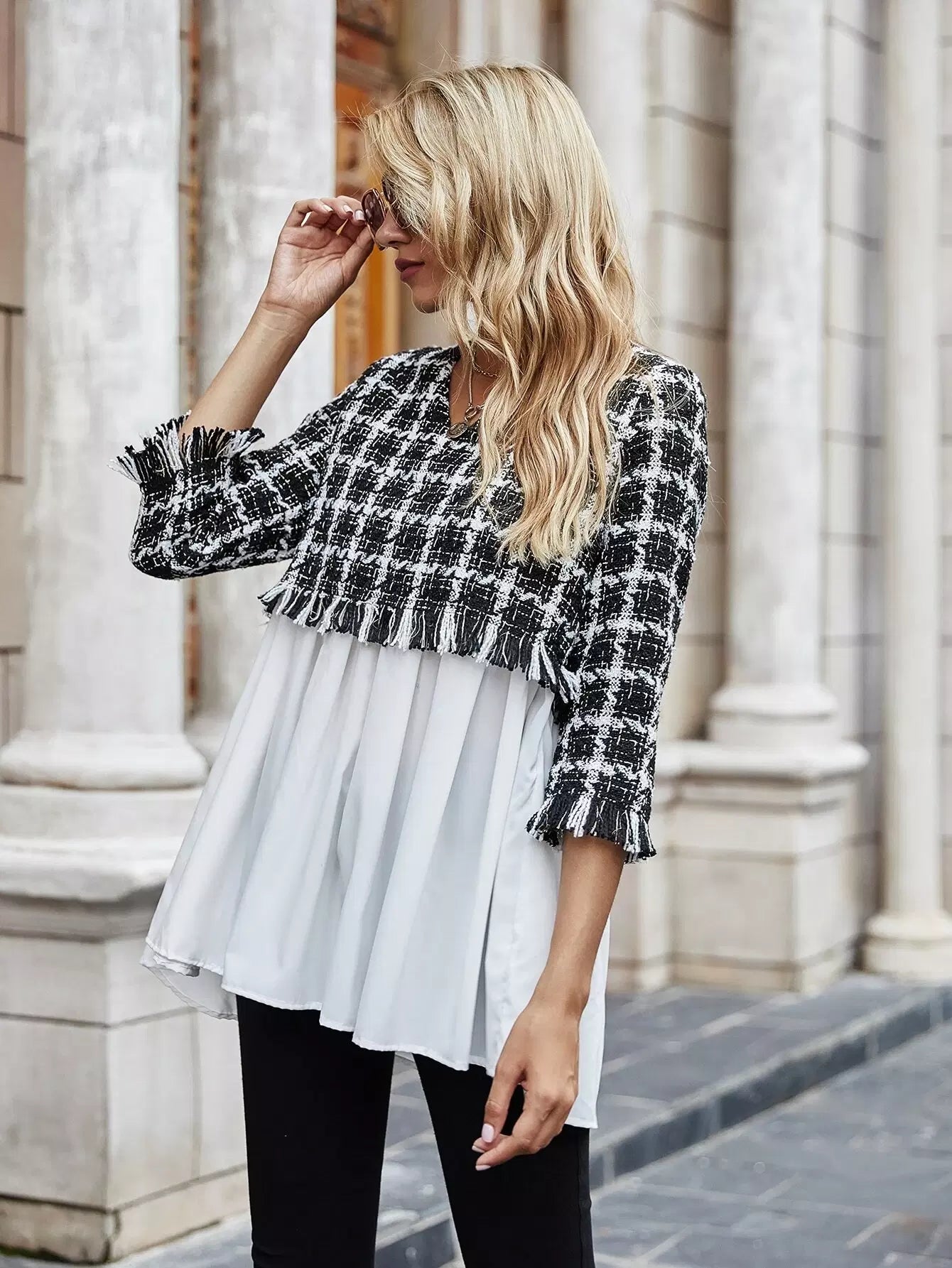 بلوزة من قماش تويد منقوش بلون متباين مع حواف غير مزخرفة