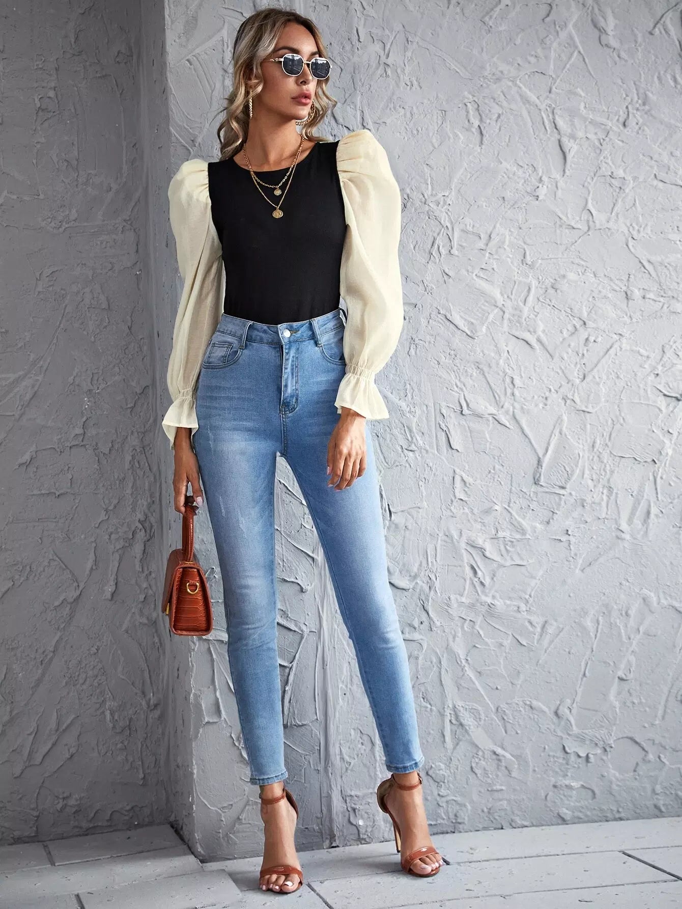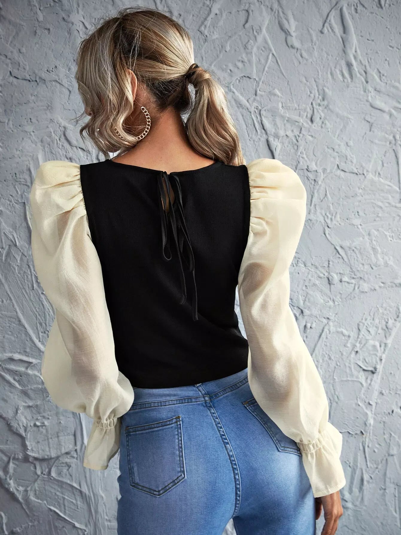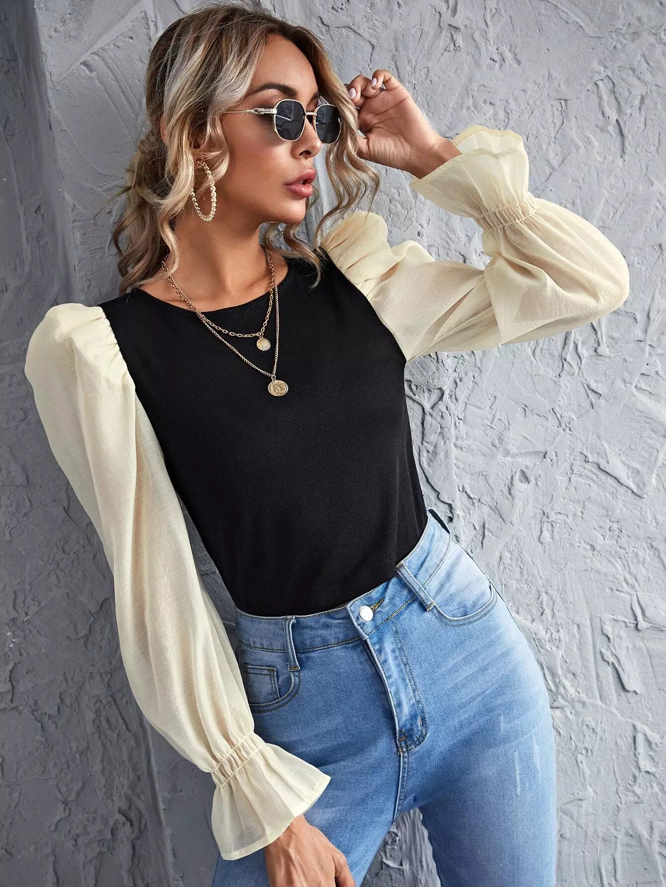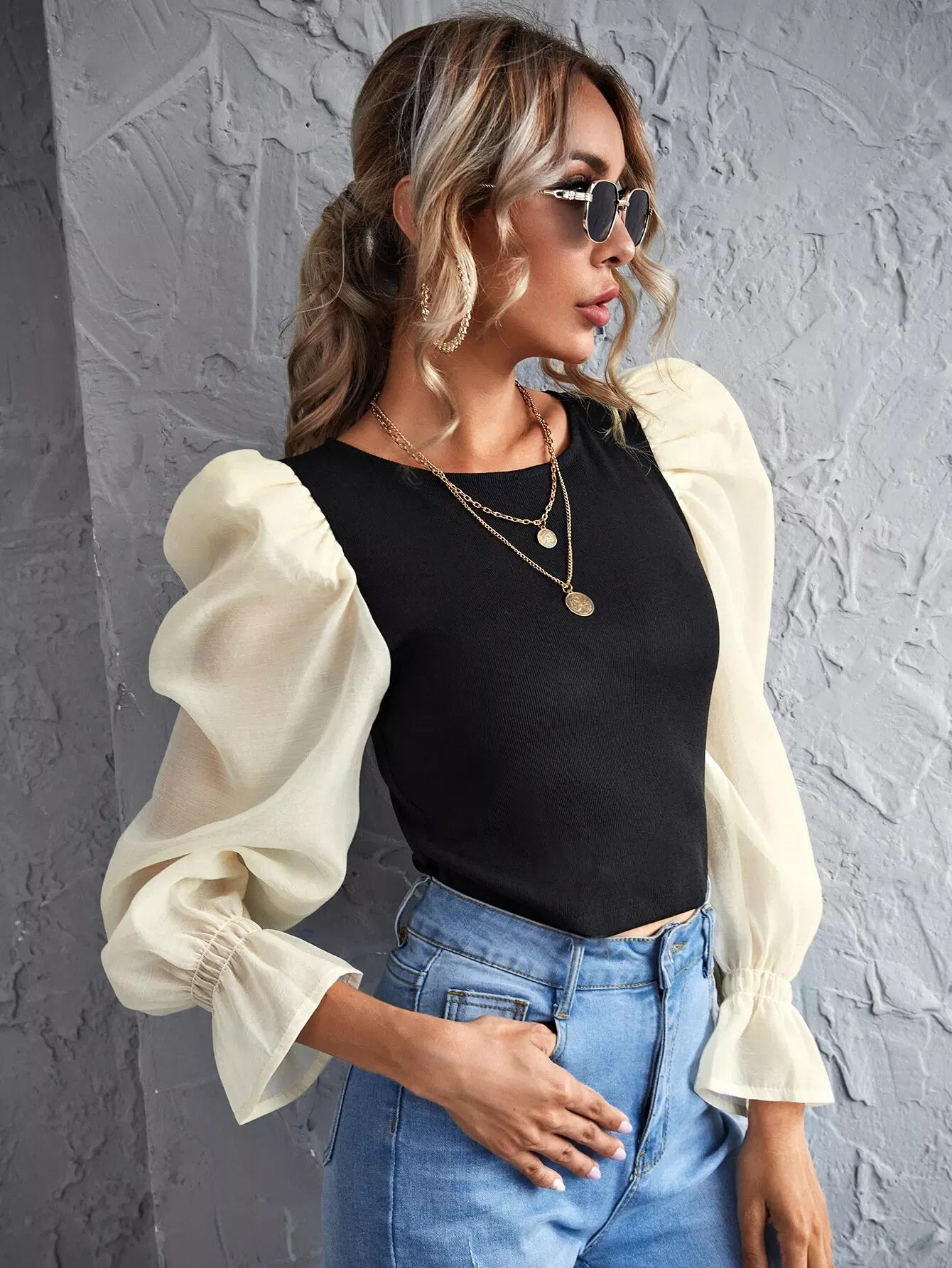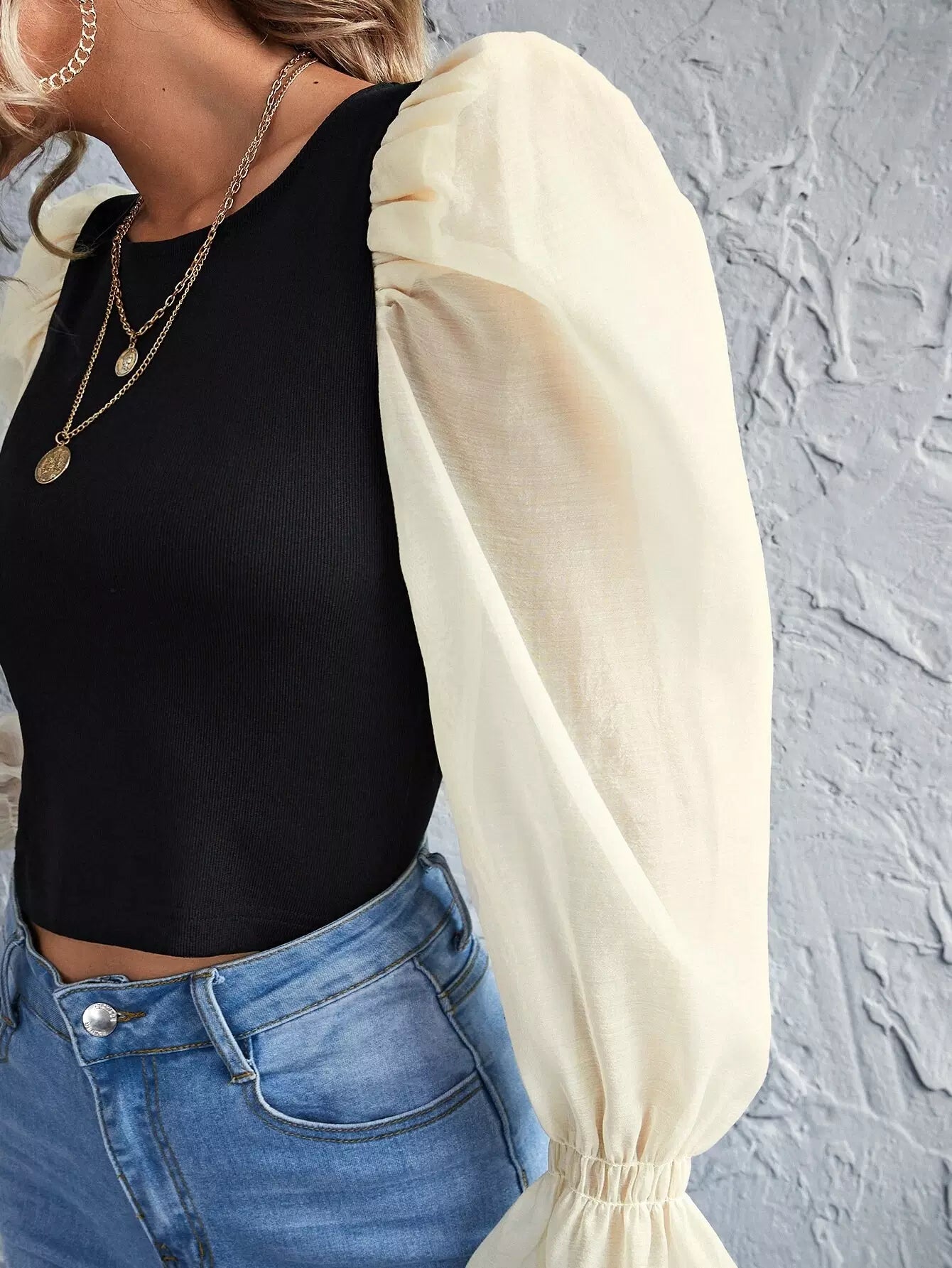 بلوزة قصيرة بأكمام منتفخة بلون مغاير