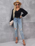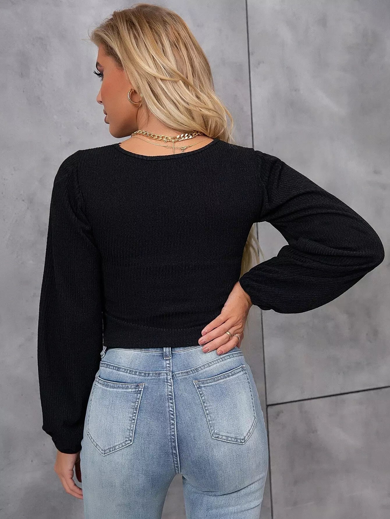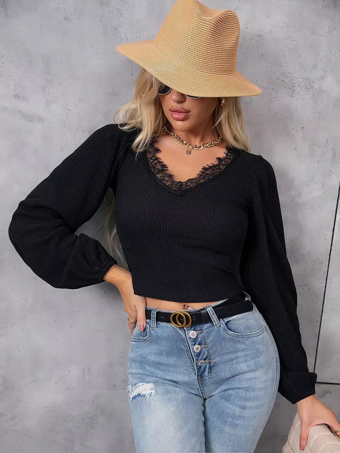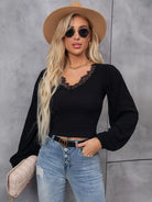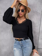 بلوزة قصيرة بأكمام فانوس وحواف من الدانتيل ورموش صناعية