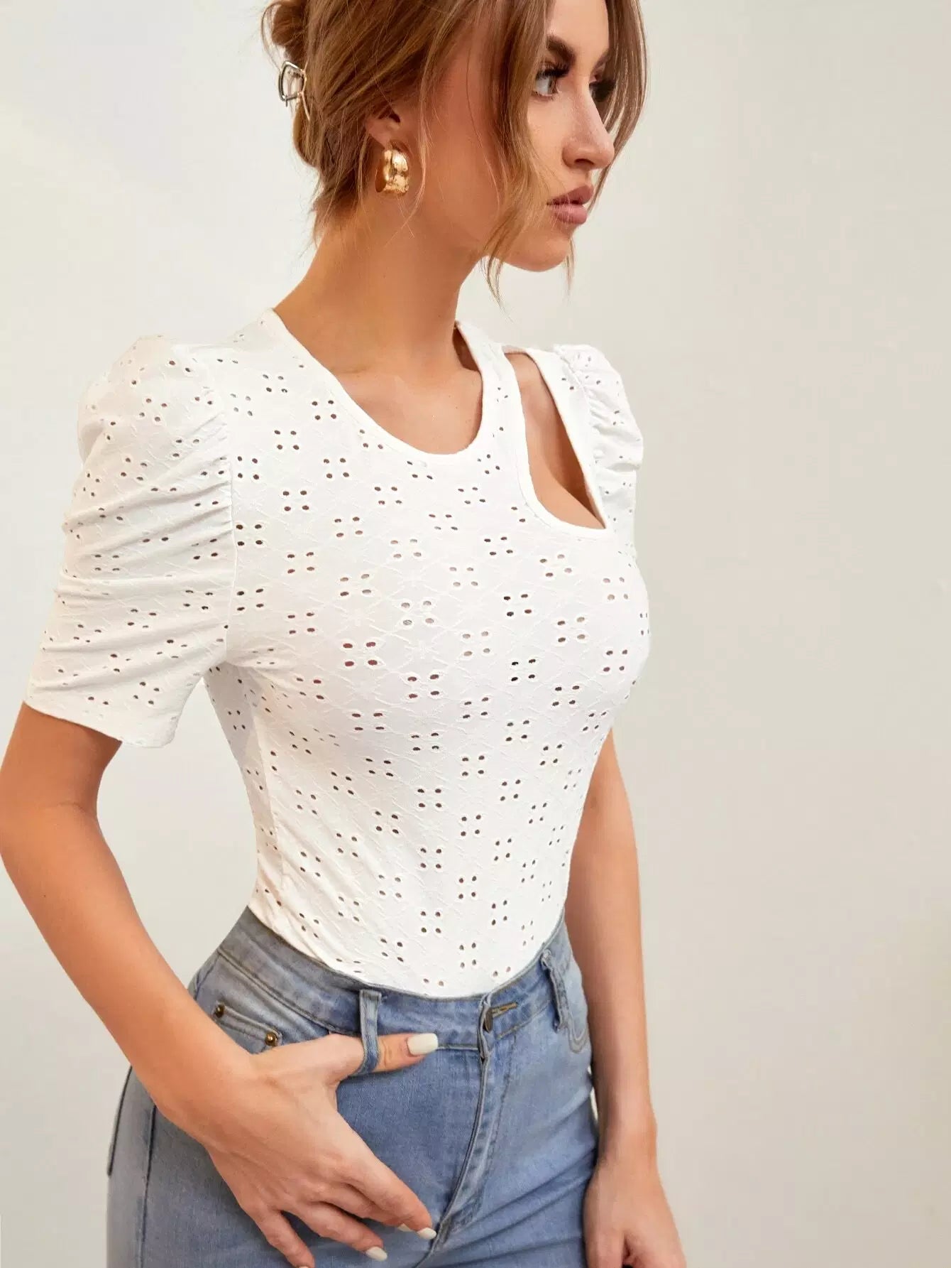 بلوزة بأكمام منفوخة مطرزة بتطريزات على شكل عينة مقطوعة الأكمام