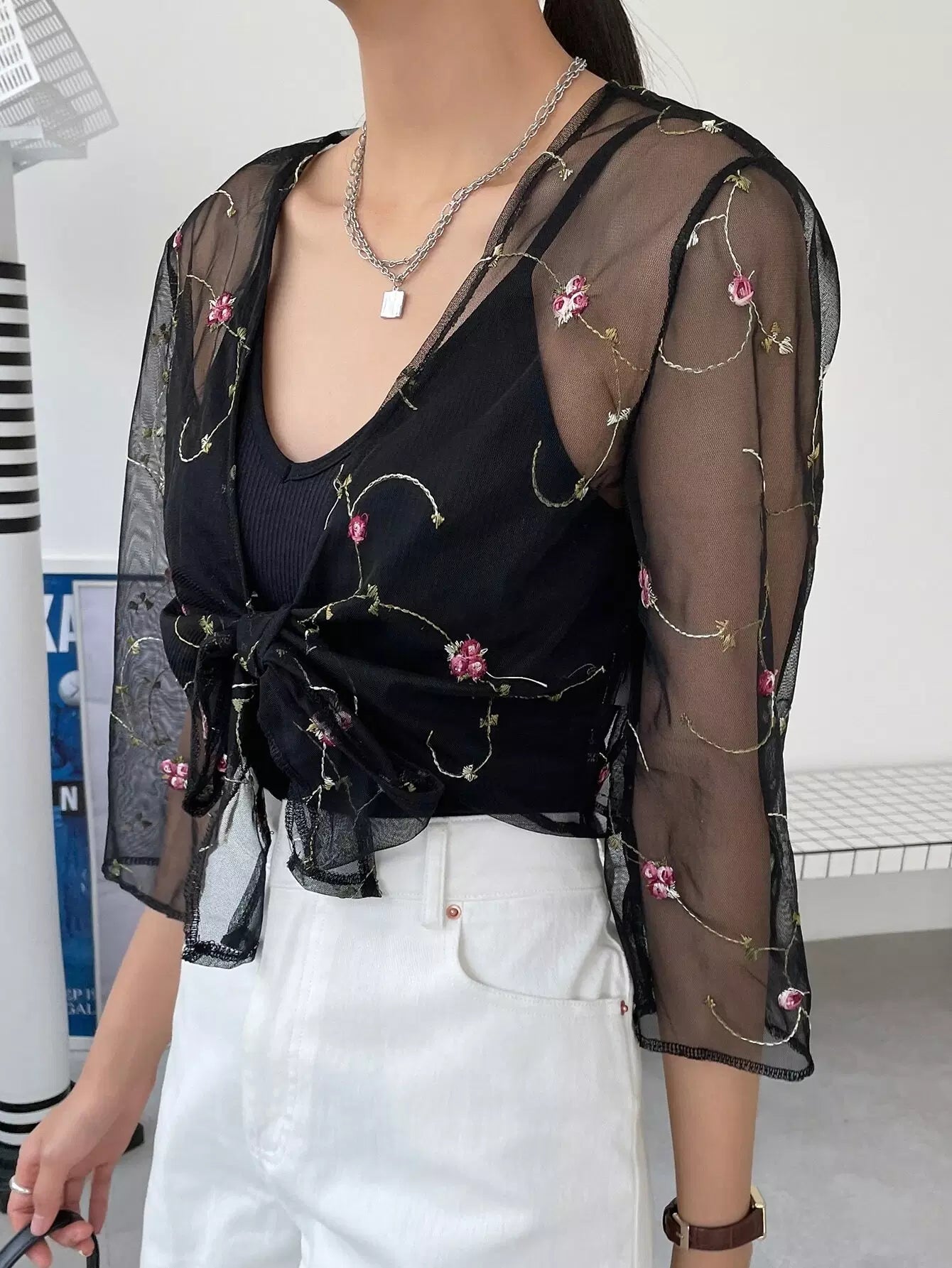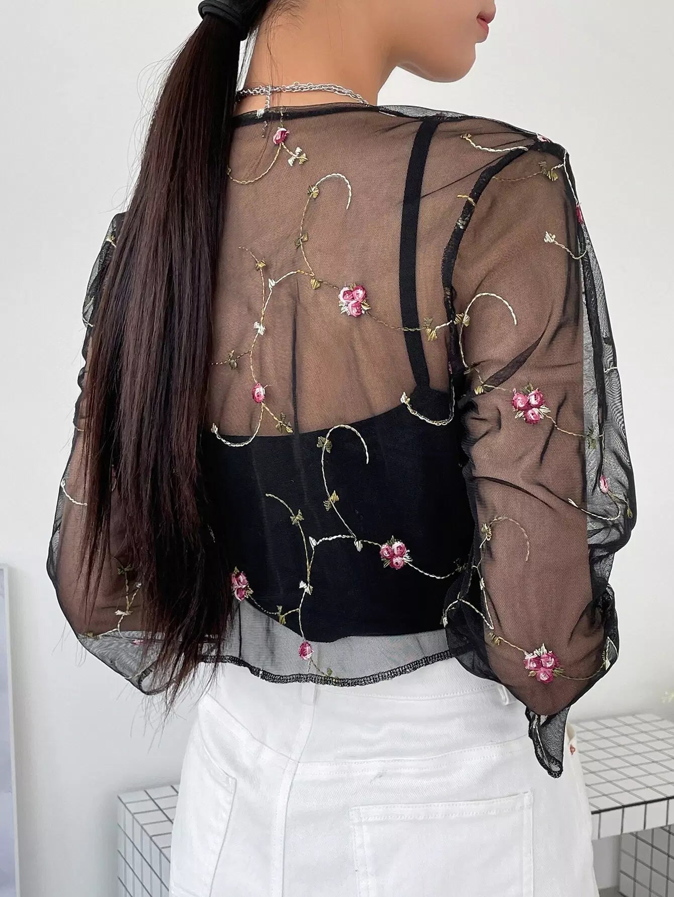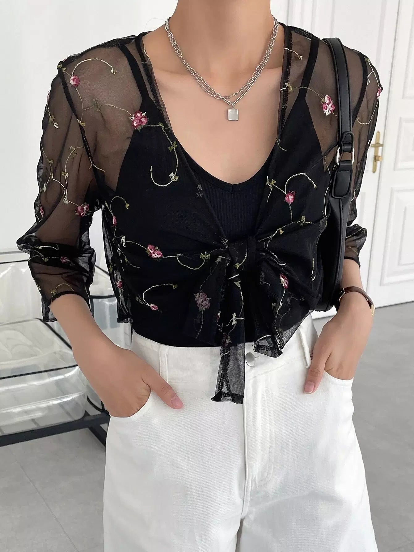 توب شبكي أمامي شبكي مطرز بتطريزات زهرية بدون قميص قصير من الأمام