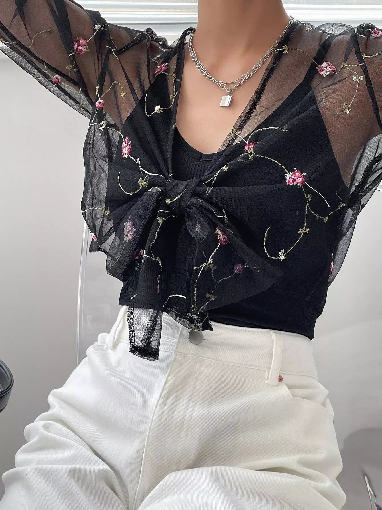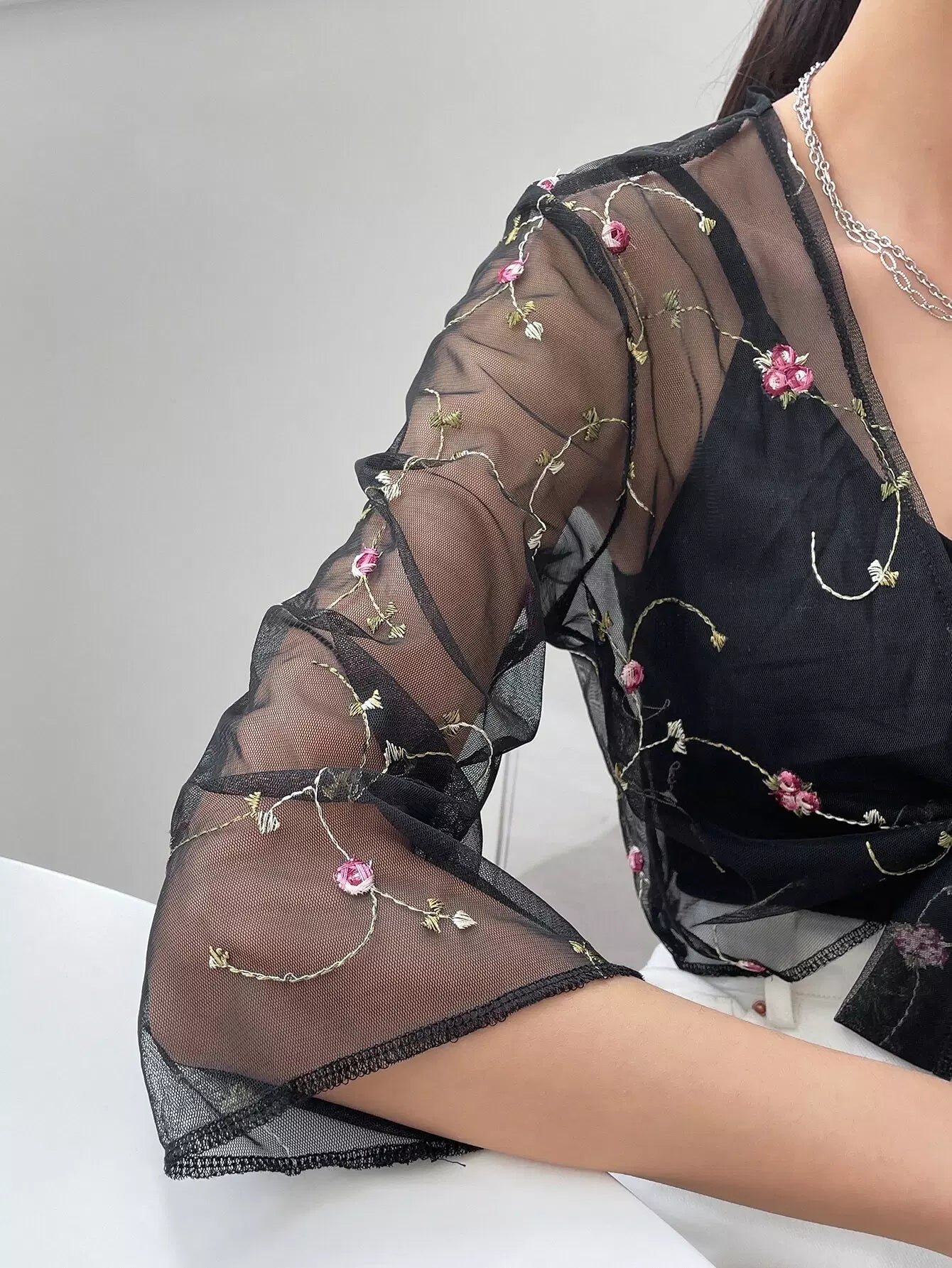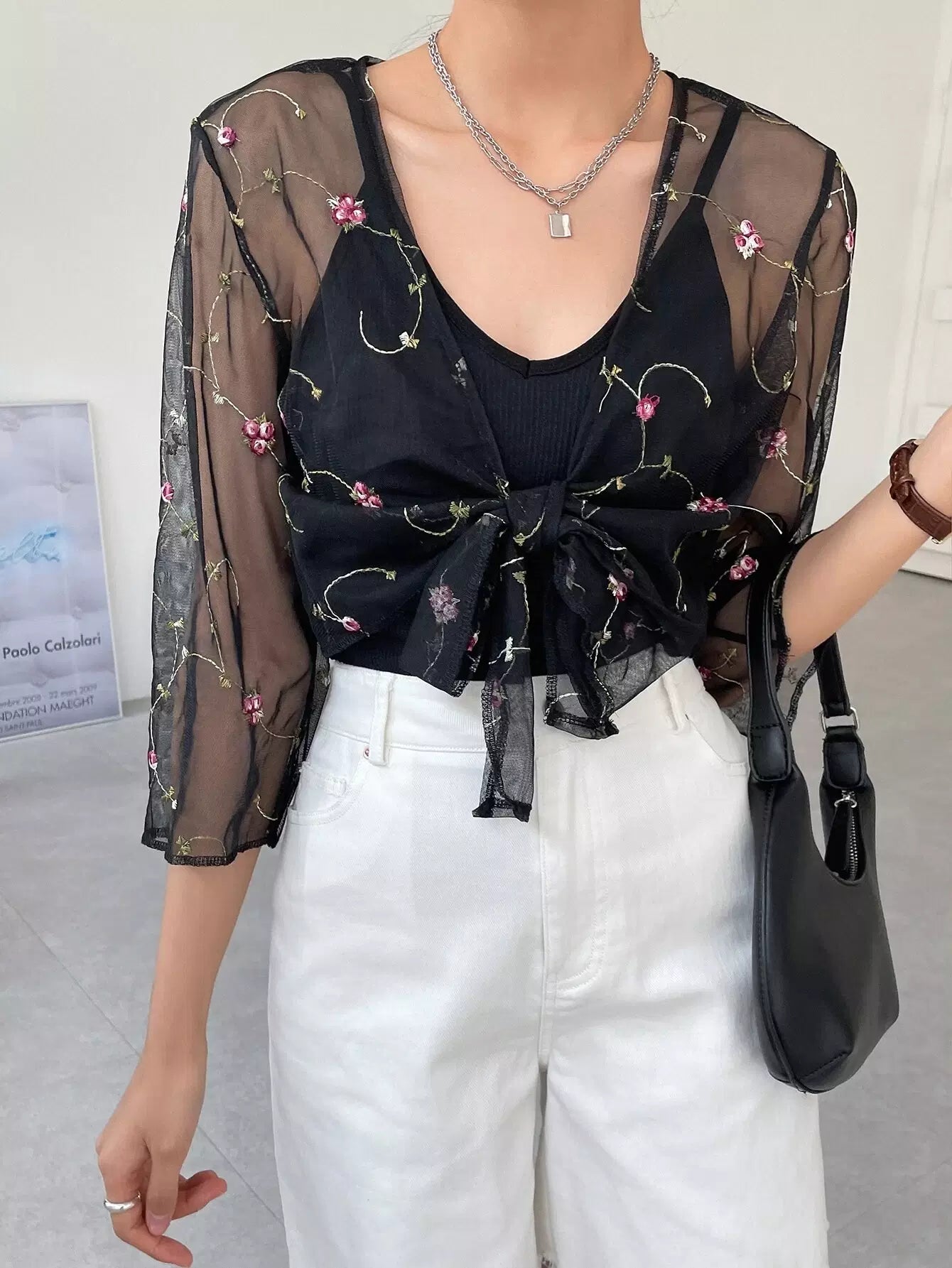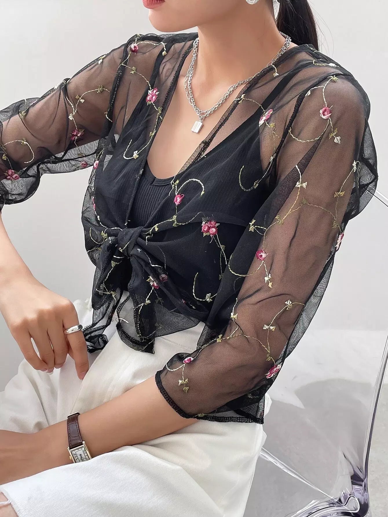توب شبكي أمامي شبكي مطرز بتطريزات زهرية بدون قميص قصير من الأمام