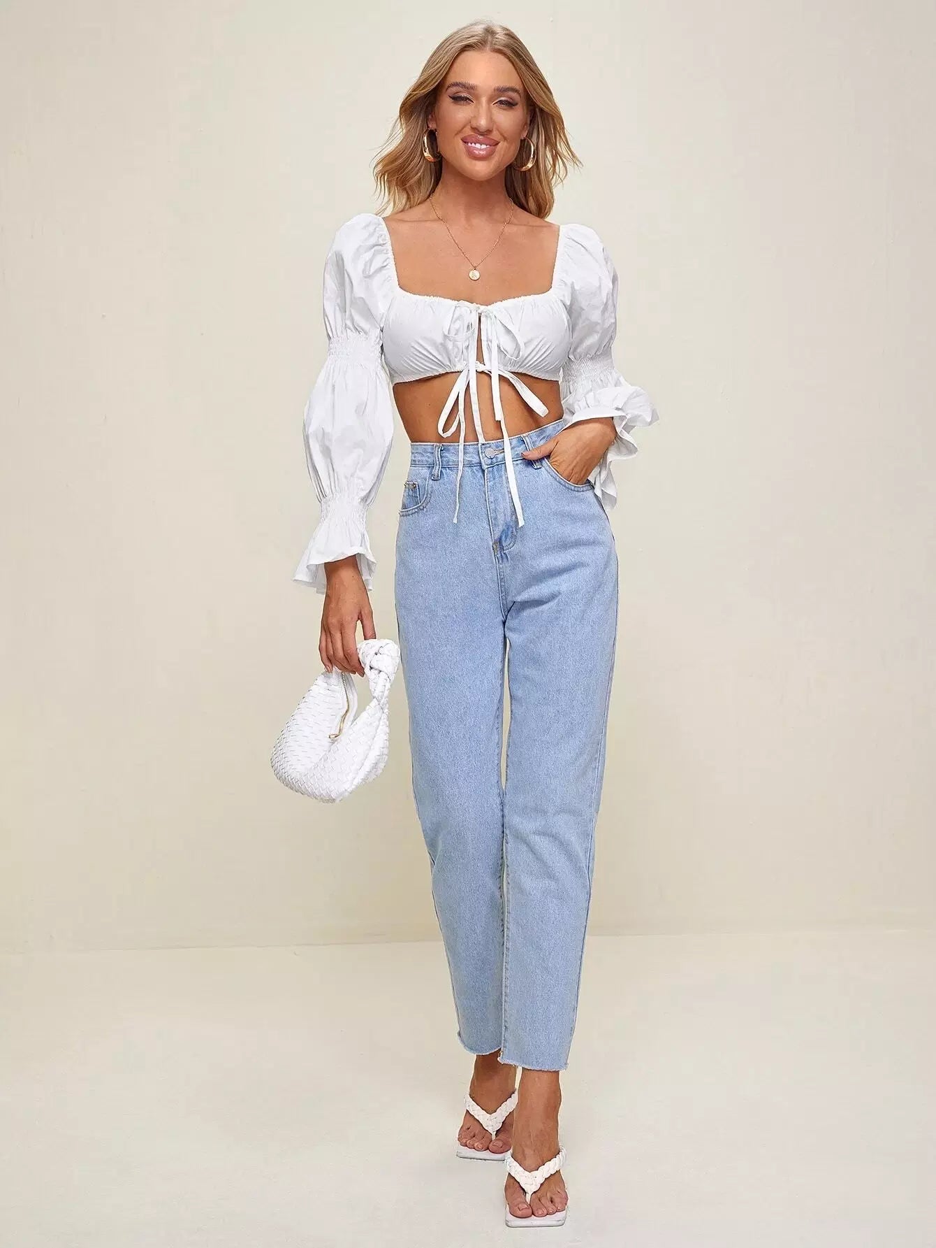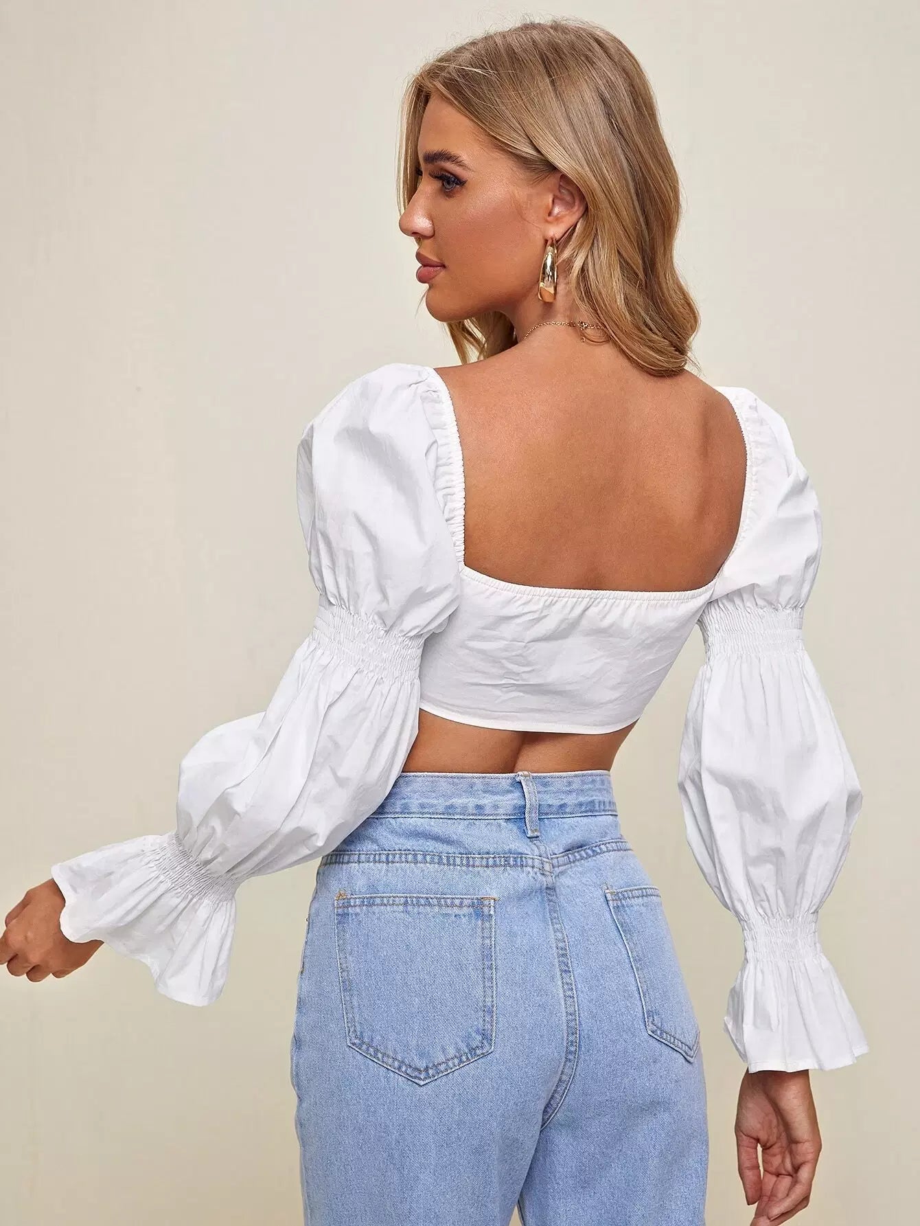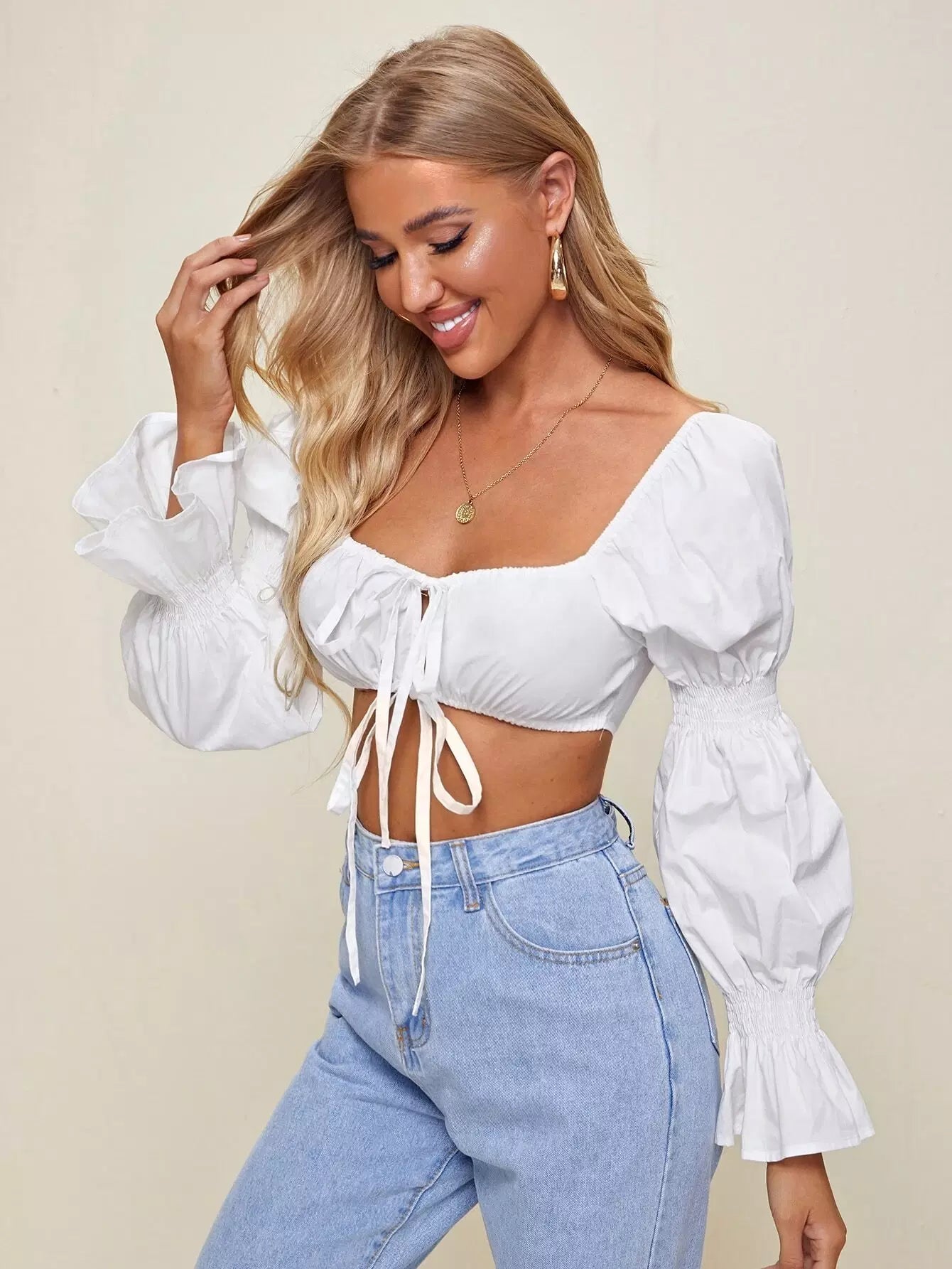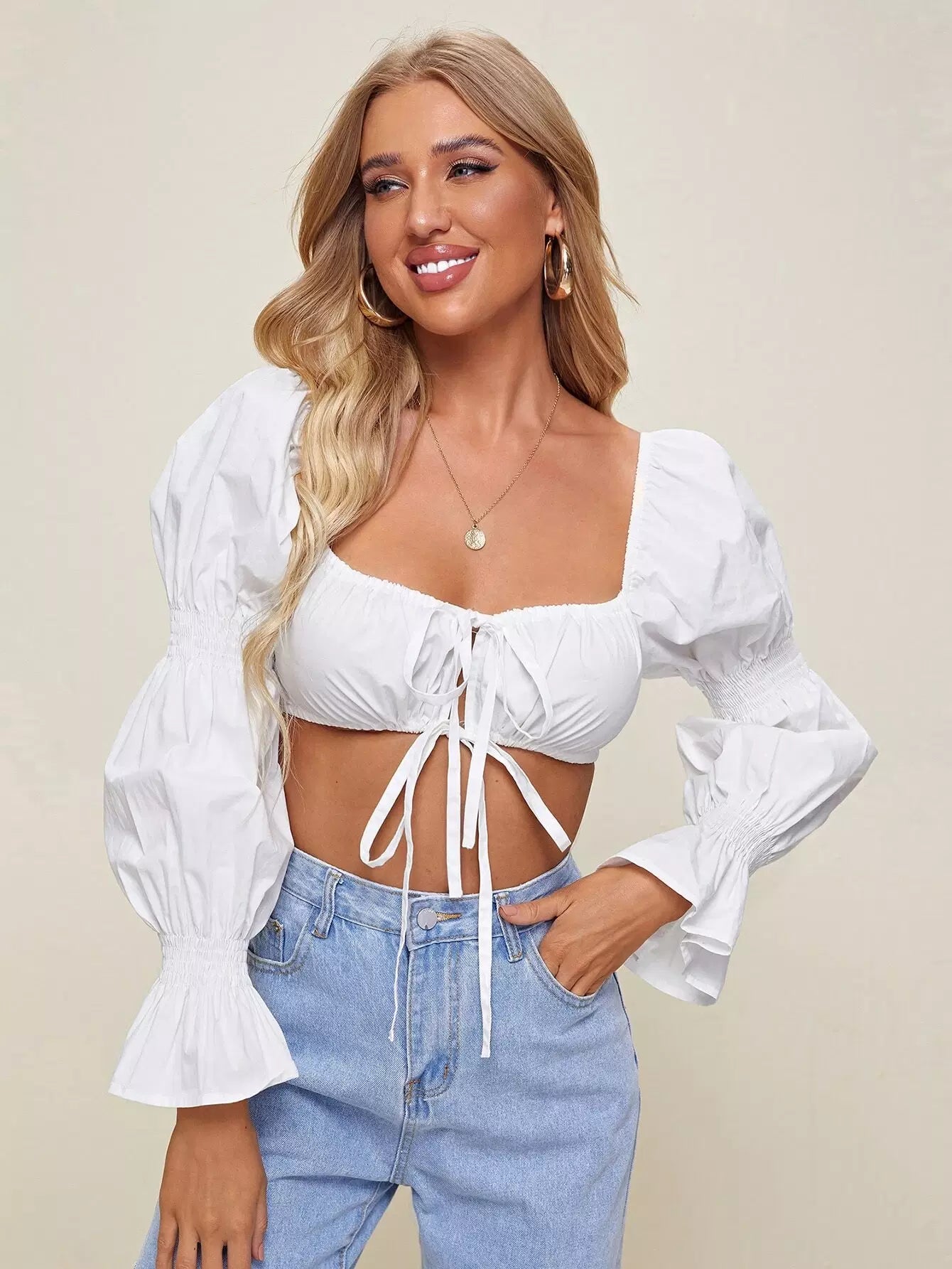 بلوزة قصيرة قصيرة بأكمام مجمعة برباط أمامي من الأمام