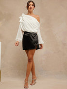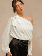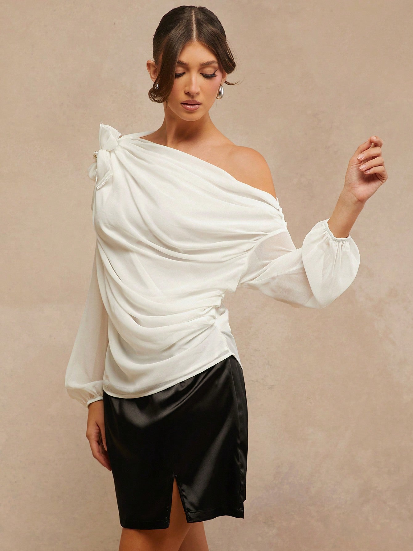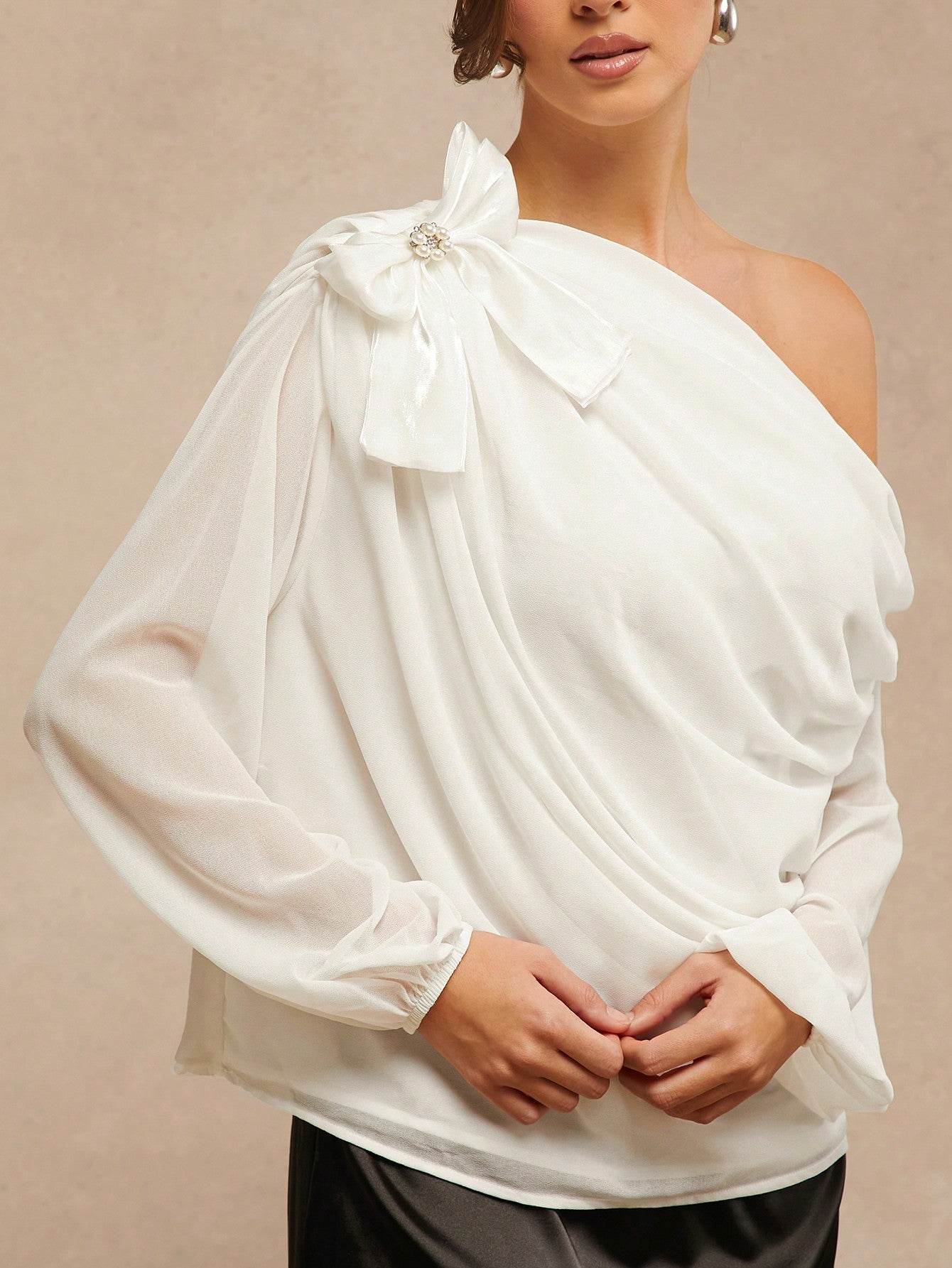 L'Amorae Women Clothes, Women's Elegant White Off Shoulder Top With Rhinestone Bow With Long Sleeves,