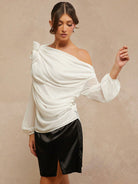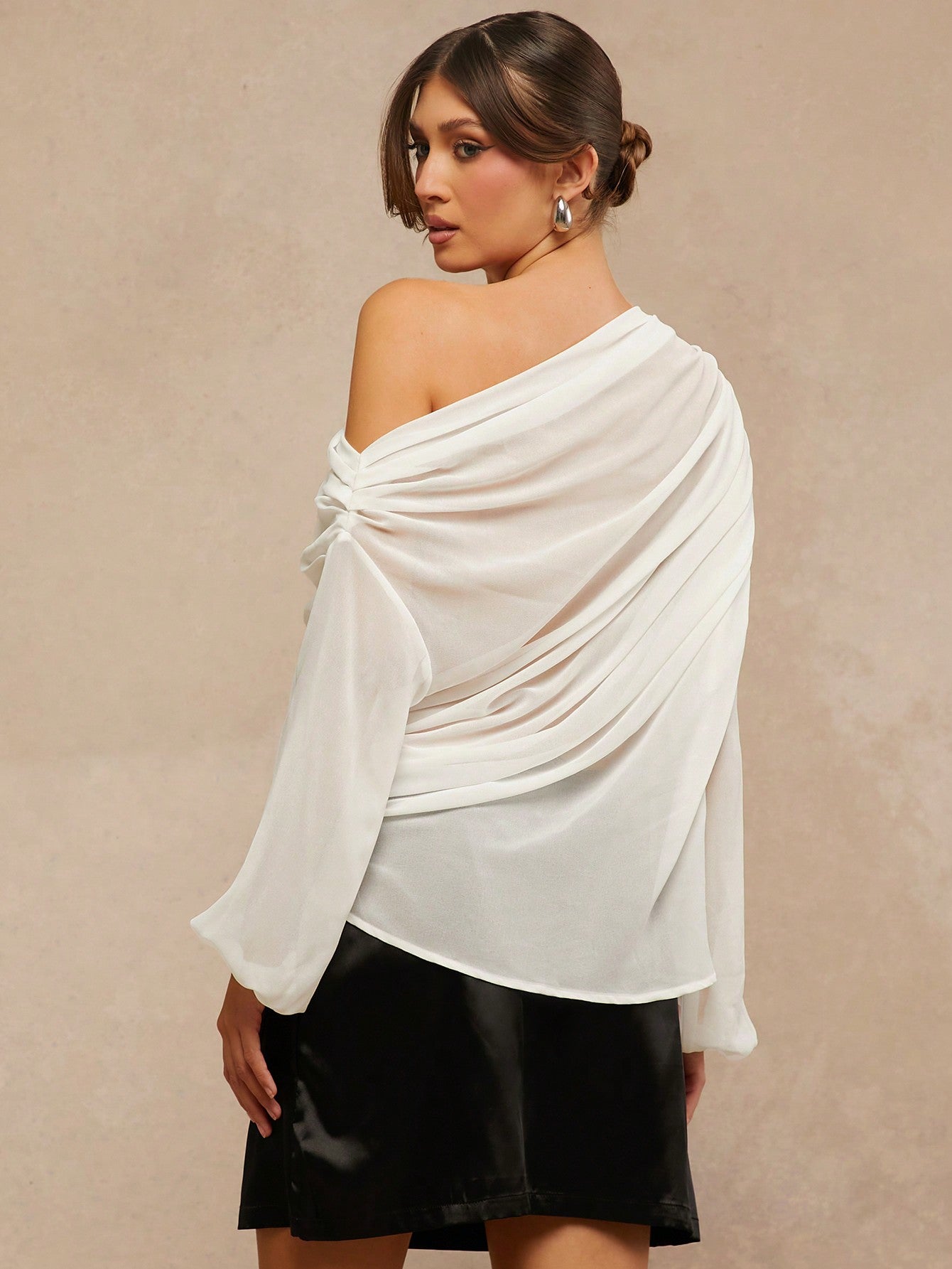 ملابس نسائية من لاموراي، بلوزة نسائية أنيقة بيضاء مكشوفة الكتفين مع فيونكة من أحجار الراين وأكمام طويلة،