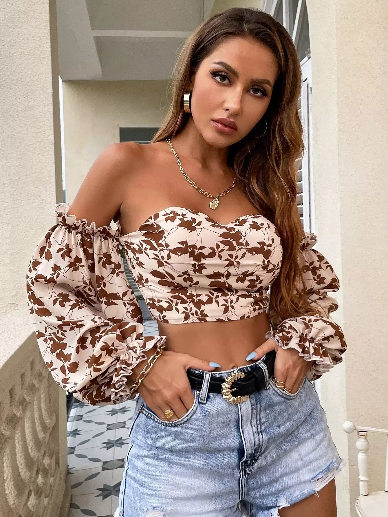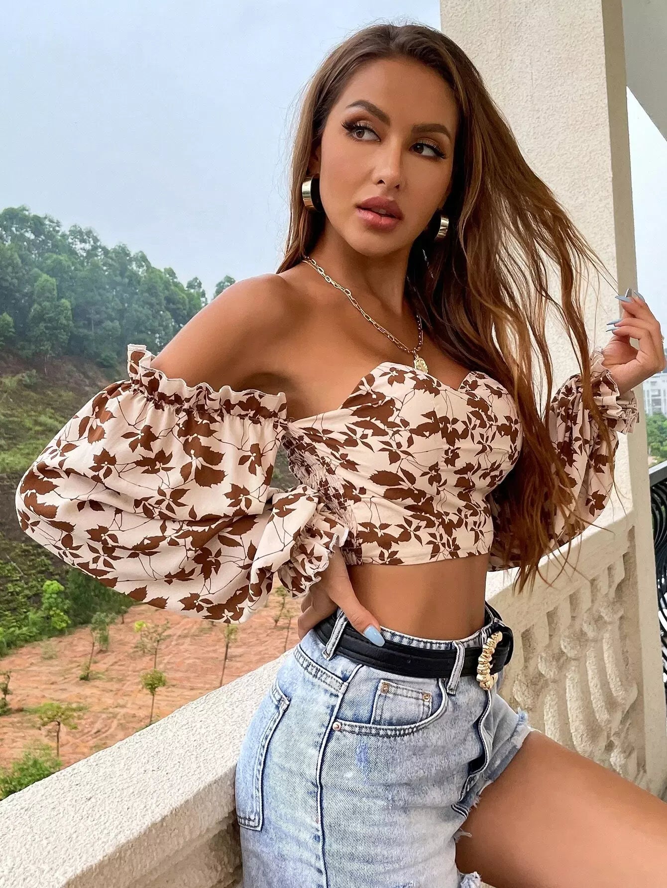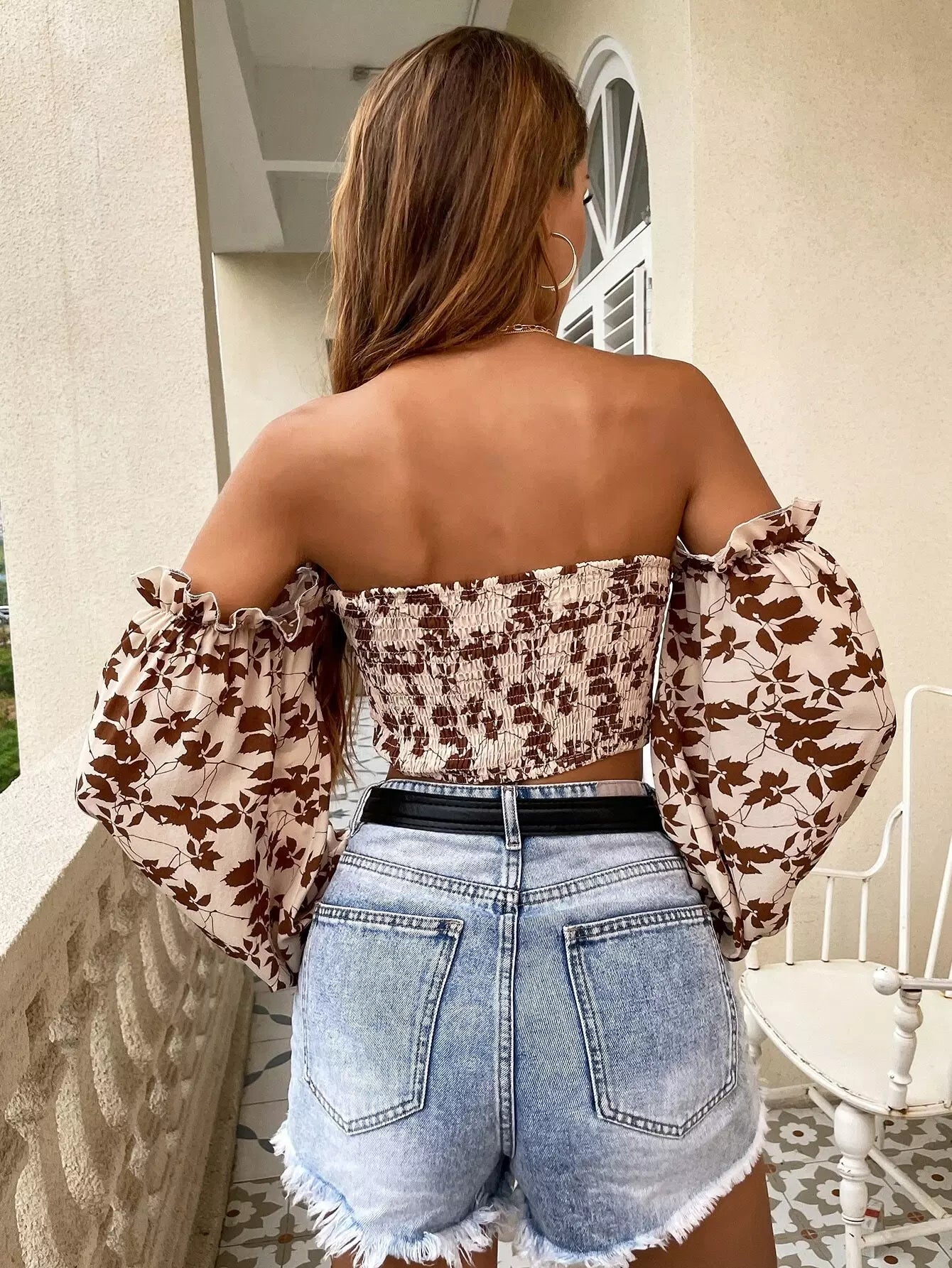 بلوزة قصيرة مكشوفة الأكتاف بطبعة أوراق الشجر