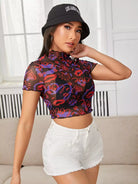 بلوزة شبكية مزينة بطبعة حروف وشفاه بحواف شبكية مزينة بالخس