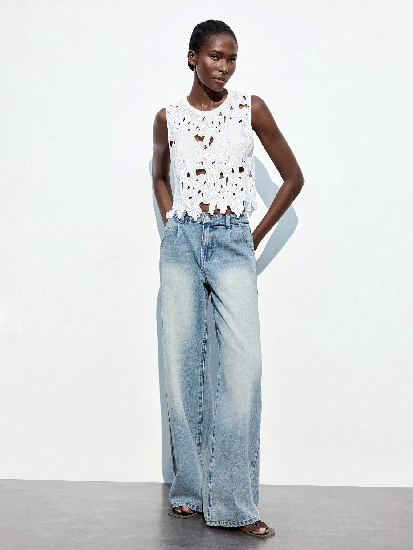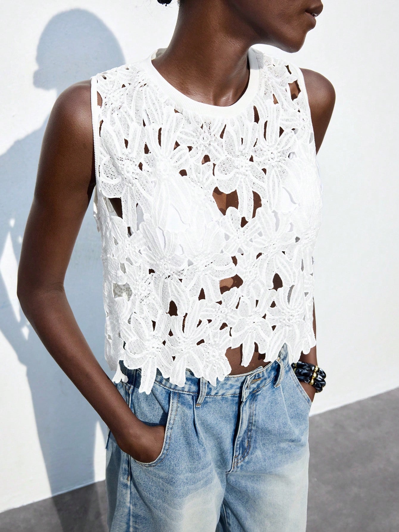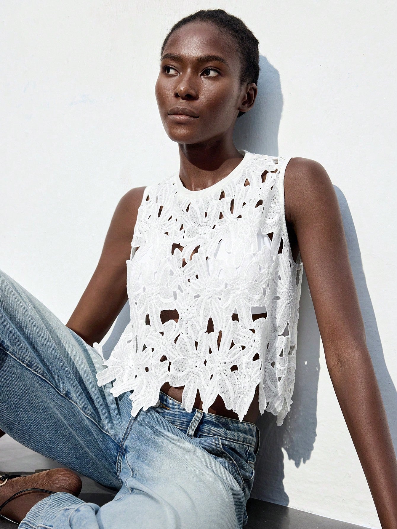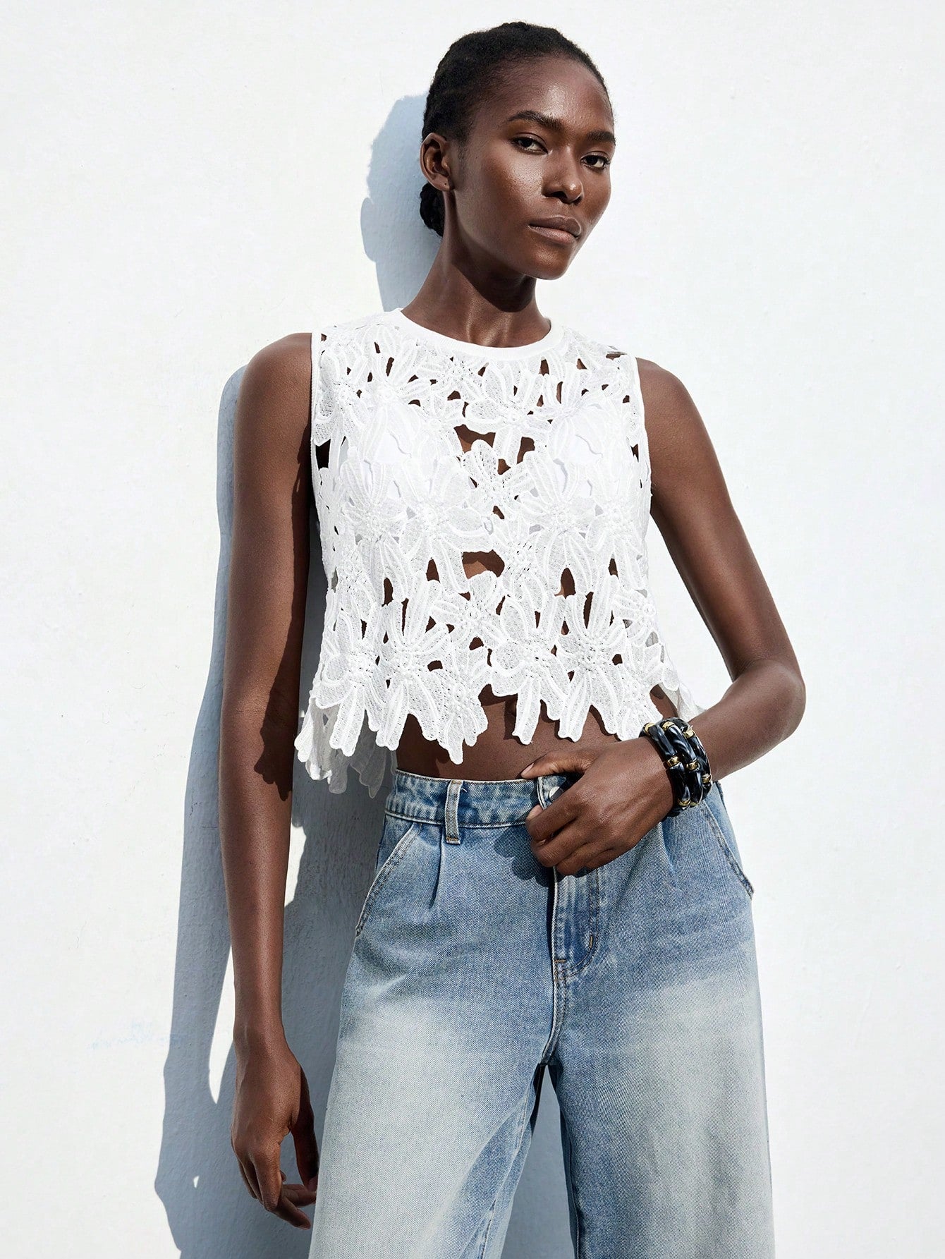Maija Elegant Water-Soluble Floral Lace Tank Top Casual Cover Up, Suitable For Spring Summer Holiday
