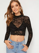 للنساء - قميص علوي شبكي ذو رقبة وهمية وأطراف خس بدون حمالة صدر