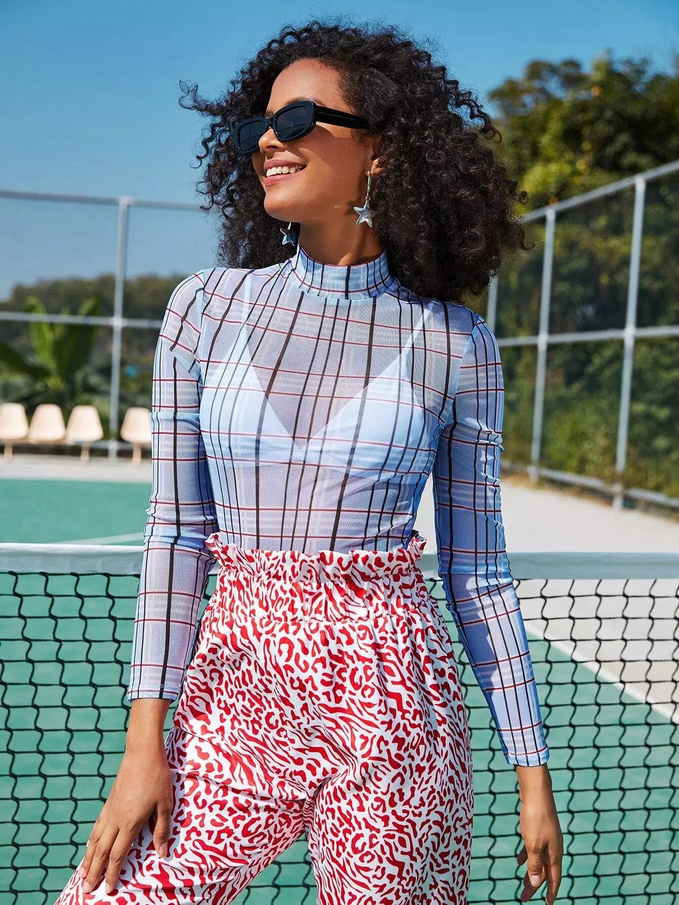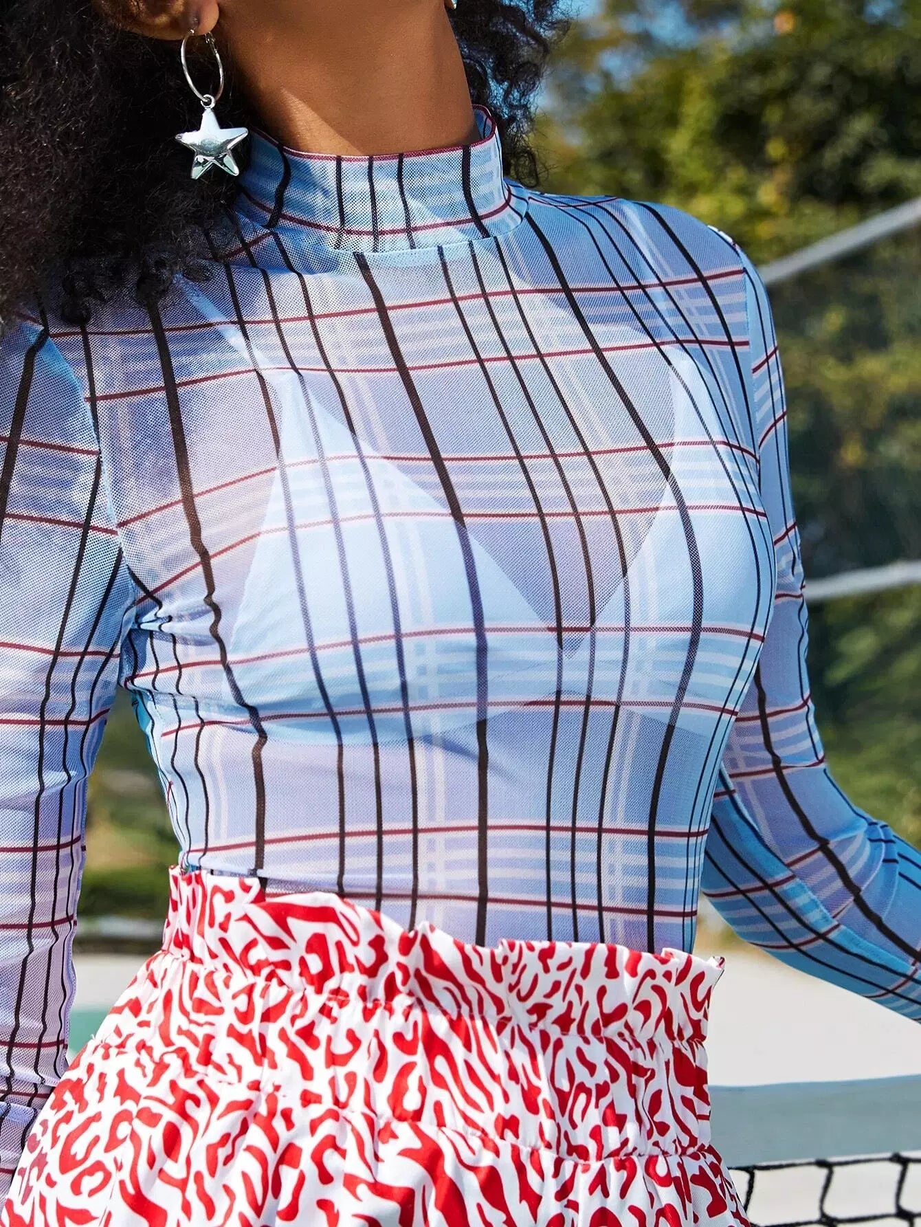 توب برقبة وهمية منقوشة شبكية شفافة بدون حمالة صدر