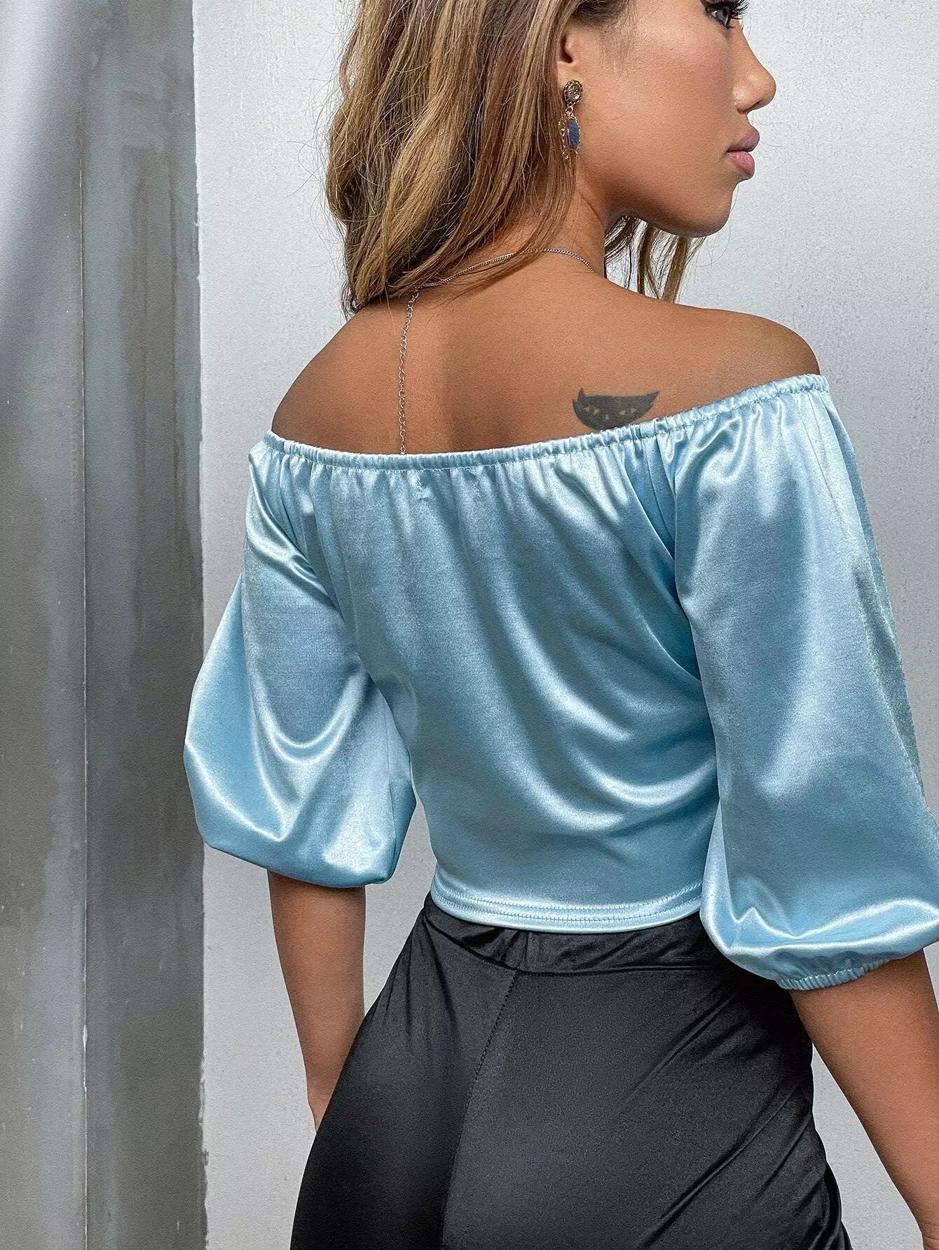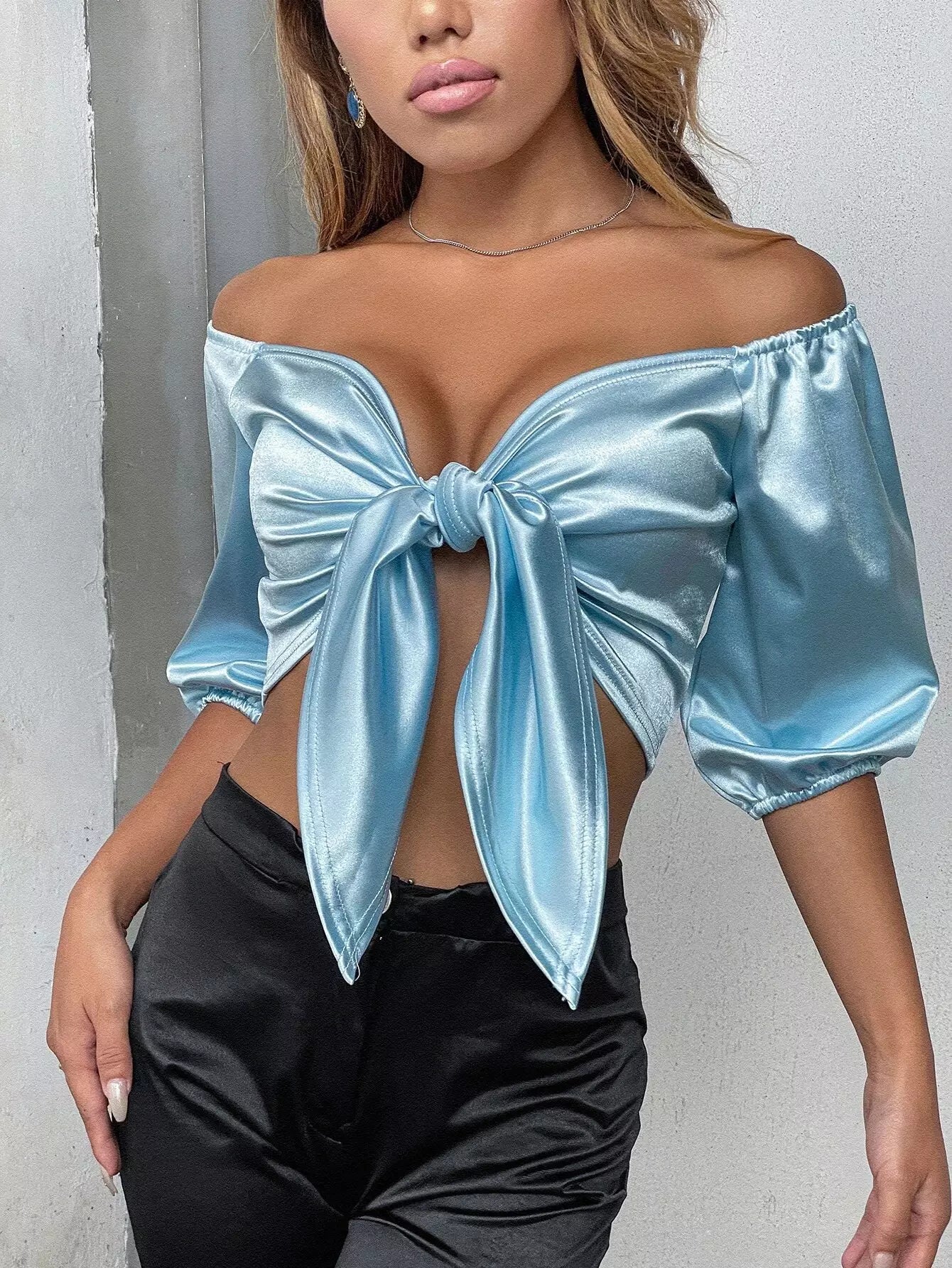 بلوزة قصيرة قصيرة من الساتان برباط أمامي من الساتان مكشوفة الكتفين