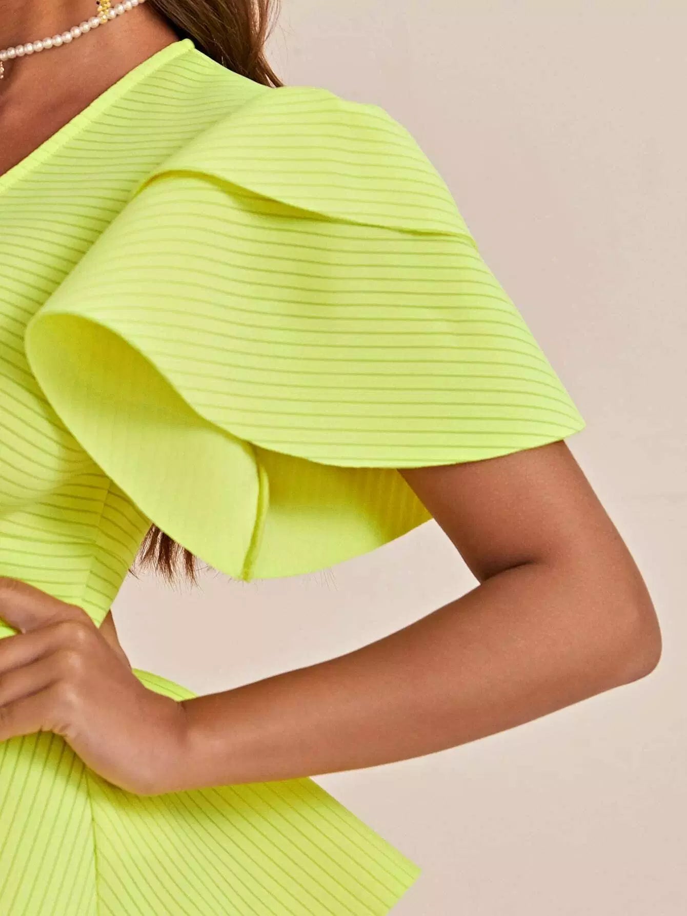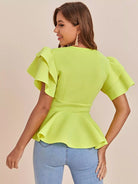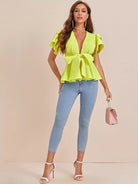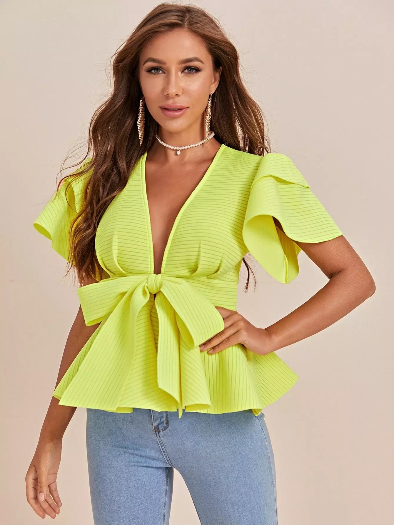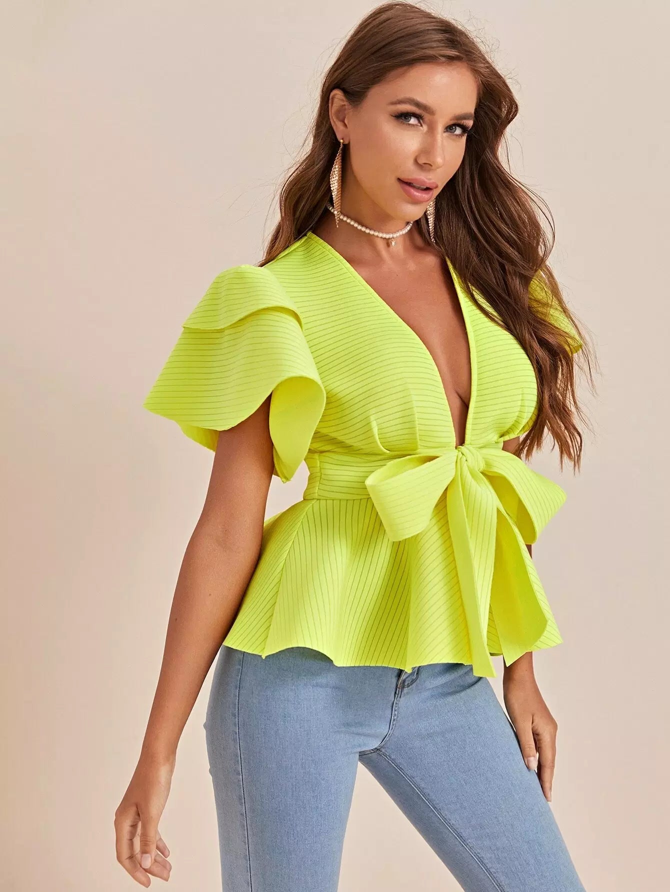 بلوزة بياقة برقبة واسعة بفتحة رقبة فراشة بأكمام مخططة من الأمام