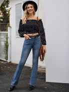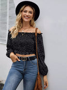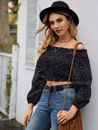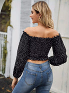 بلوزة باردو منقّطة مزركشة بكشكش بحواف منقطة