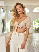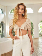 بلوزة قصيرة بأكمام منتفخة برباط أمامي منفوخة من الأمام