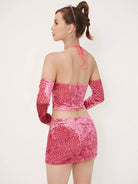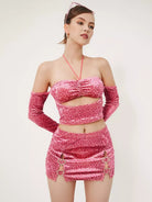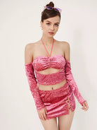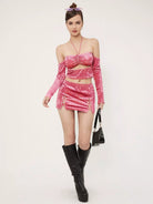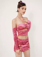 بلوزة قصيرة بأكمام مكشكشة بأكتاف باردة بأكمام تويست مخملية بأحجار الراين