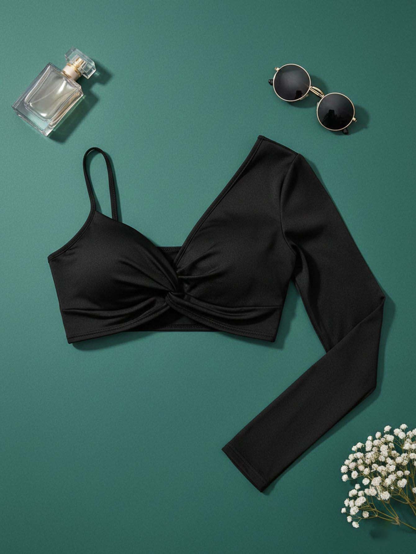 بلوزة قصيرة بأكمام طويلة على شكل حرف V بياقة على شكل حرف V مكشكشة