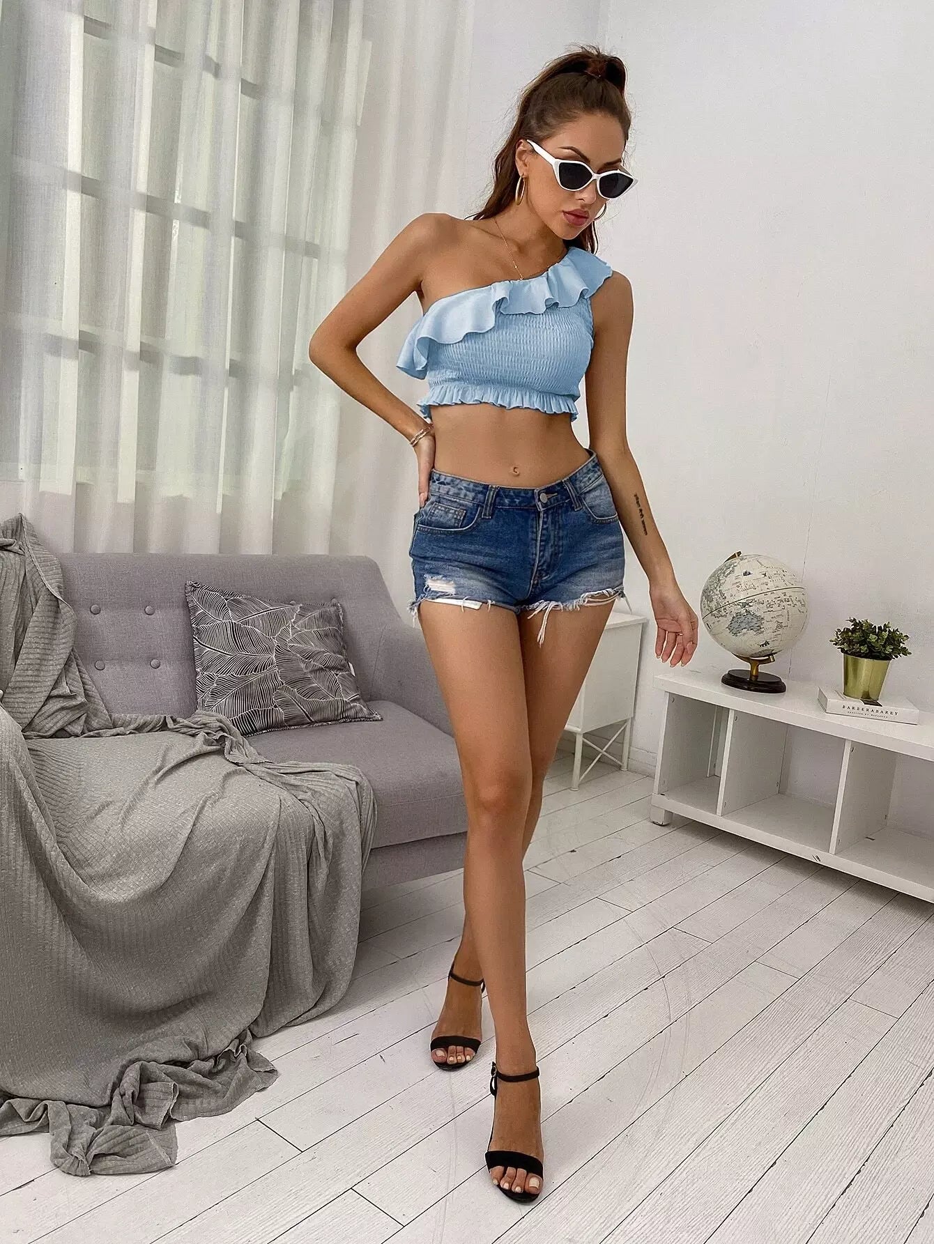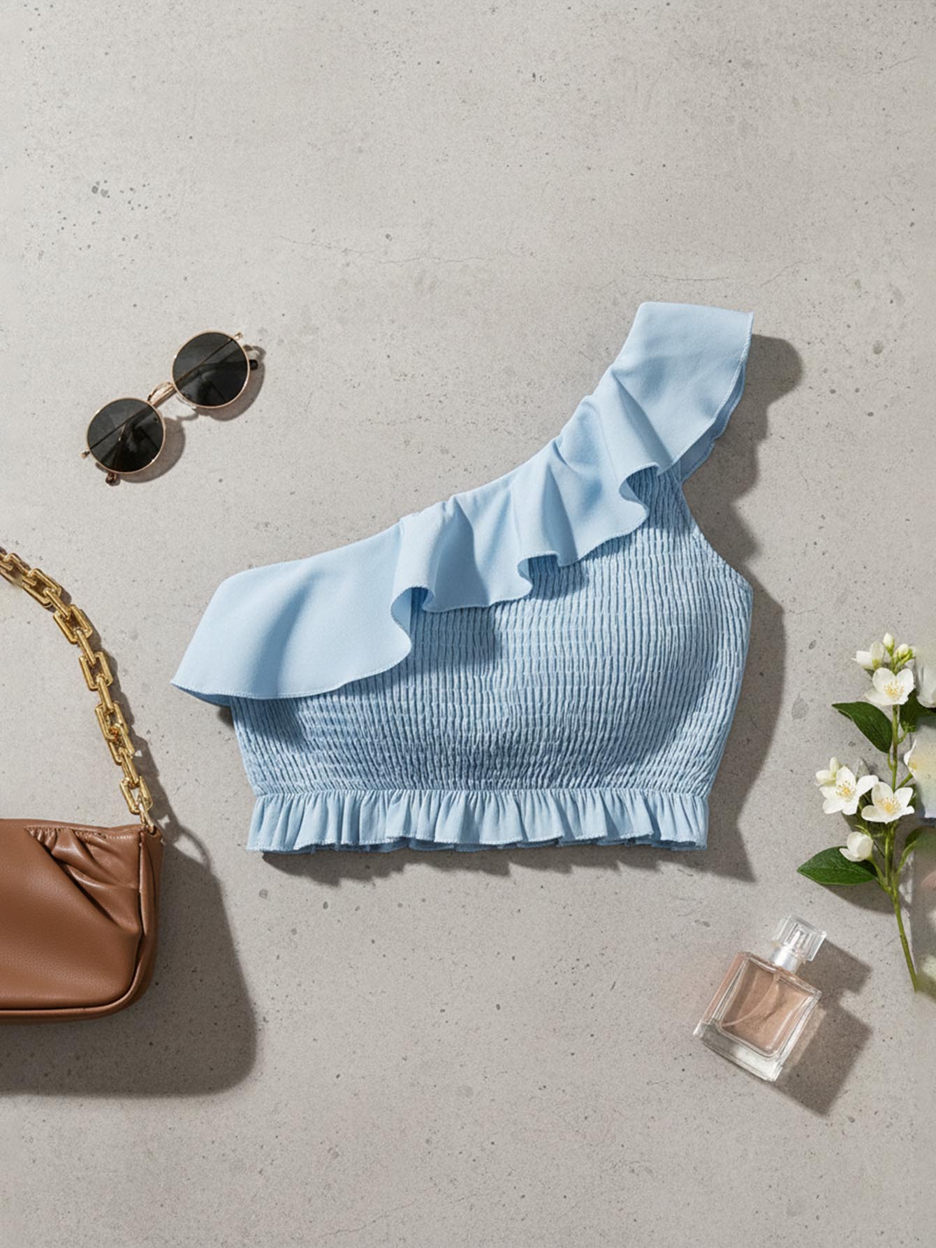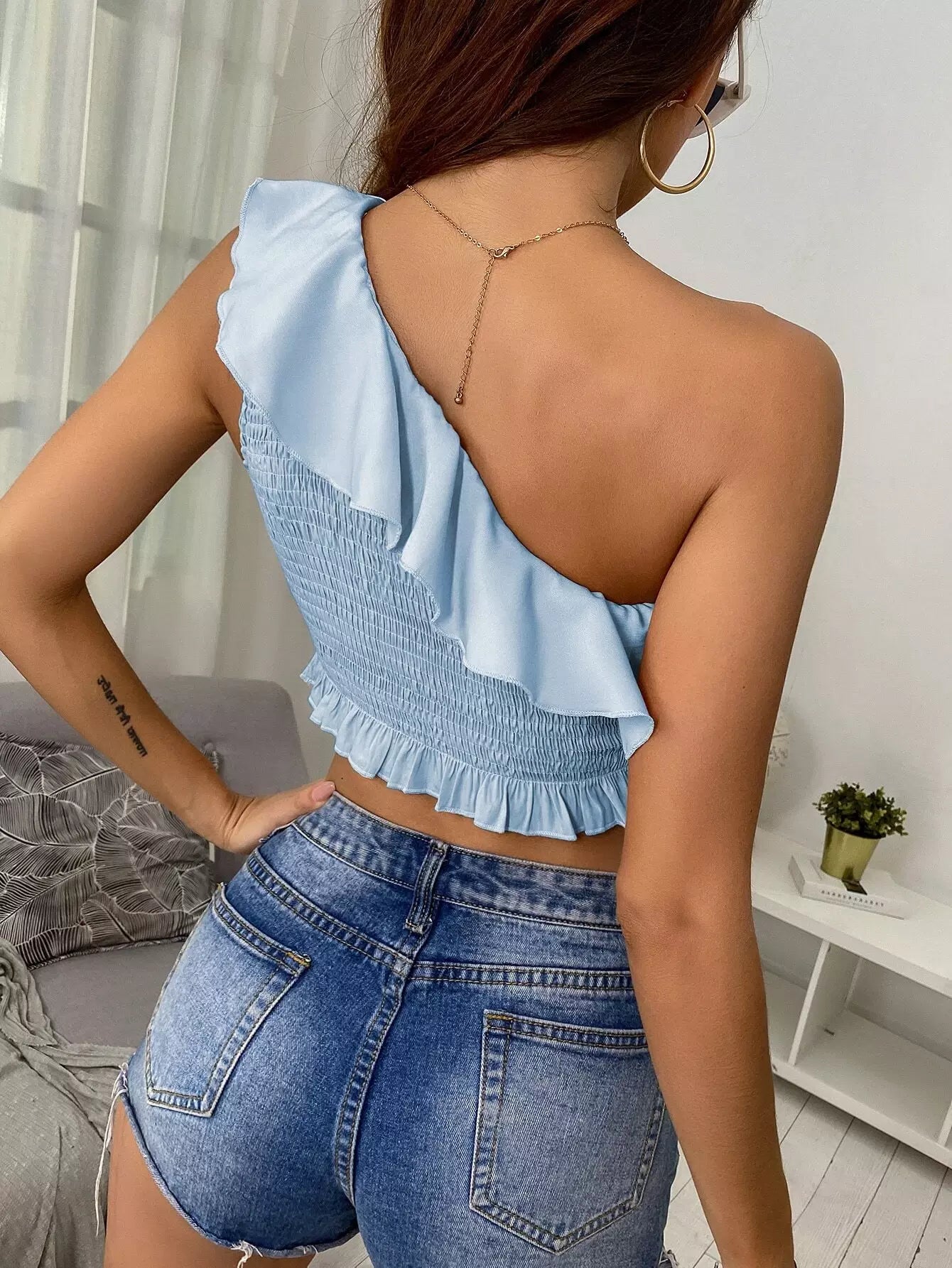 بلوزة قصيرة قصيرة مكشكشة ذات كتف واحد مكشكشة