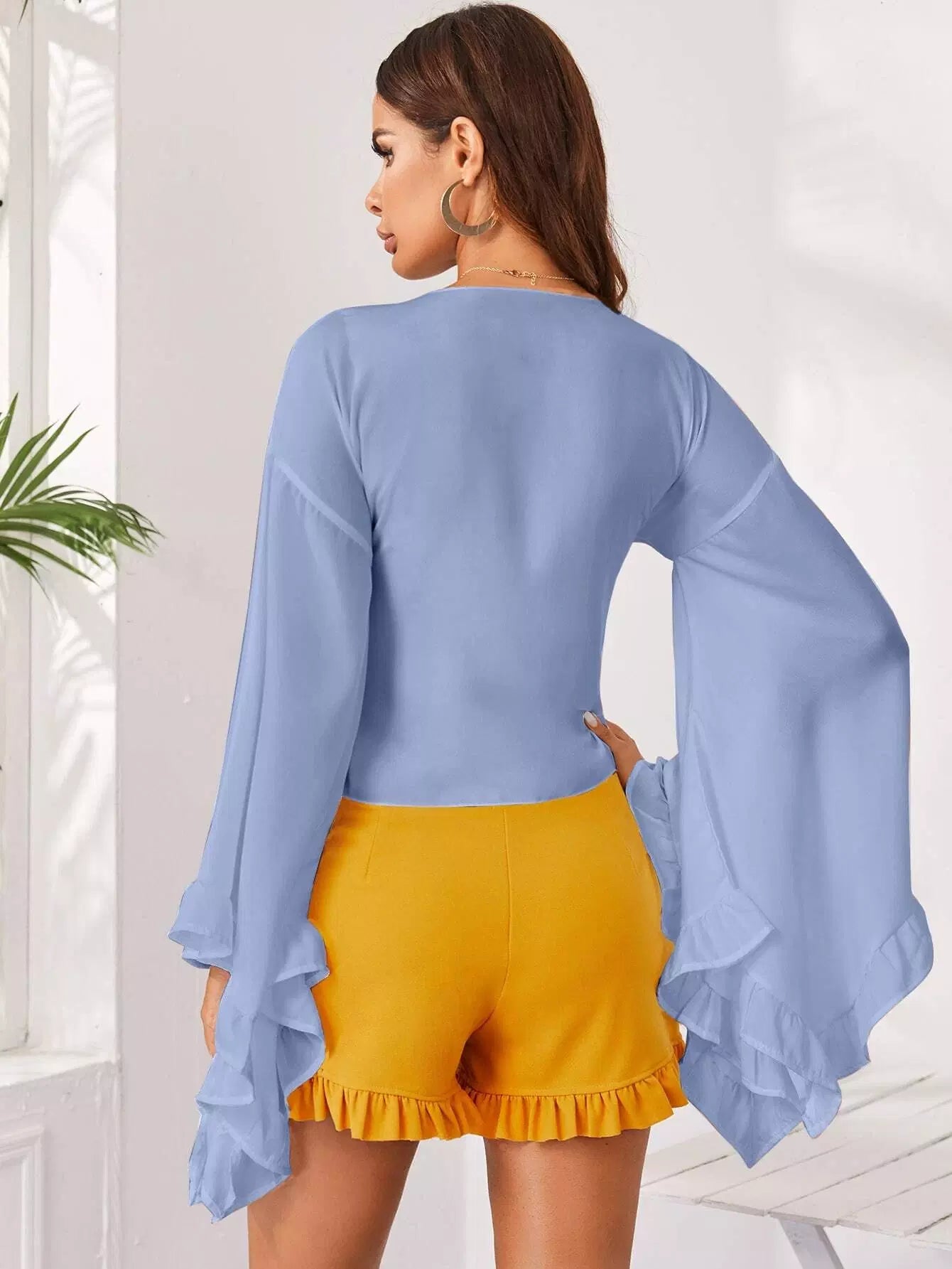 بلوزة قصيرة بأكمام مكشكشة وحواف مكشكشة ورباط أمامي