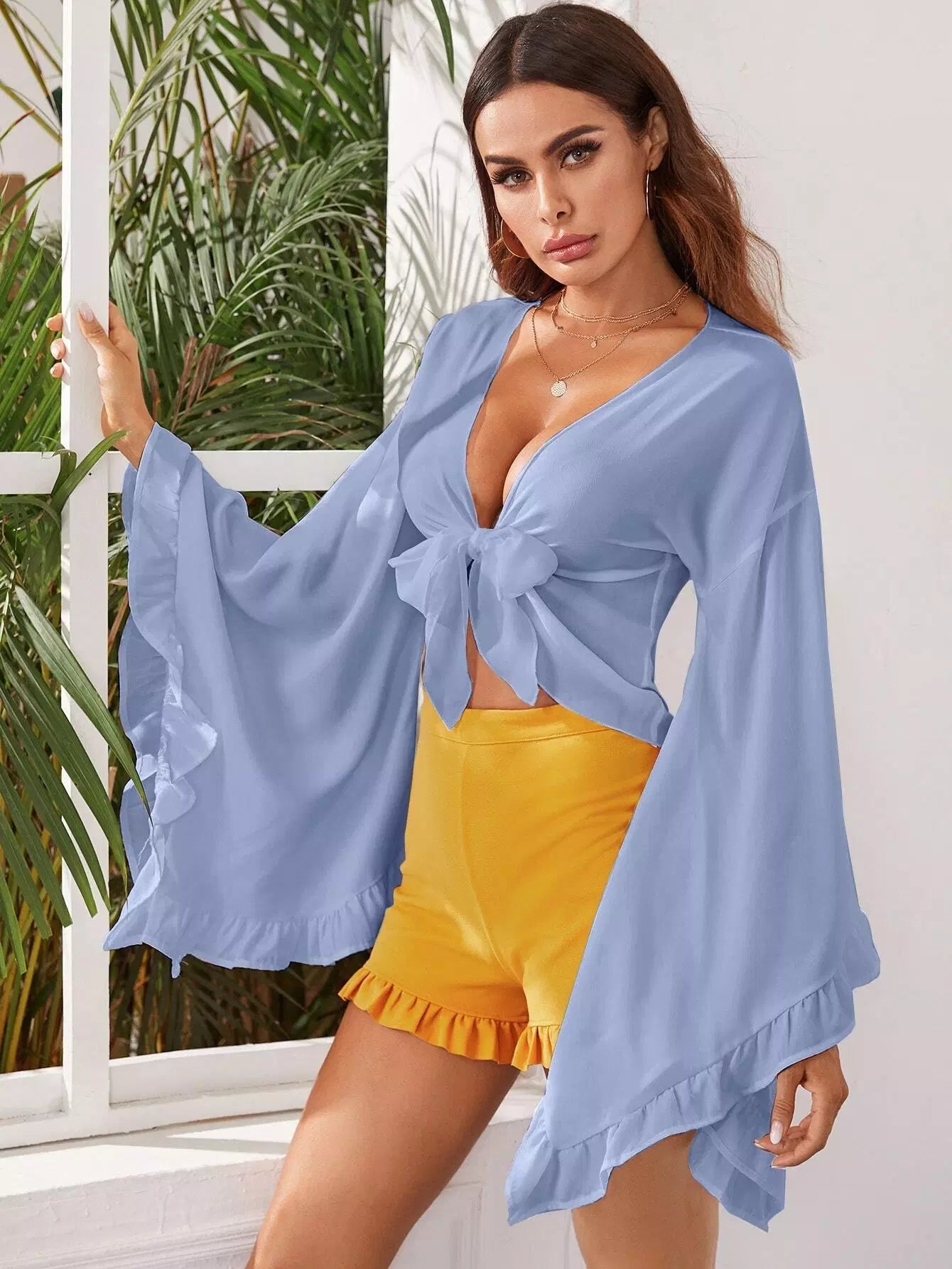 المرأة - بلوزة قصيرة ذات أكمام مكشكشة وربطة أمامية