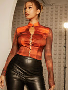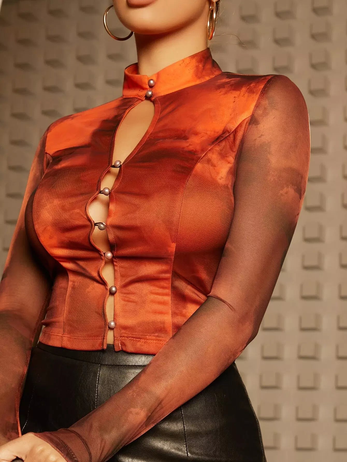 بلوزة شفافة ذات تفاصيل شبكية شفافة مصبوغة بأزرار بأزرار