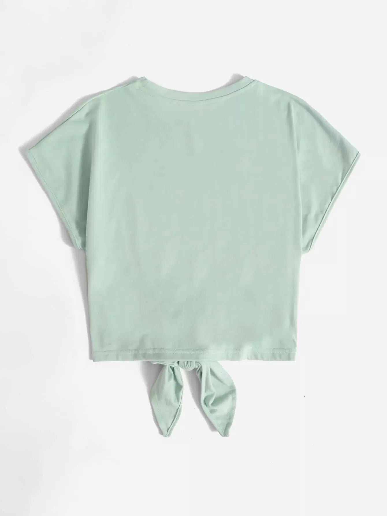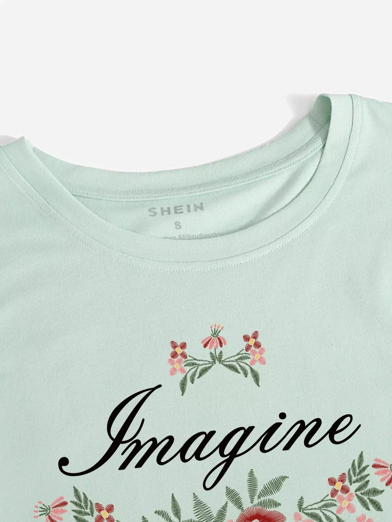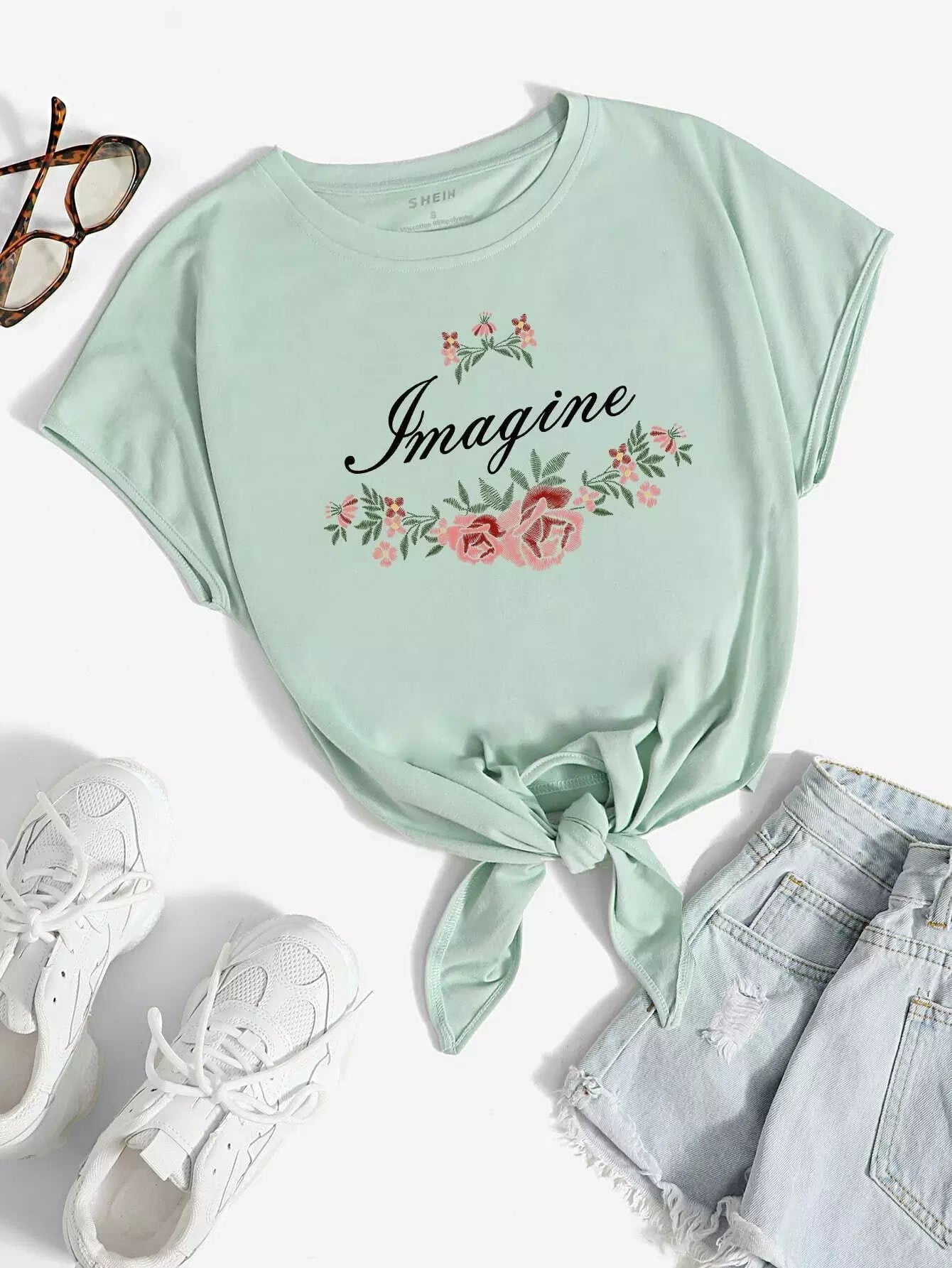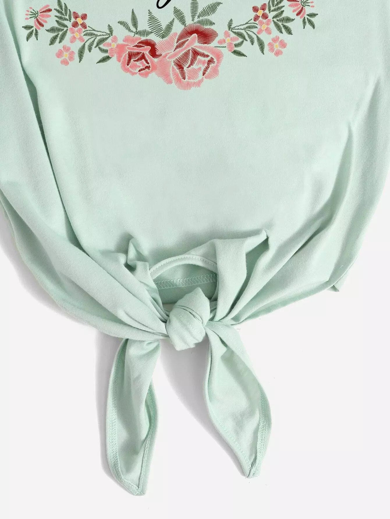 تي شيرت بأكمام مكفوفة بطبعة زهور وطبعة زهور بحاشية معقودة