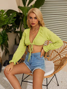 بلوزة قصيرة بأكمام جرس ورباط أمامي