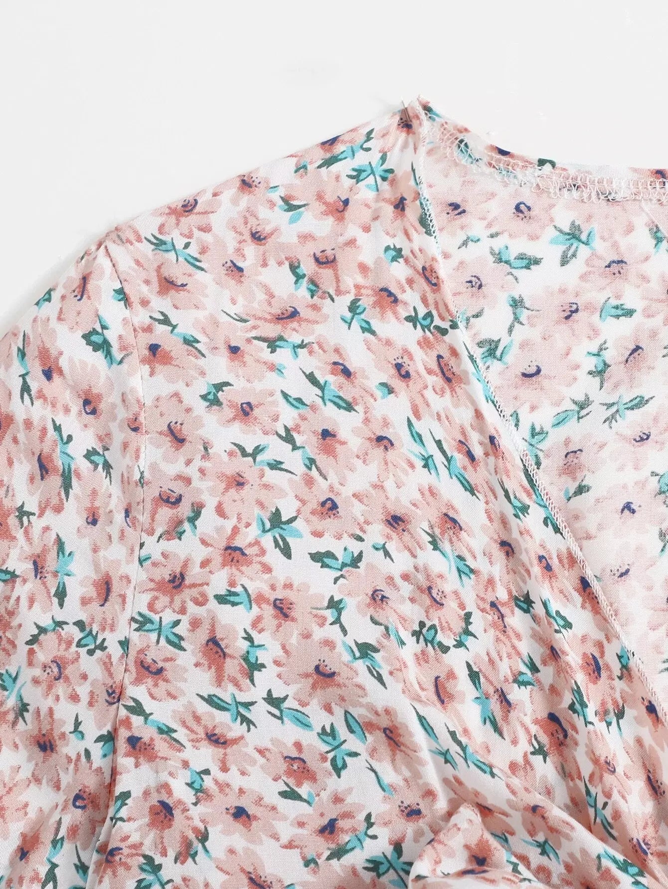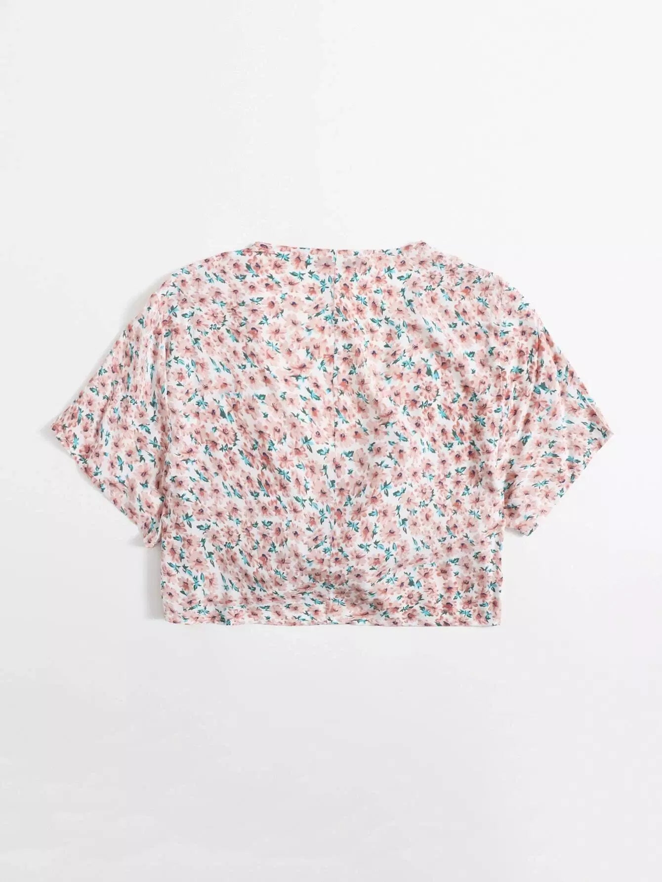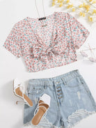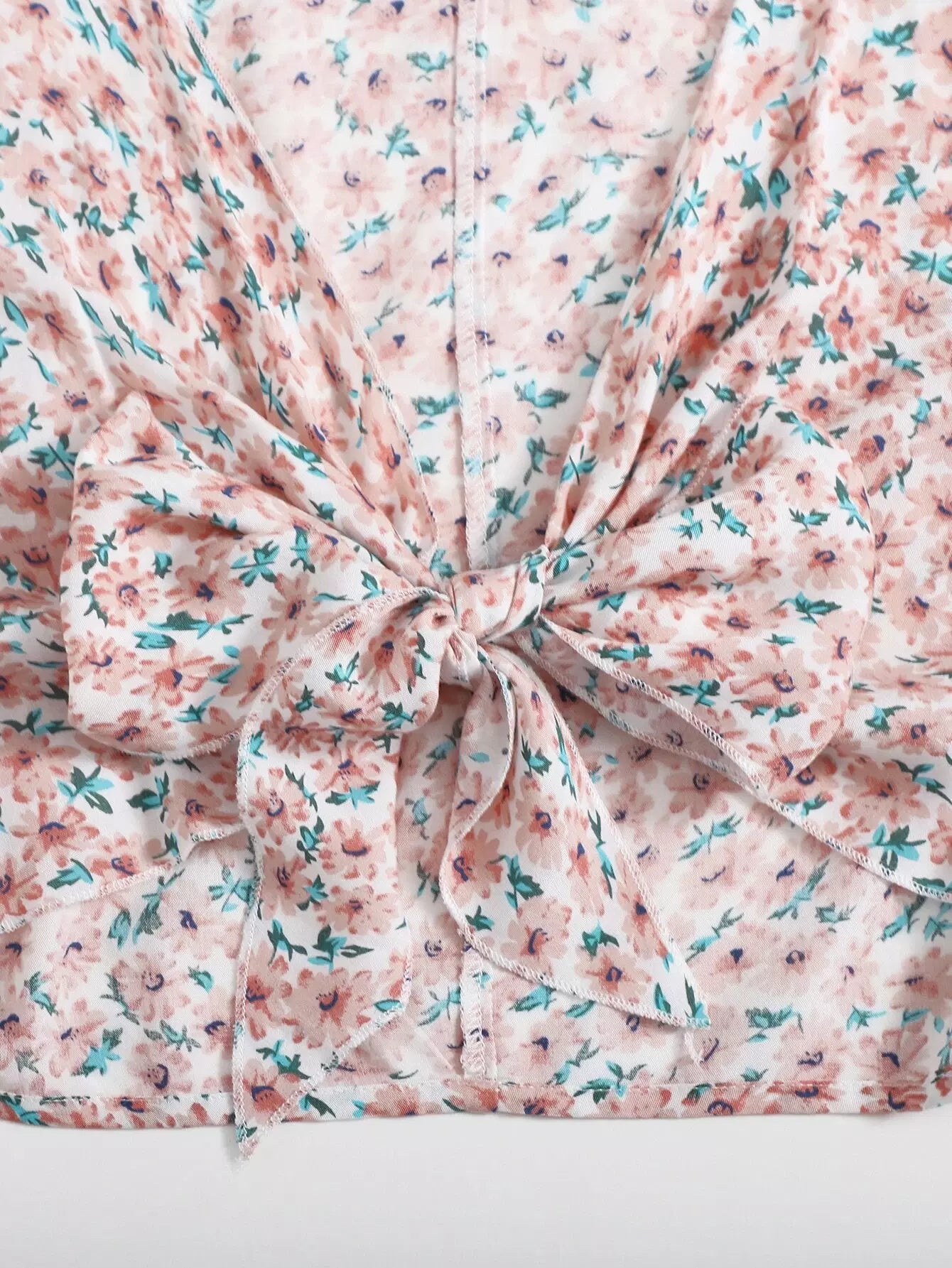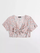 النساء - بلوزة مزينة بالزهور بربطة أمامية