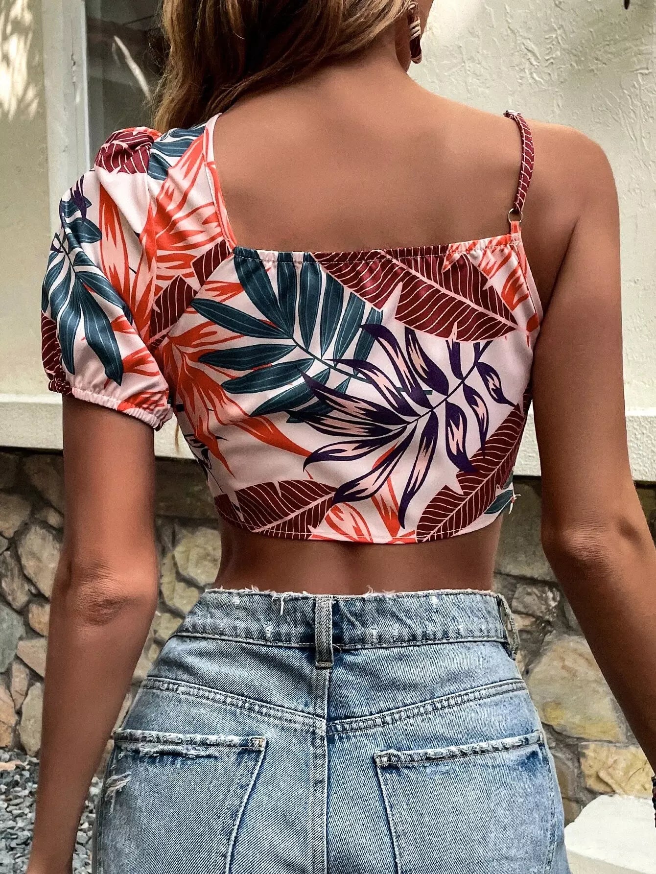 بلوزة قصيرة غير متماثلة بطبعة استوائية ملتوية من الأمام