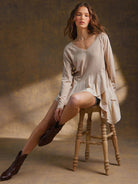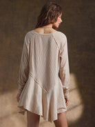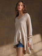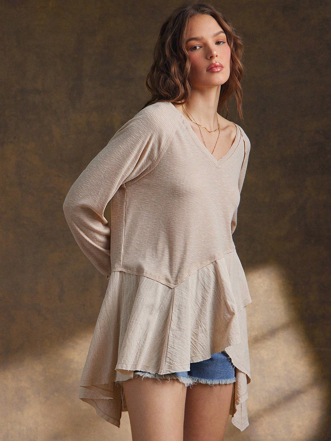 WESTFADE Western Mixed Media Slub Rib Knit & Textured Woven V Neck Exposed Seam Raw Edge Long Sleeve