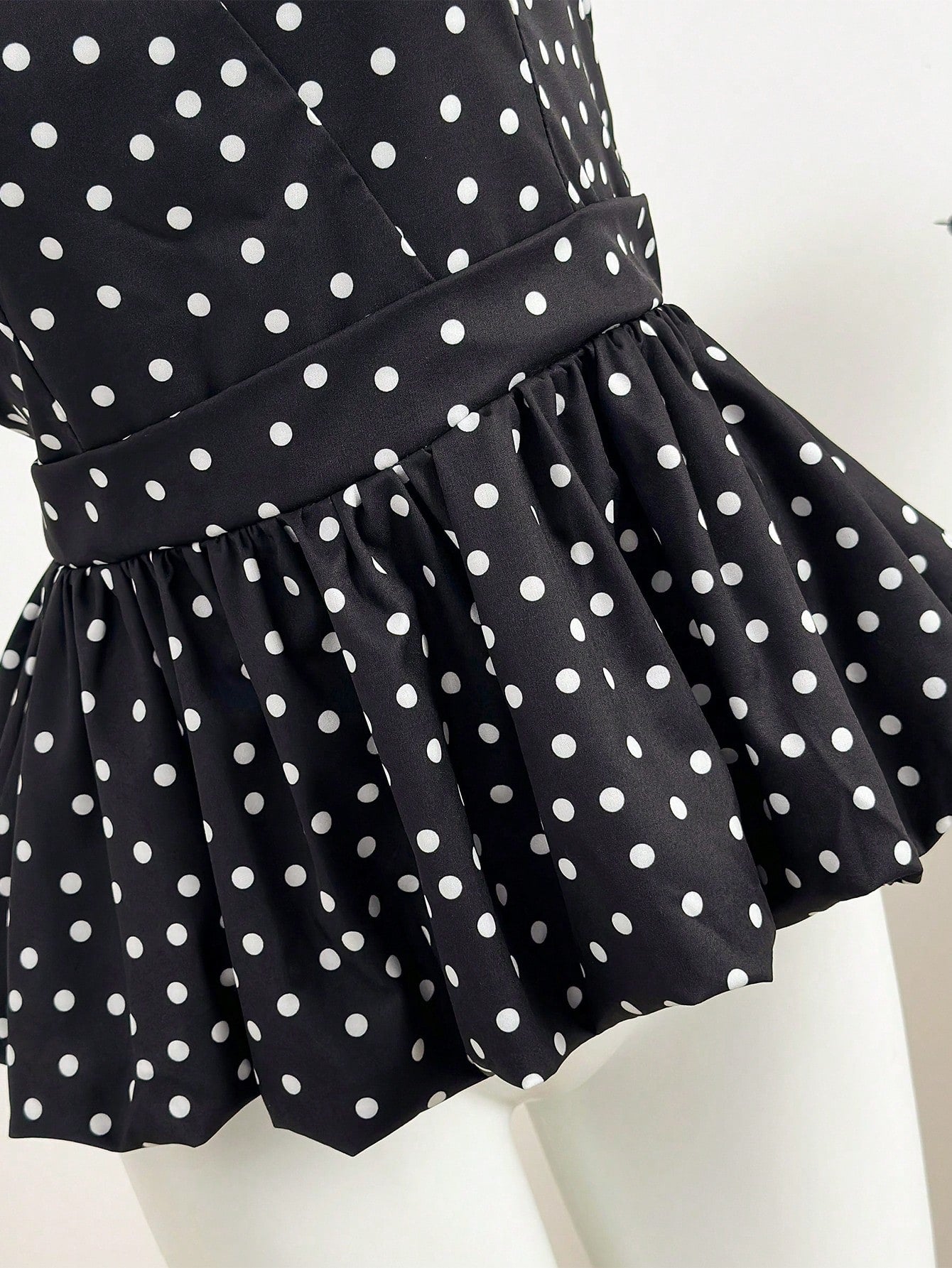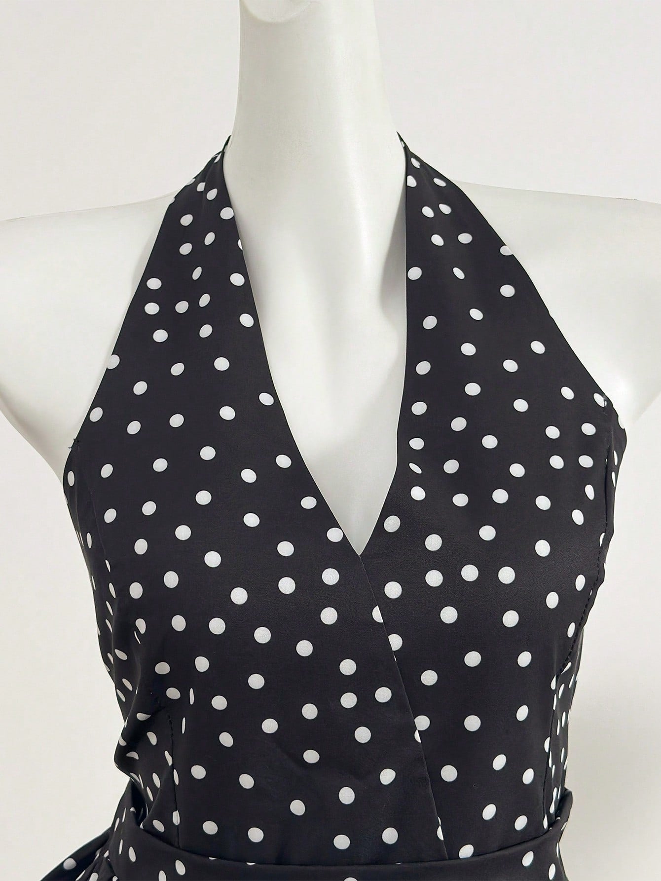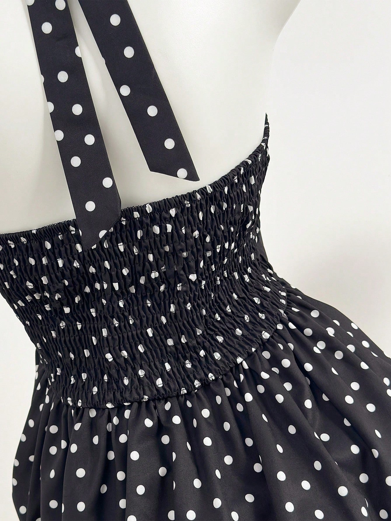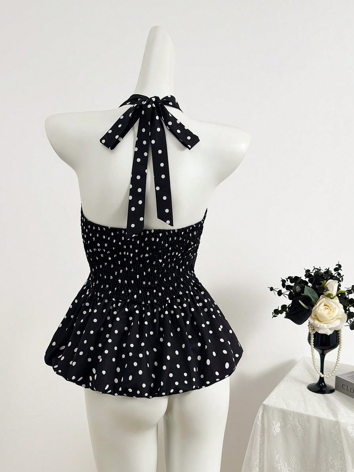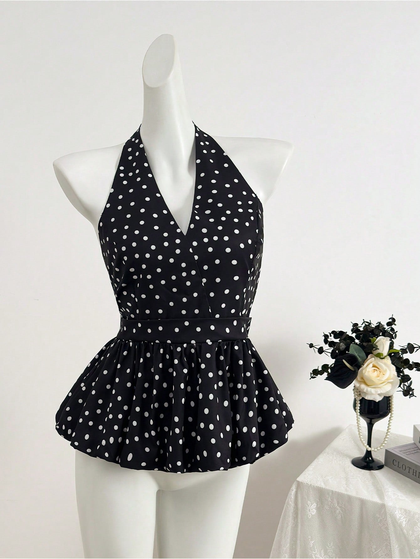 بلوزة نسائية صيفية بنقشة منقطة وحافة مكشكشة وياقة هالتر