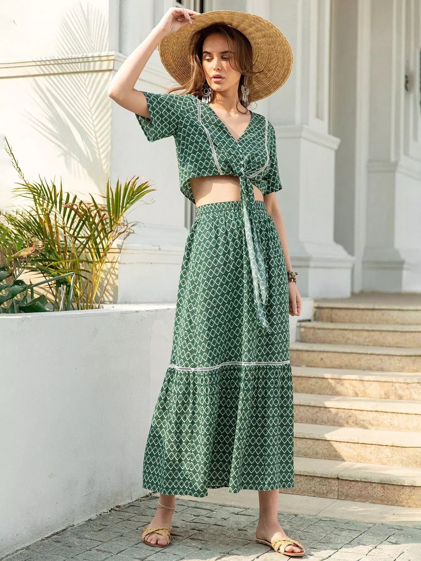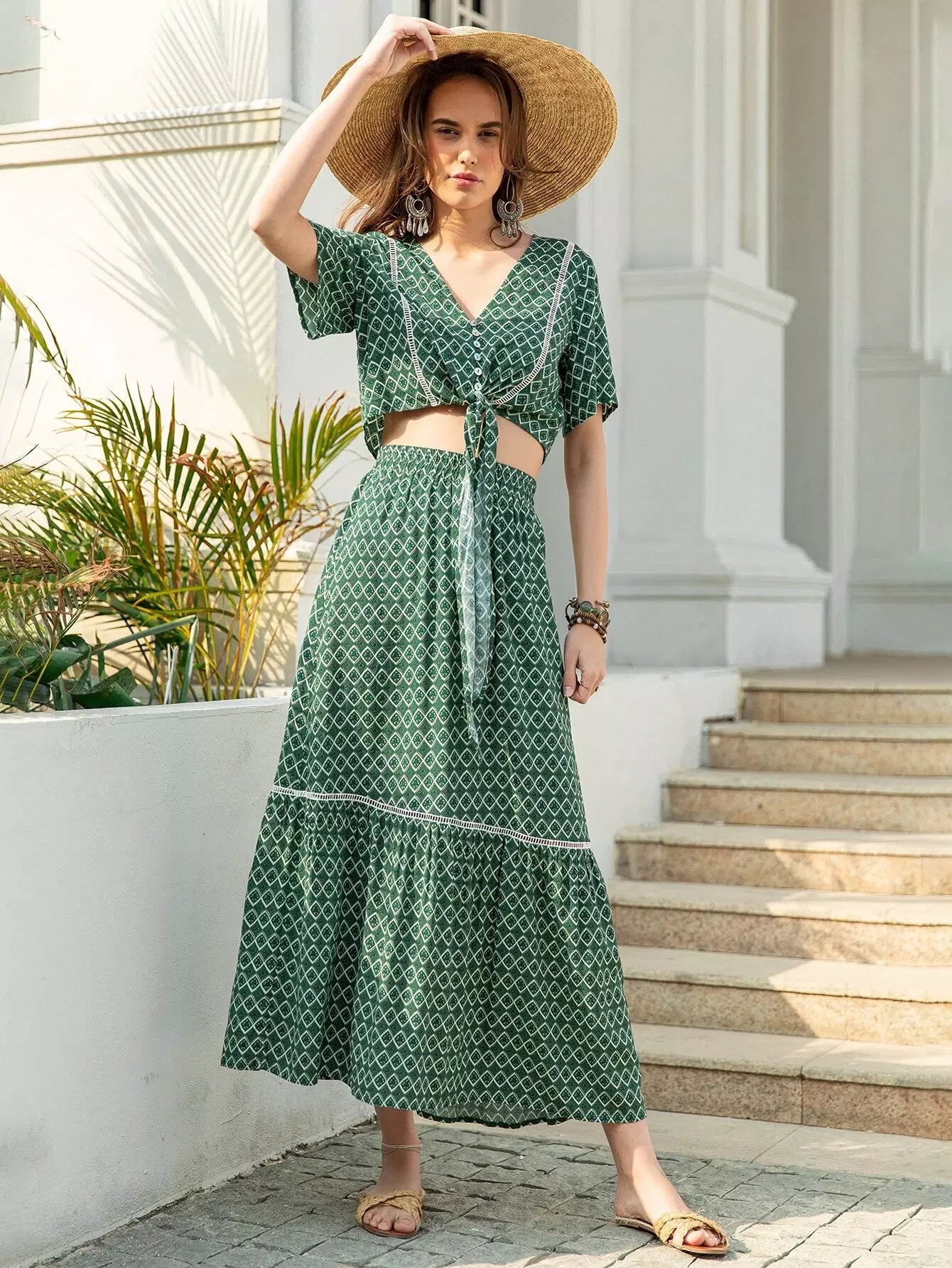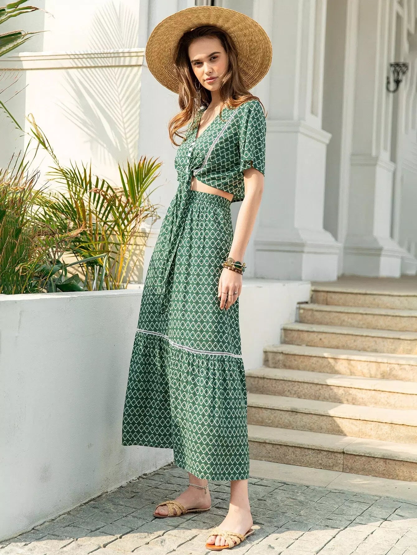طقم تنورة وقميص بطباعة كاملة وتفاصيل عقدة