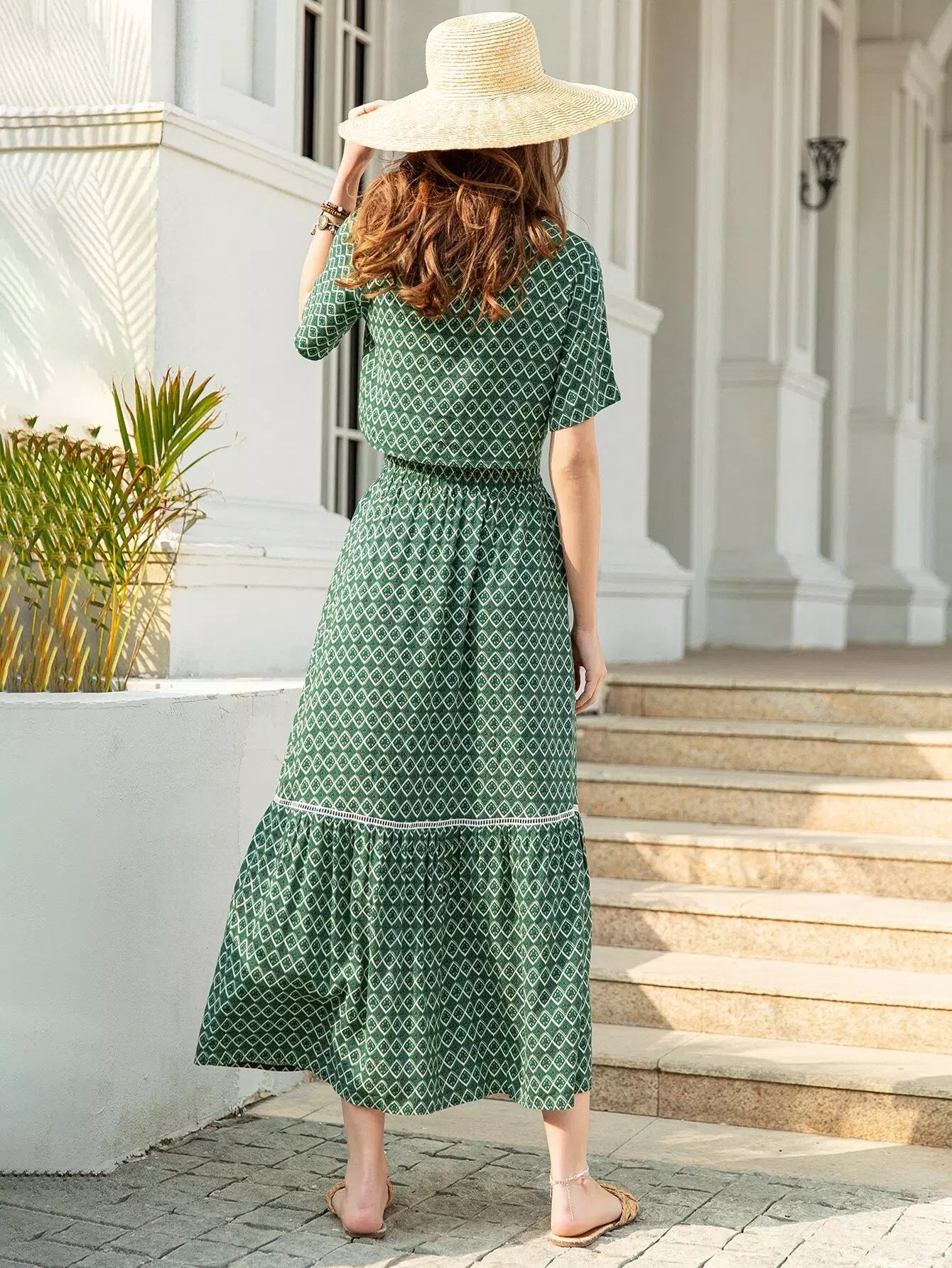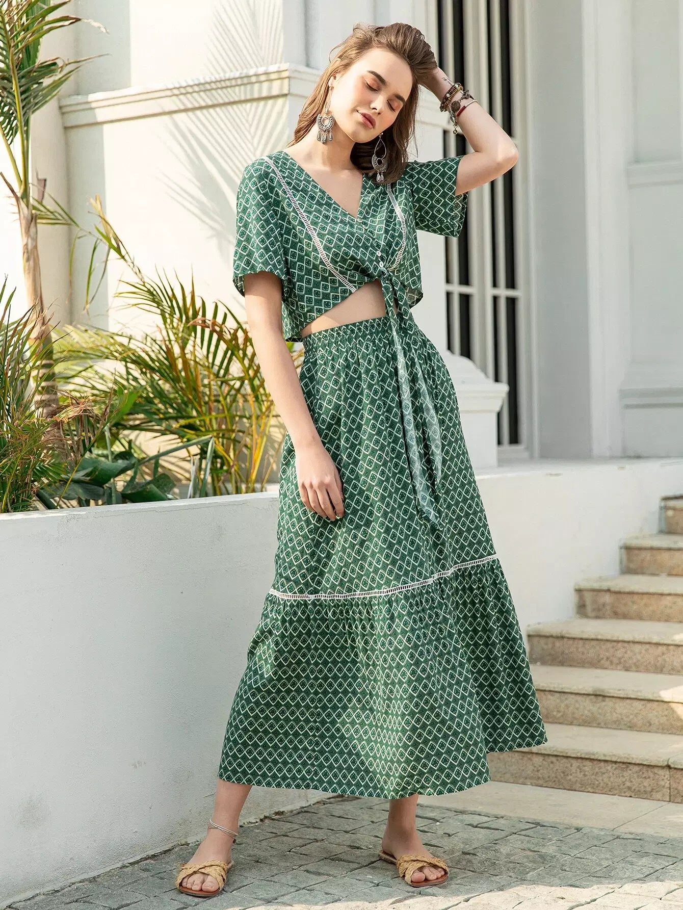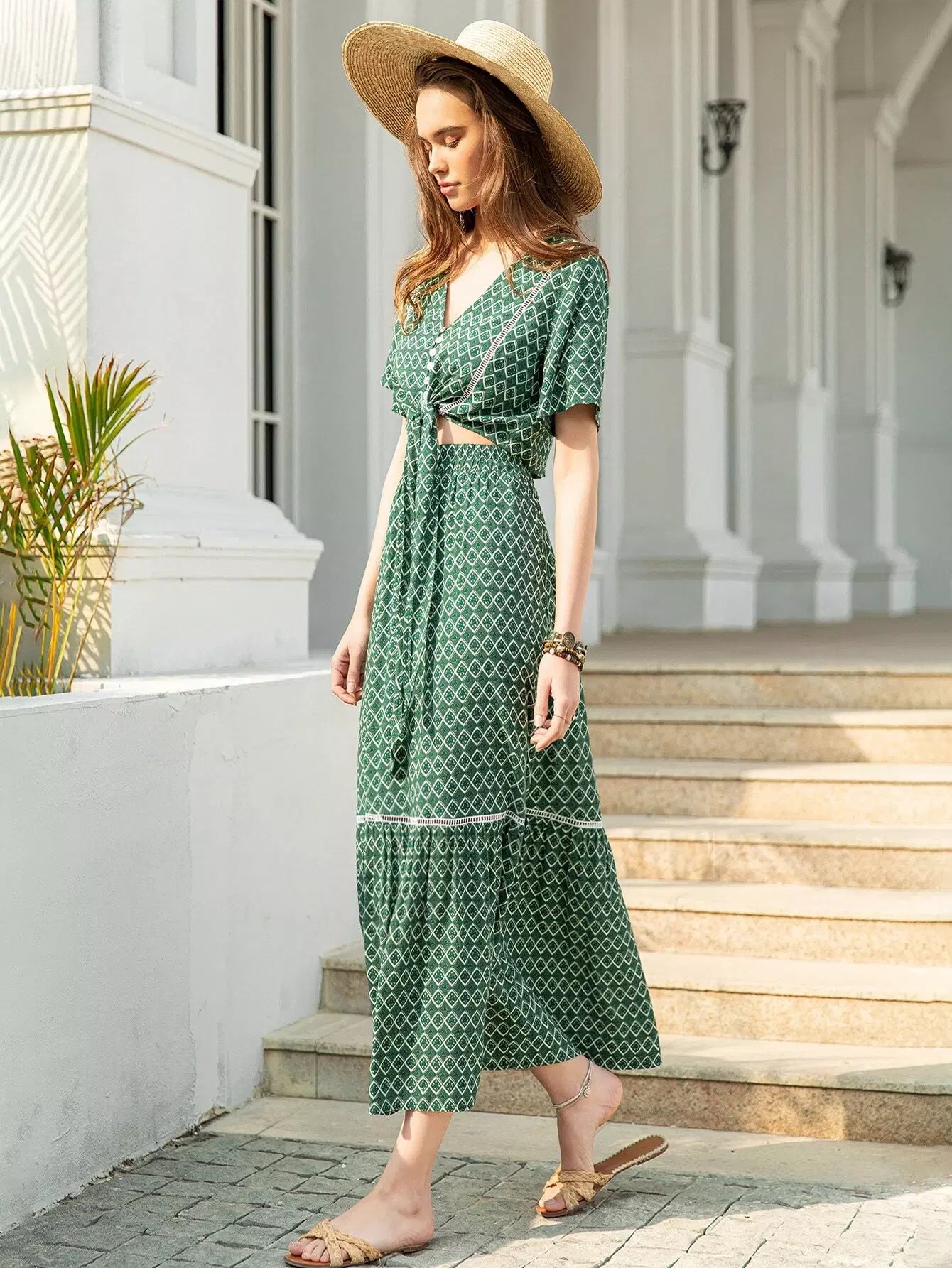 طقم تنورة وقميص بطباعة كاملة وتفاصيل عقدة