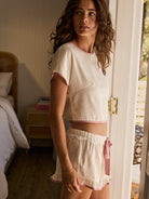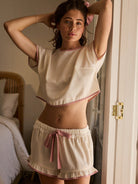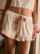 Aralina Satin Look Contrast Trim Crop Top And Ruffle Hem Short Two Pieces Sleep Set With Scrunchie