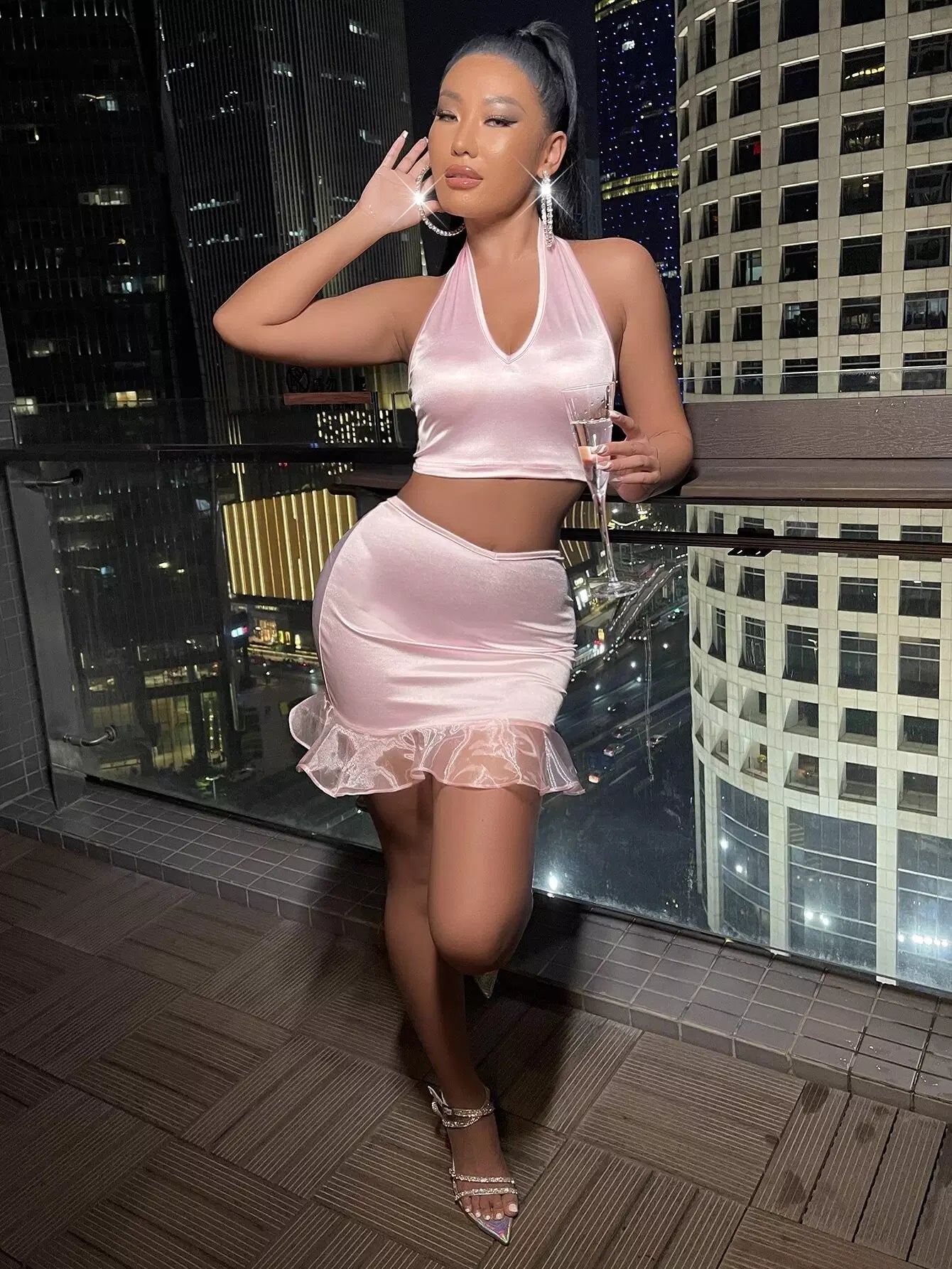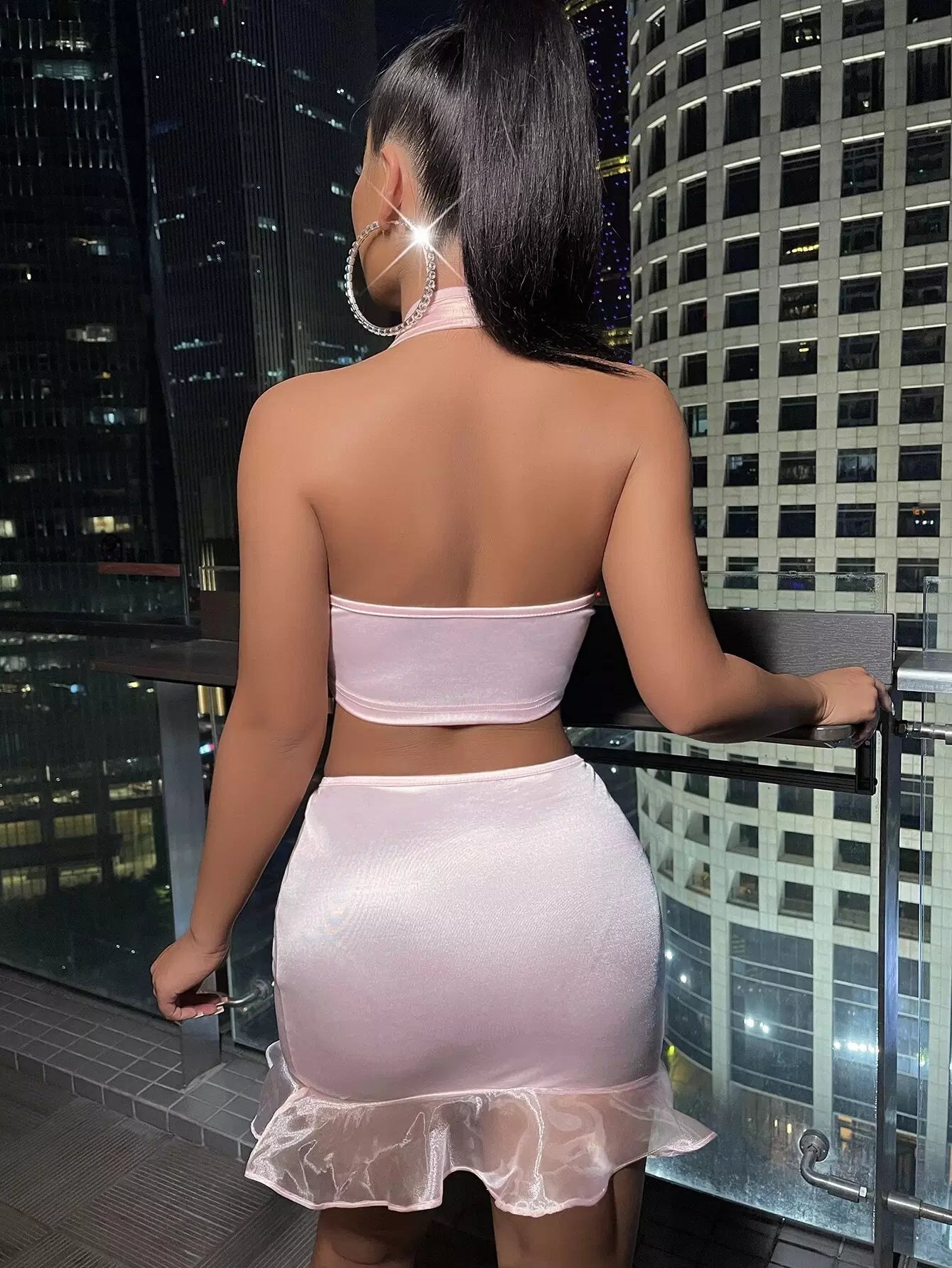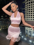 بلوزة ساتان بدون أكمام من الساتان عارية الظهر وتنورة بوديكون بحافة شبكية مكشكشة