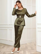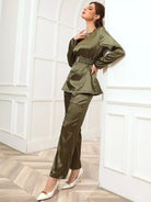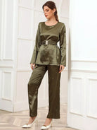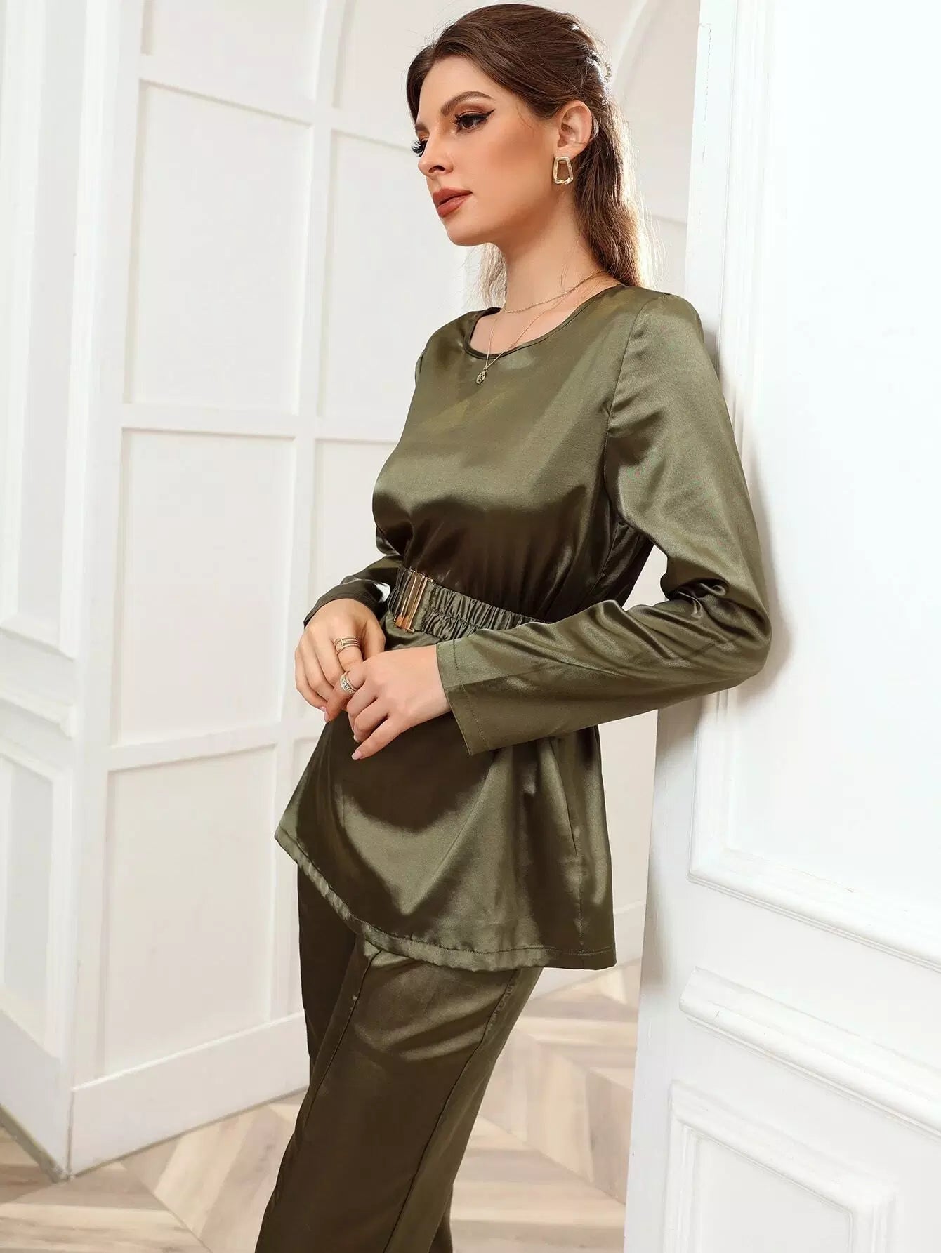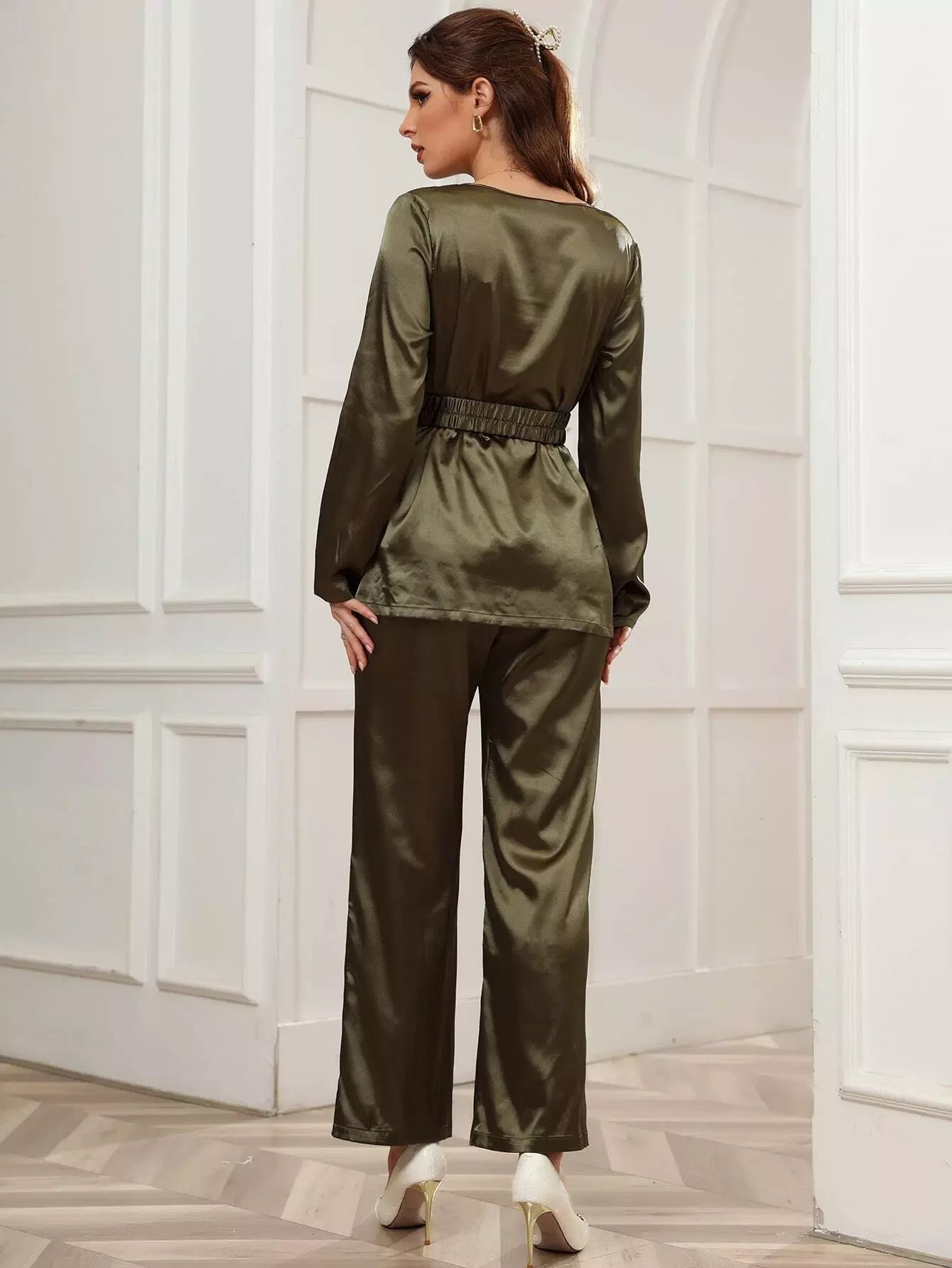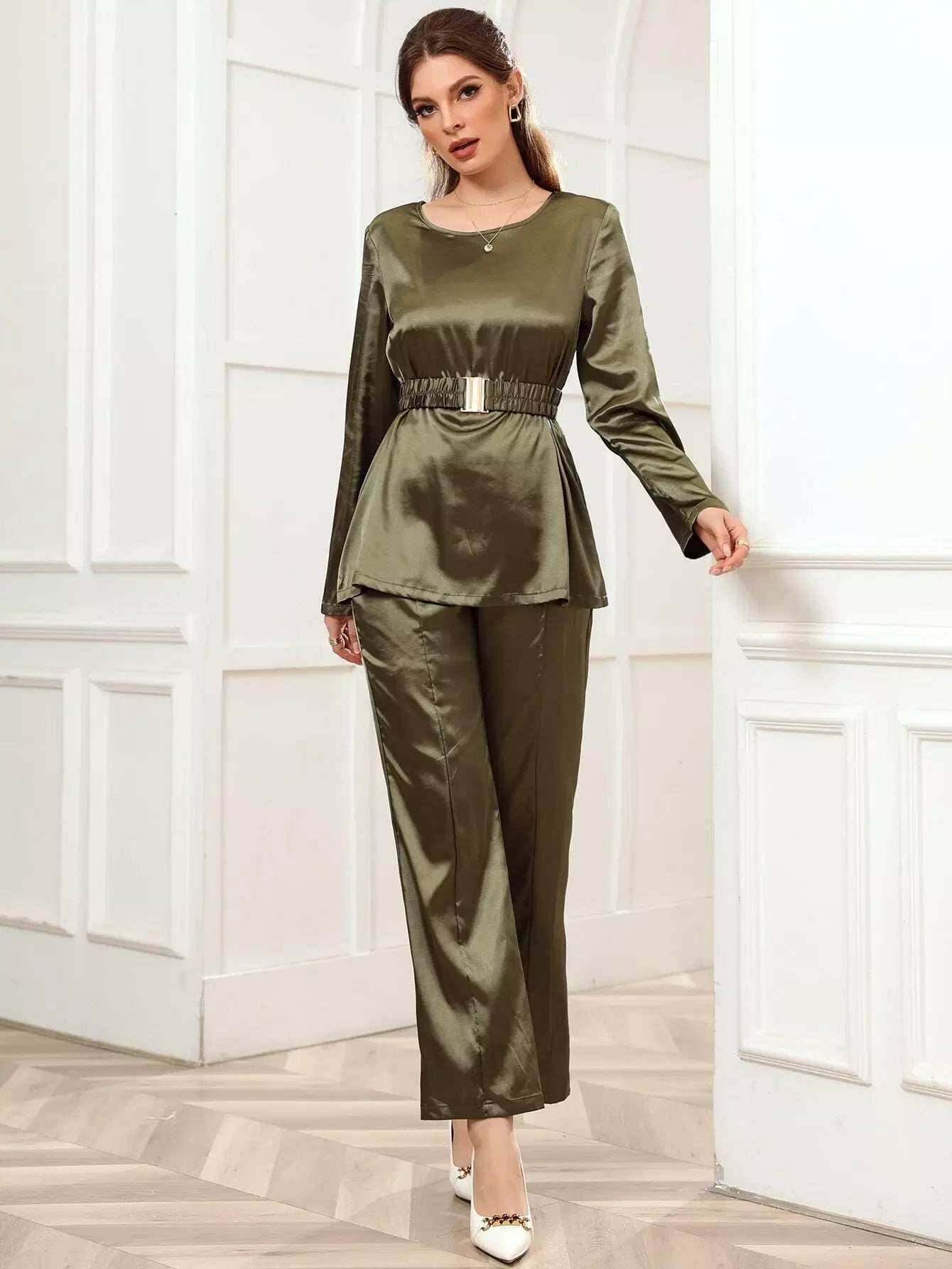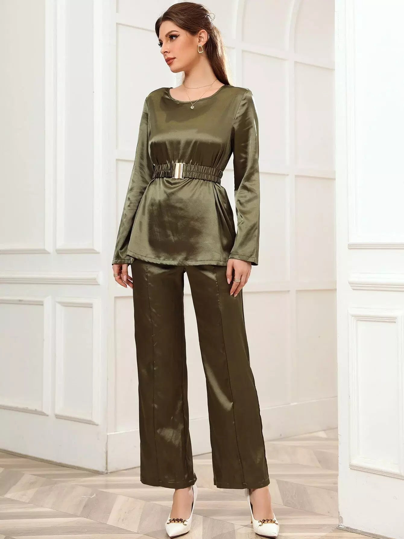 بلوزة ستان وبنطلون واسع الساق بدون حزام