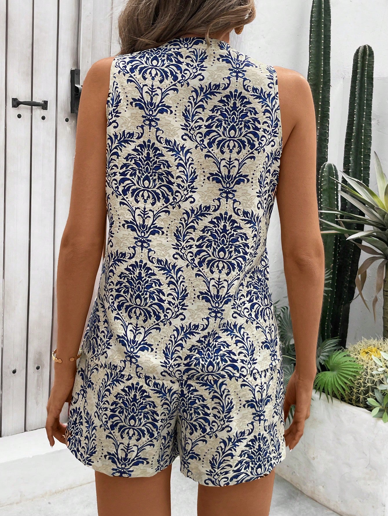 طقم صيفي نسائي من قطعتين من بريزايا، يتكون من قميص بدون أكمام وشورت مطبوع من الساتان، مناسب لفصل الصيف.