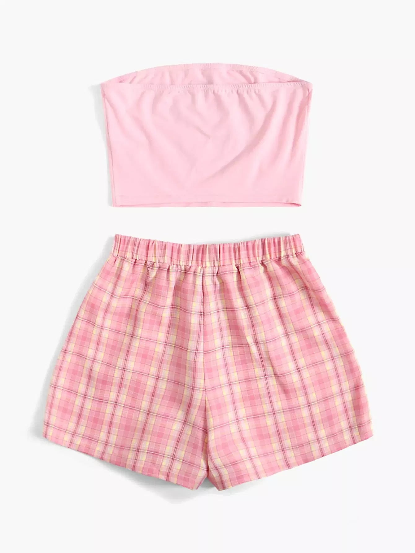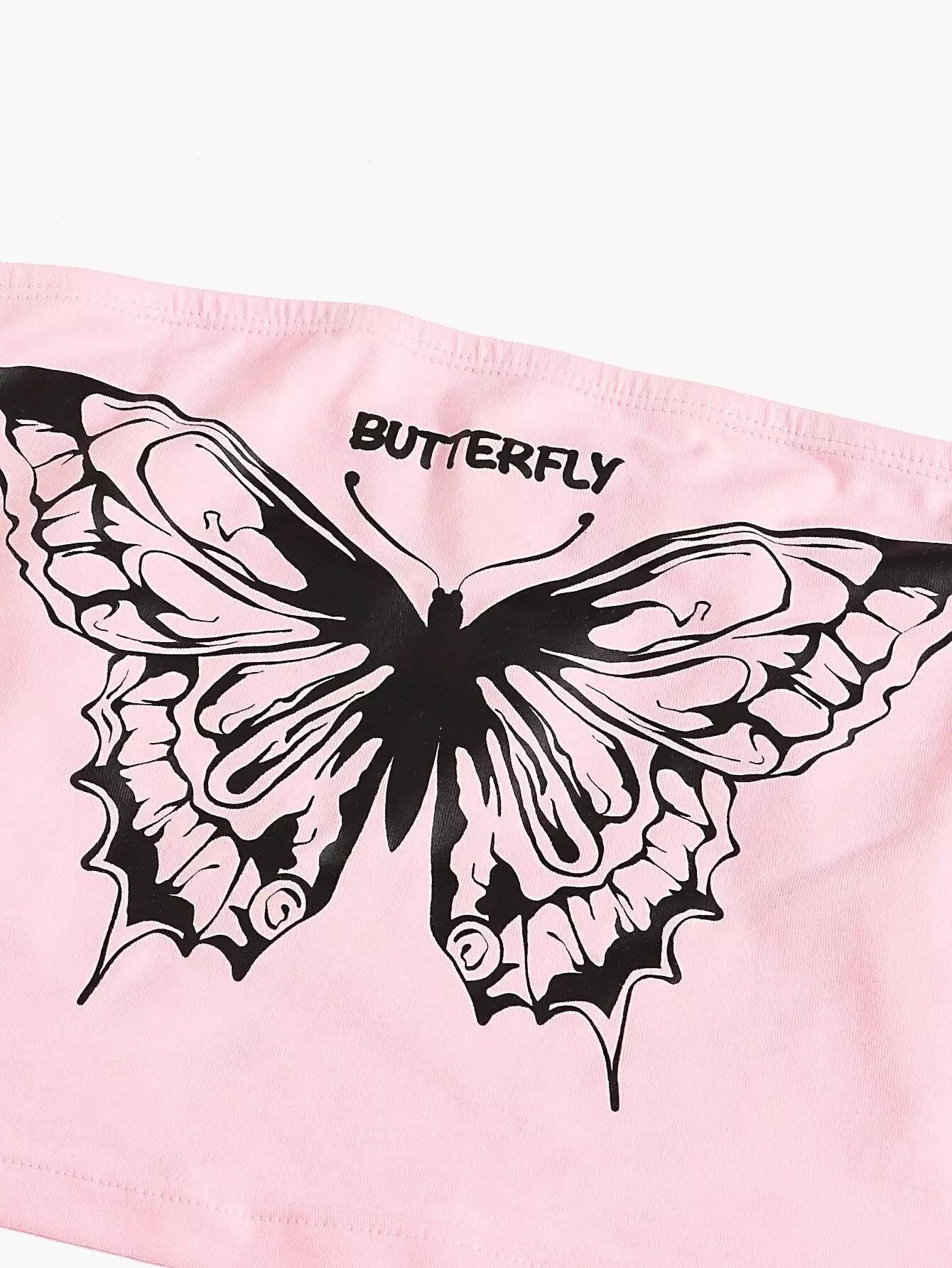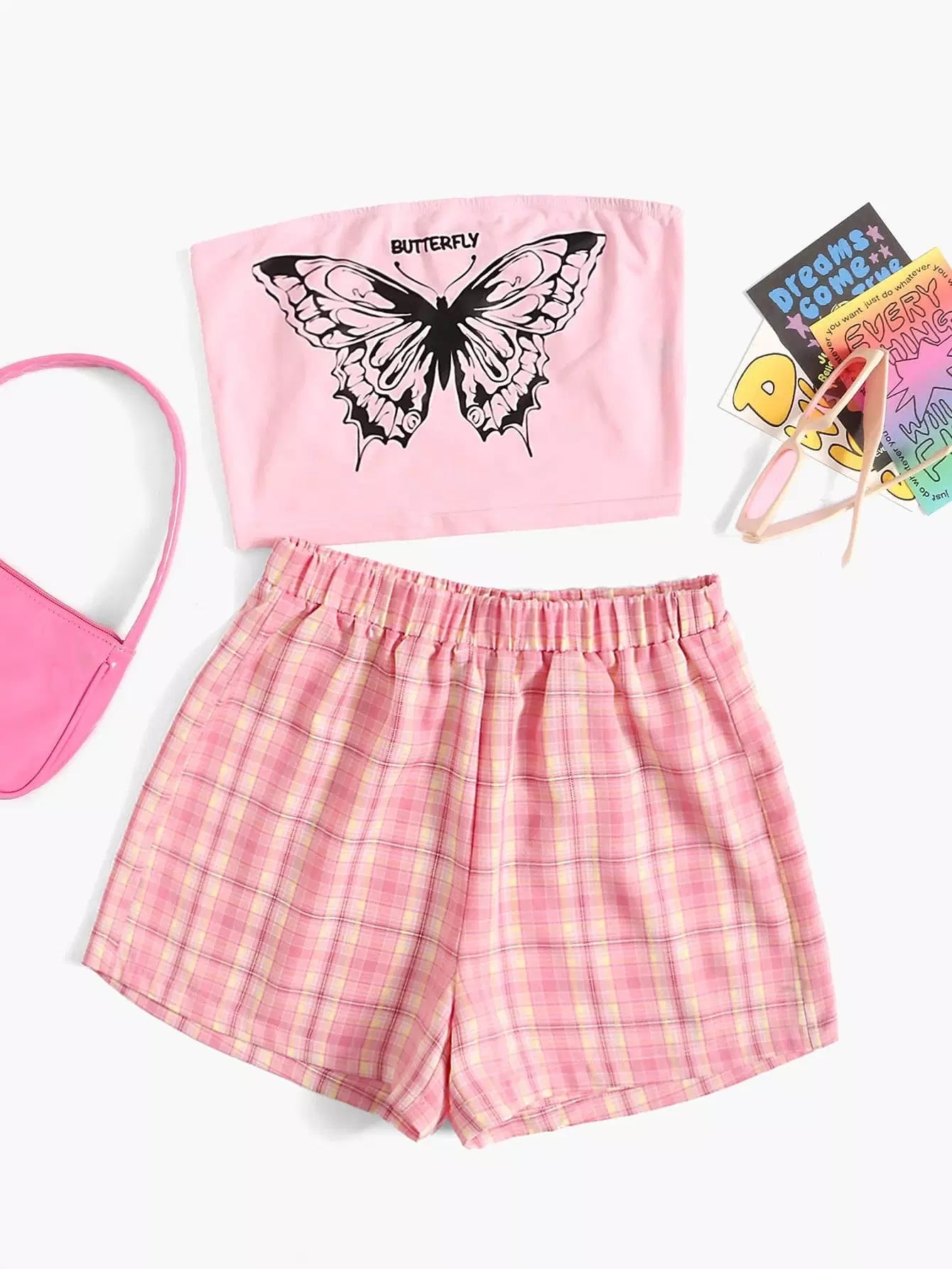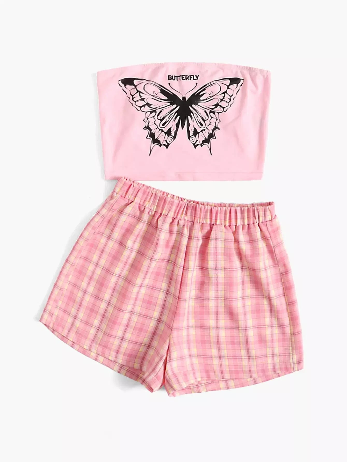 بلوزة أنبوبي برسومات فراشة ورسومات حروف وشورت بطبعة تارتان