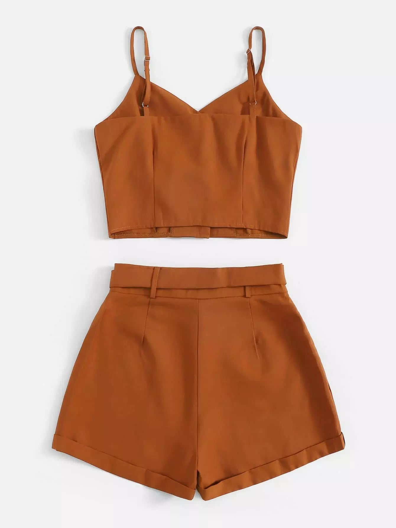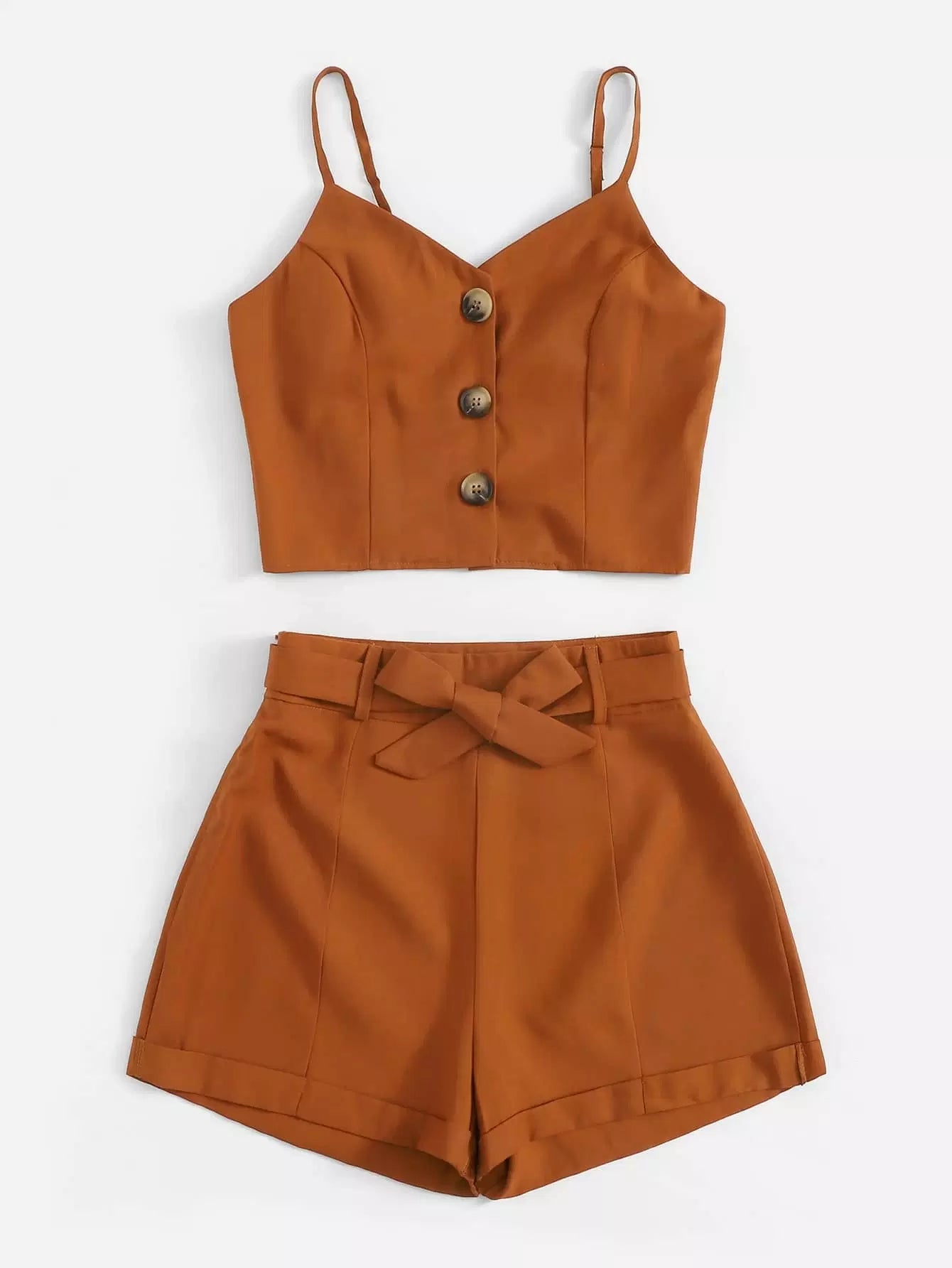 قميص كامي بأزرار أمامية وشورت بحاشية ملفوفة بدون حزام