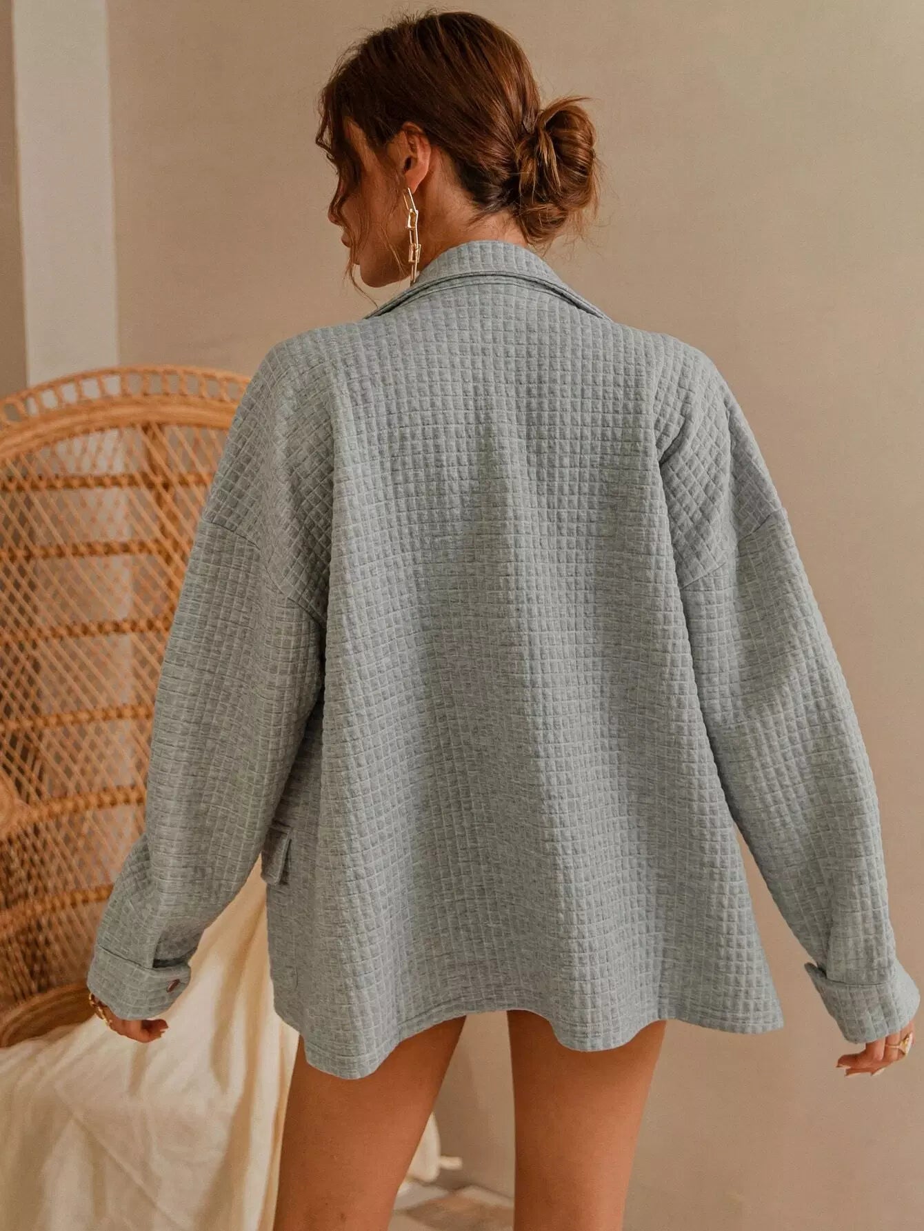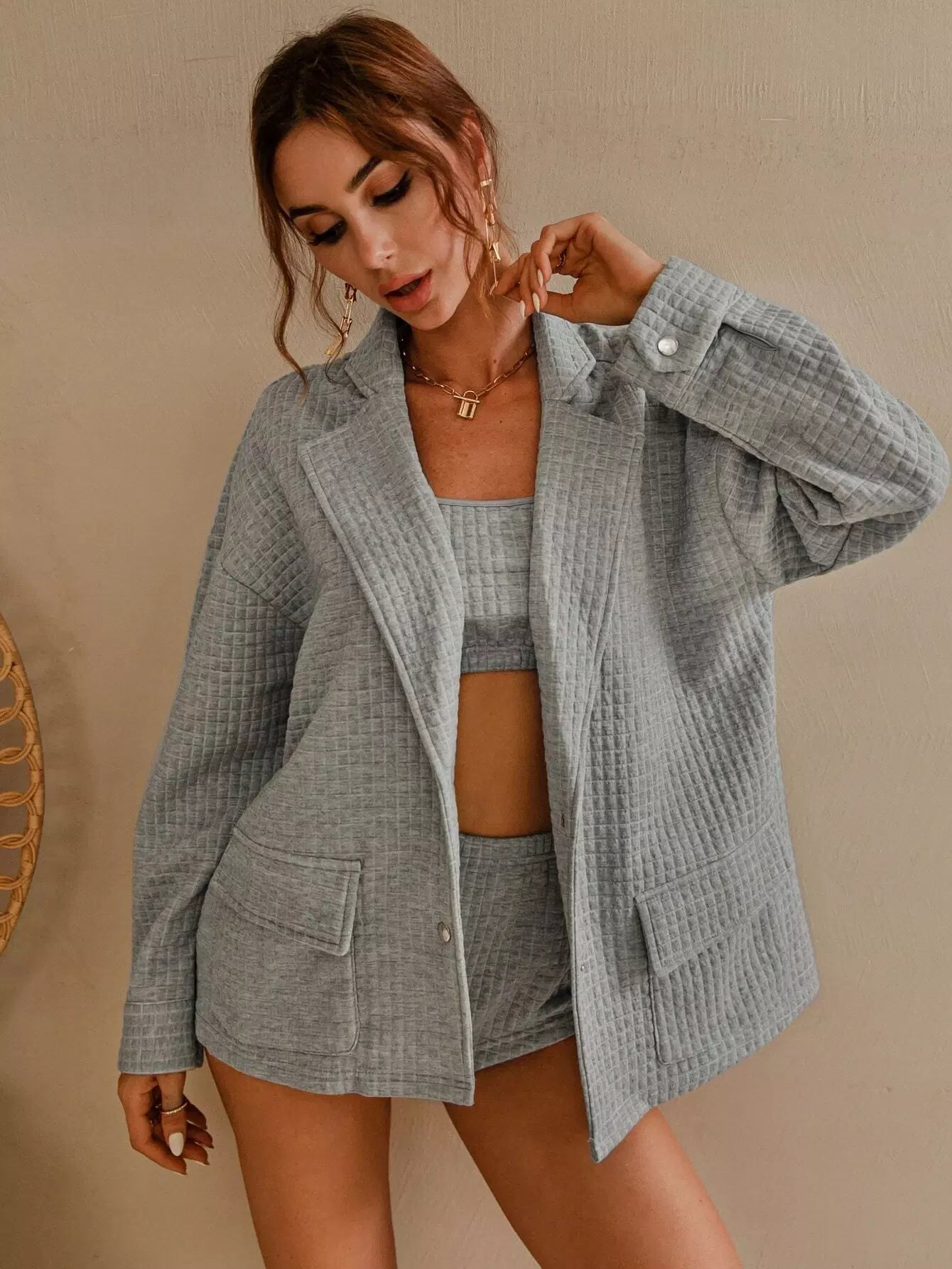 طقم بلوزة وشورت كبير الحجم مبطن بأزرار من الأمام مع قميص قصير