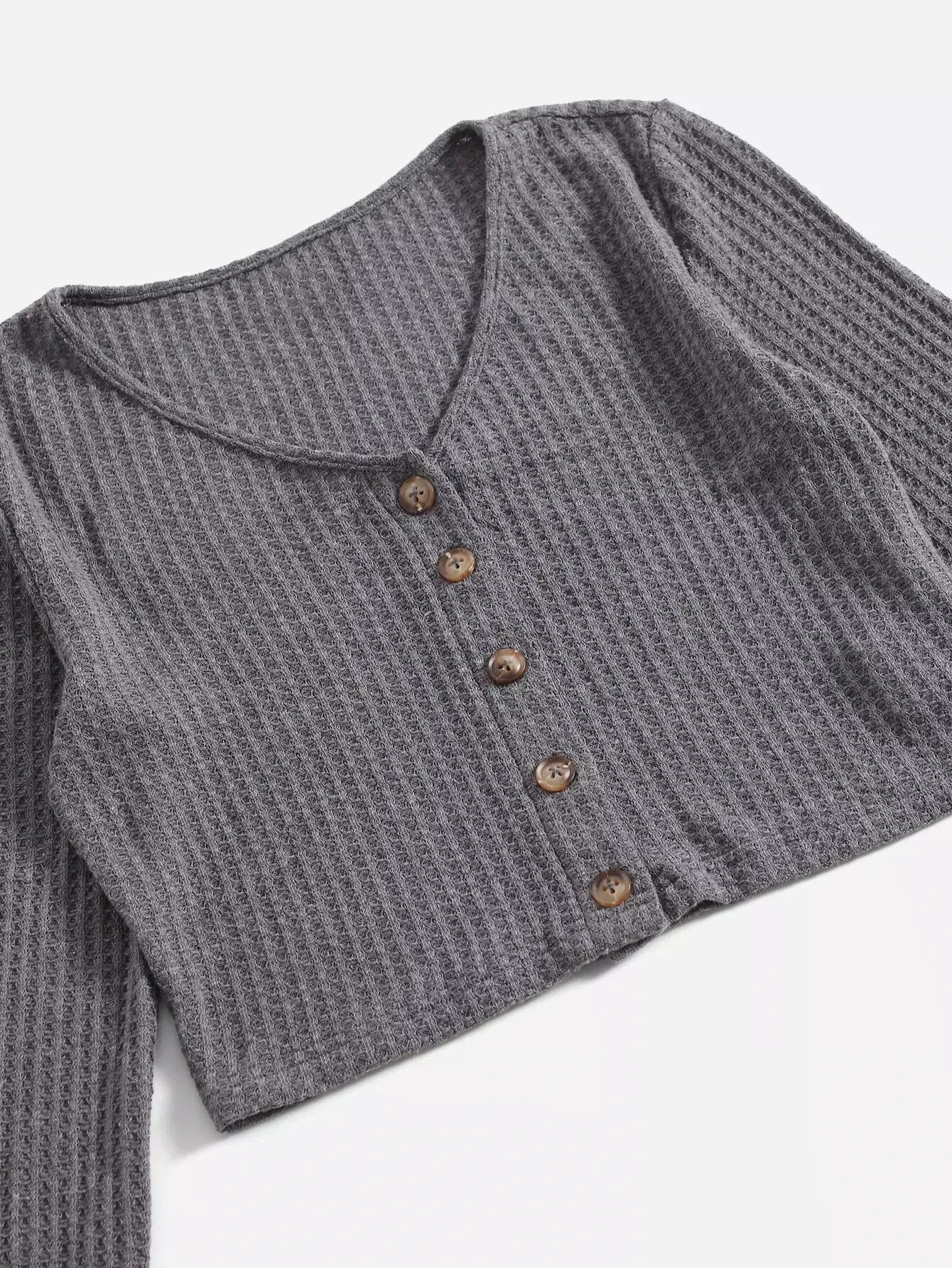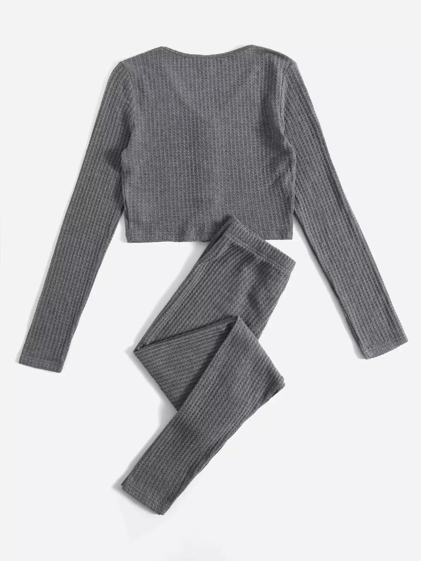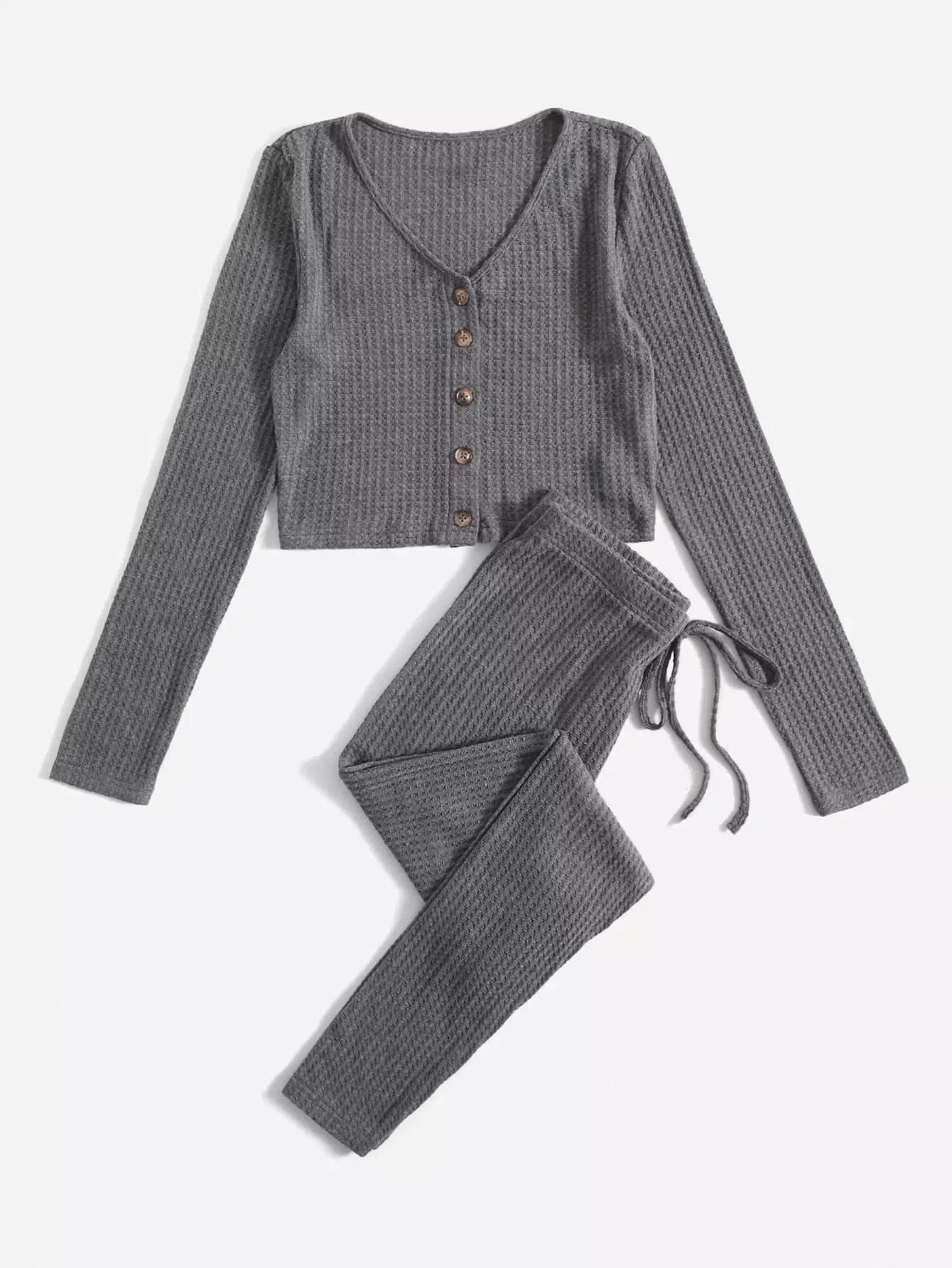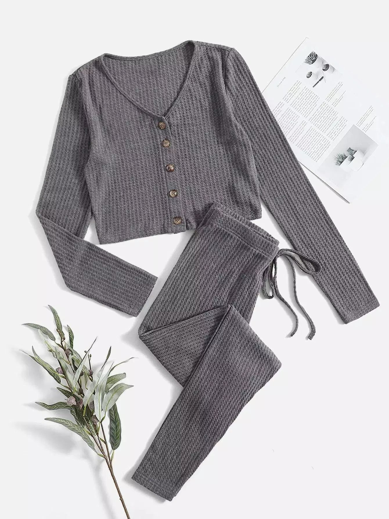 طقم تي شيرت بأزرار أمامية وسروال ضيق
