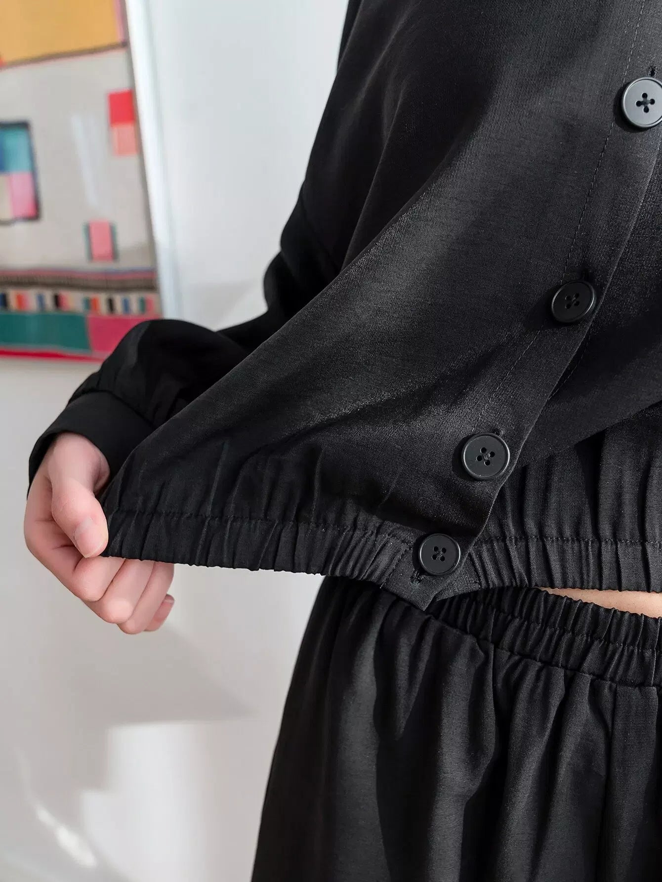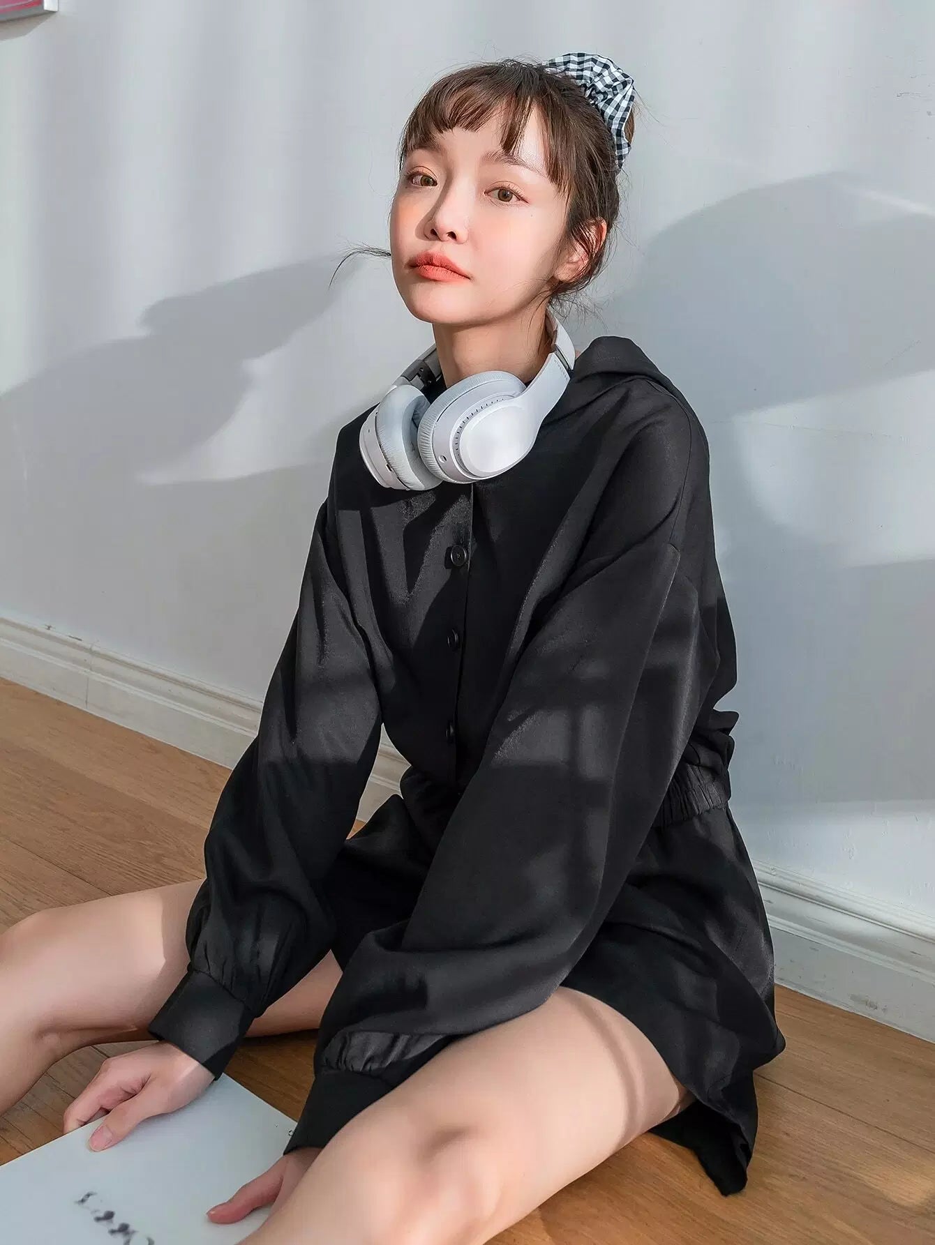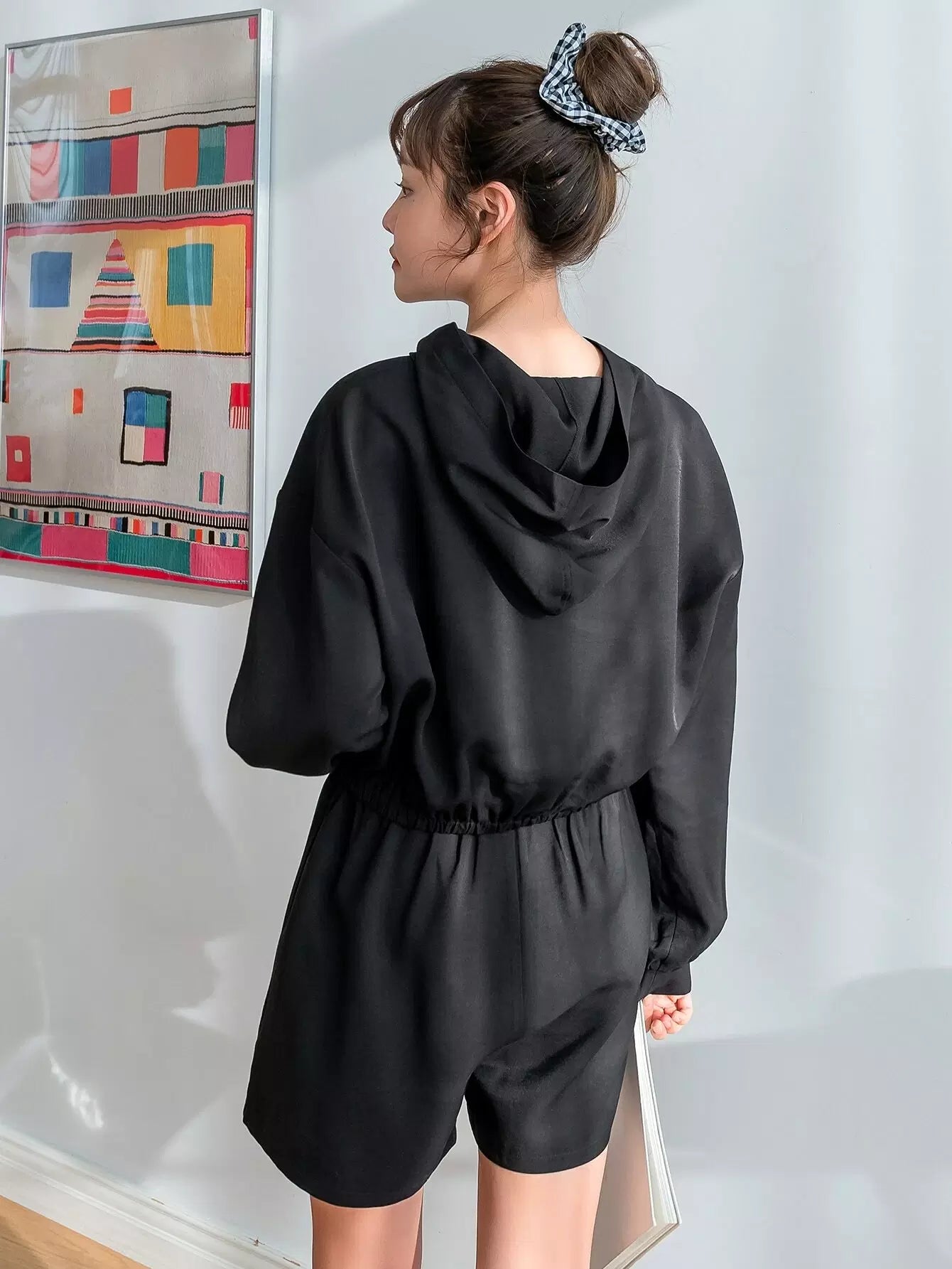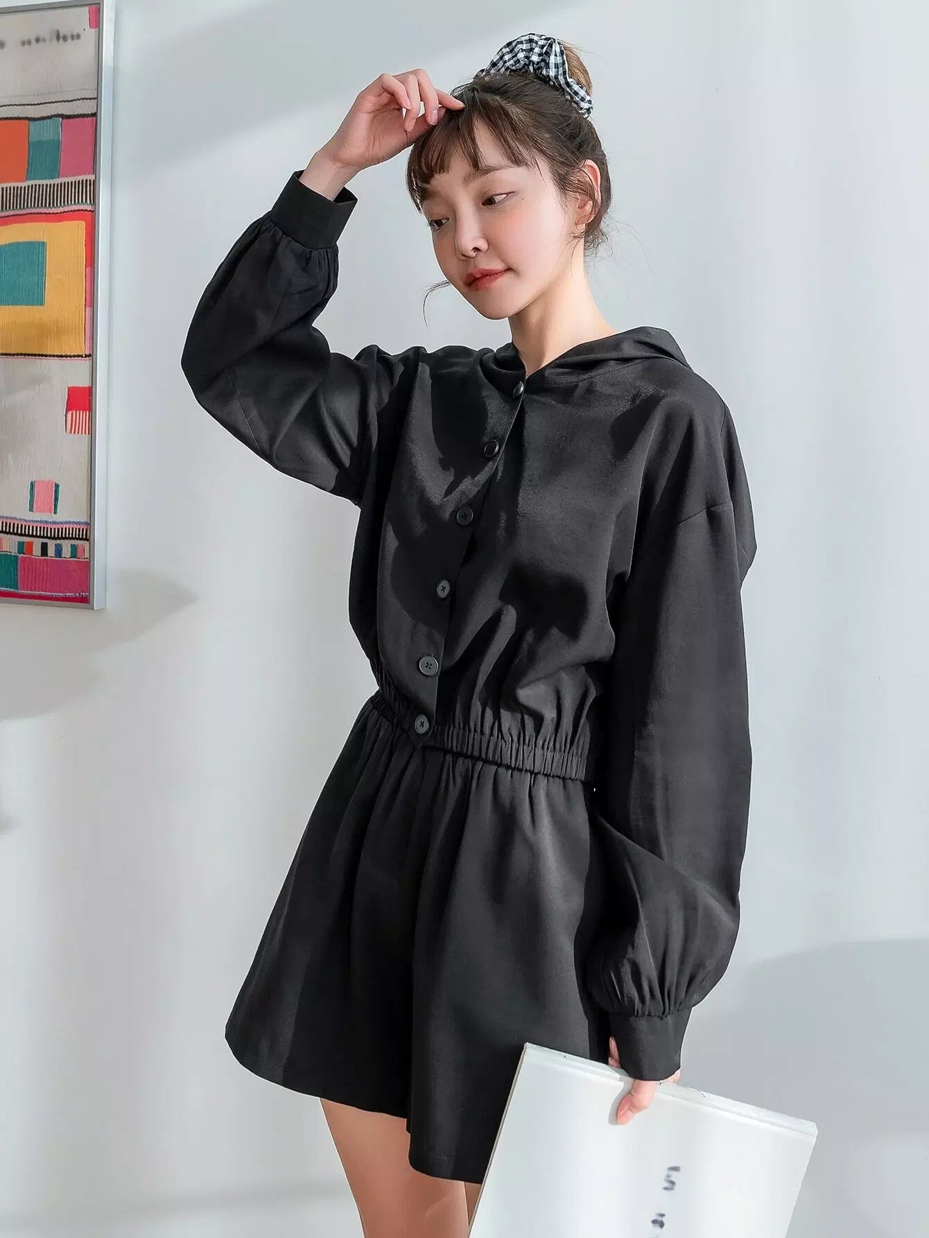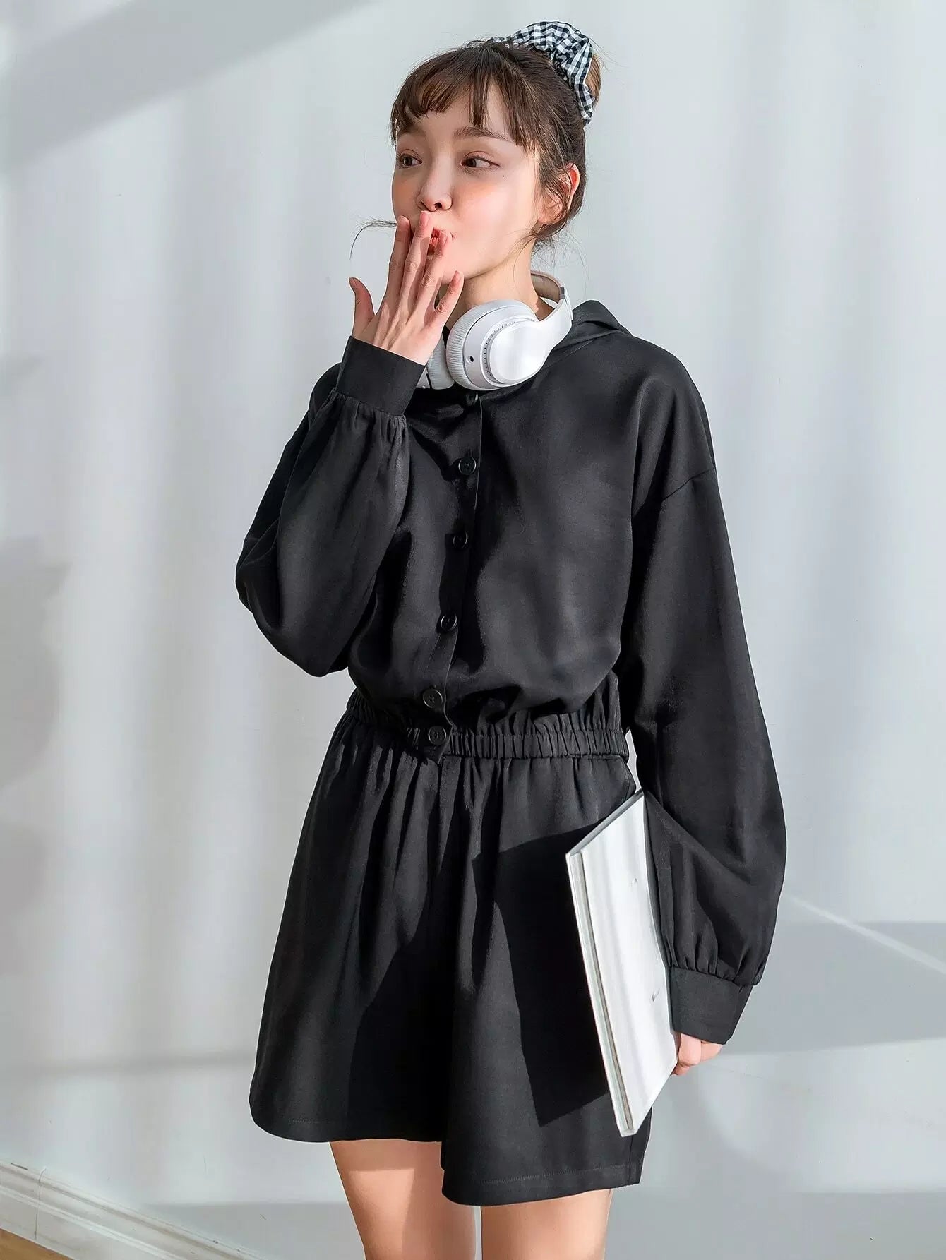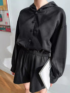 سترة بغطاء رأس وأكتاف منسدلة وأزرار مع شورت